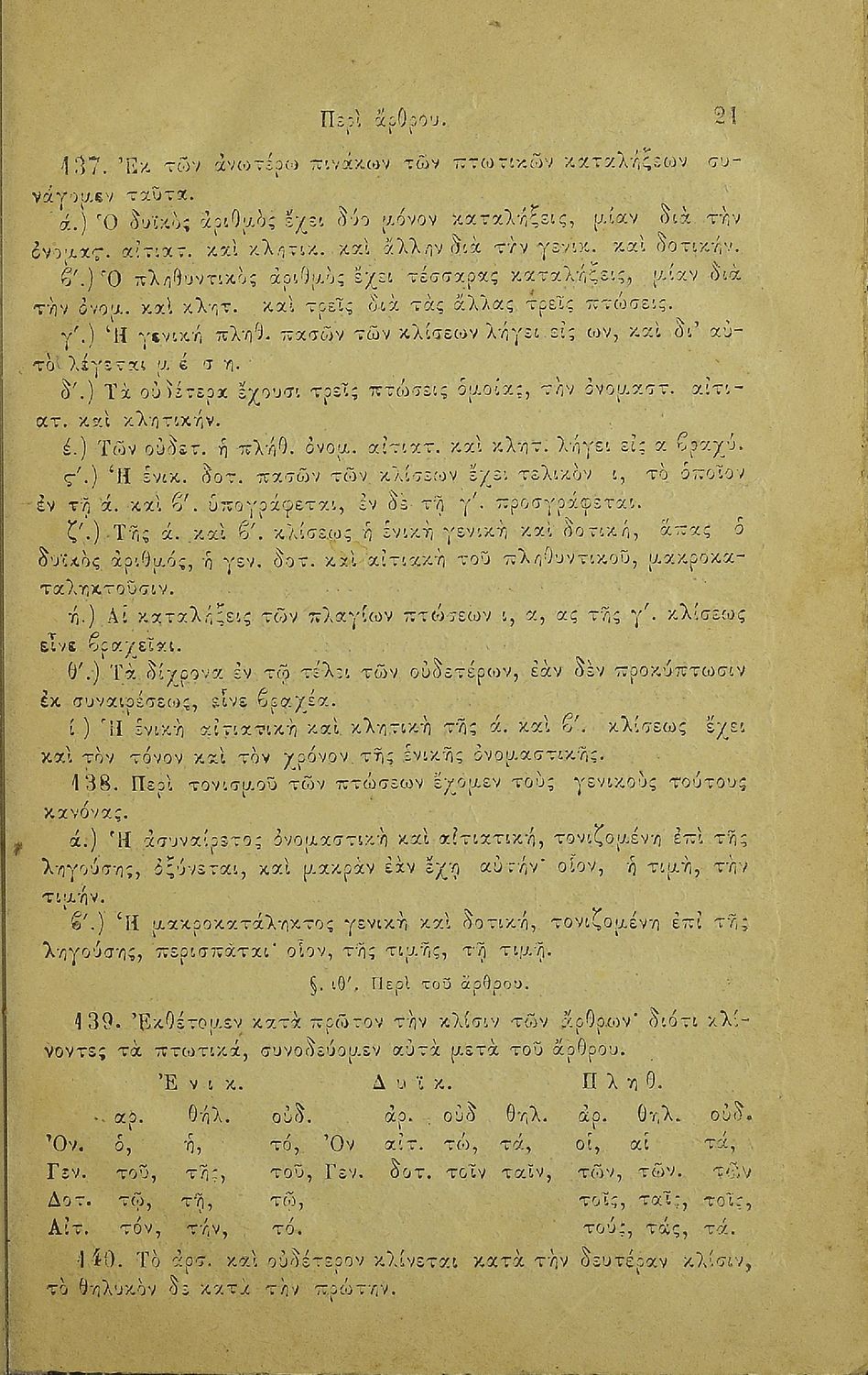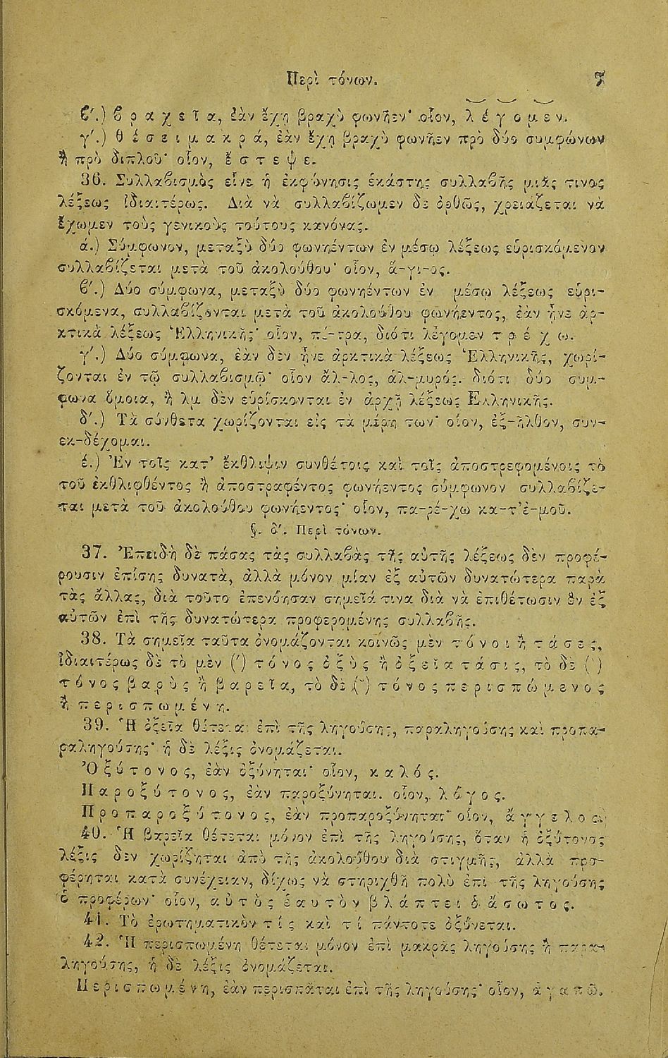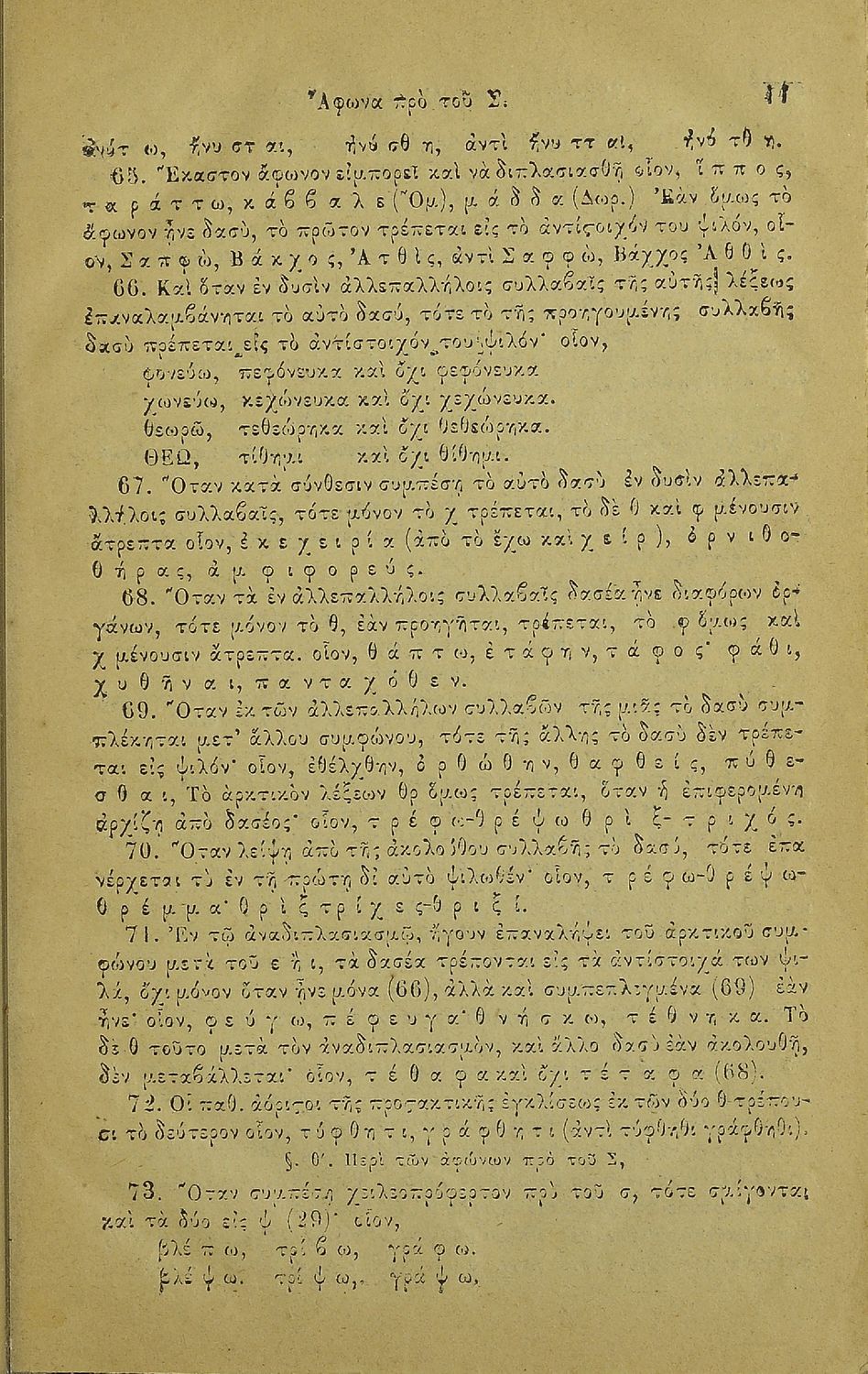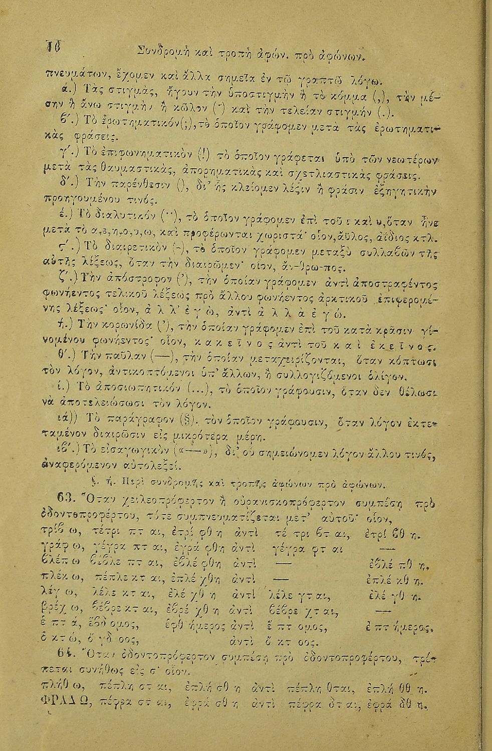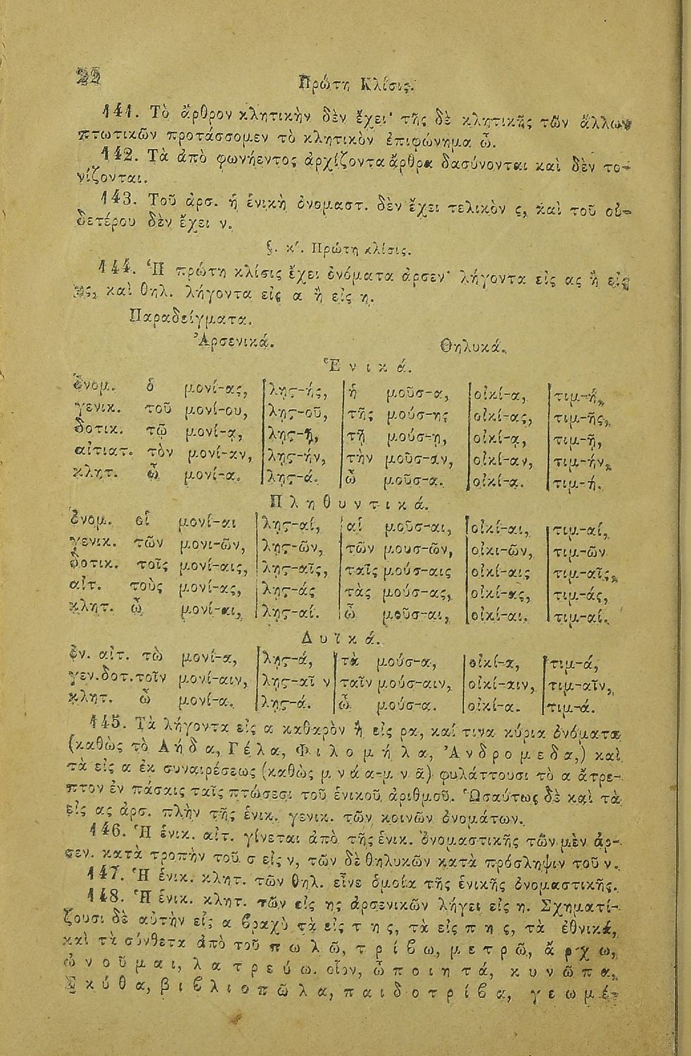 Σχολικό εγχειρίδιο Αρχαίων Ελληνικών για τα Ελληνικά Σχολεία και Παρθεναγωγεία που περιέχει τους κανόνες γραμματικής και είναι χωρισμένο σε φθογγολογικό, τυπολογικό και ετυμολογικό μέρος.