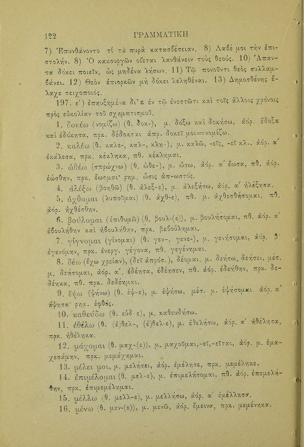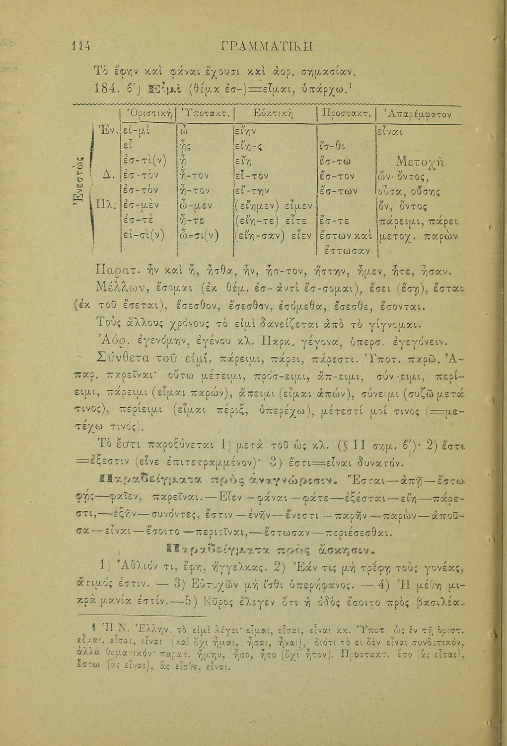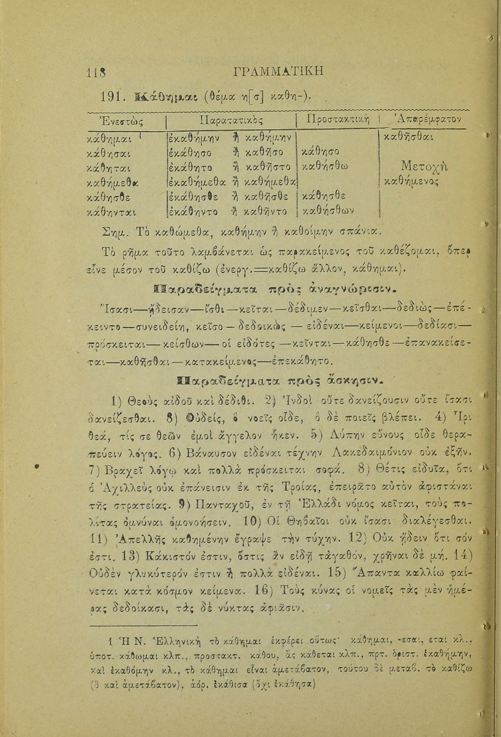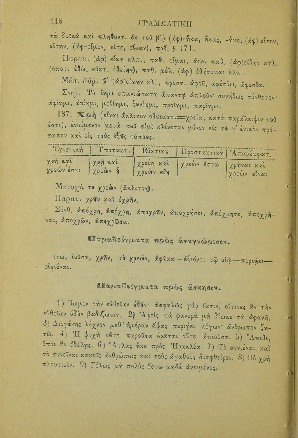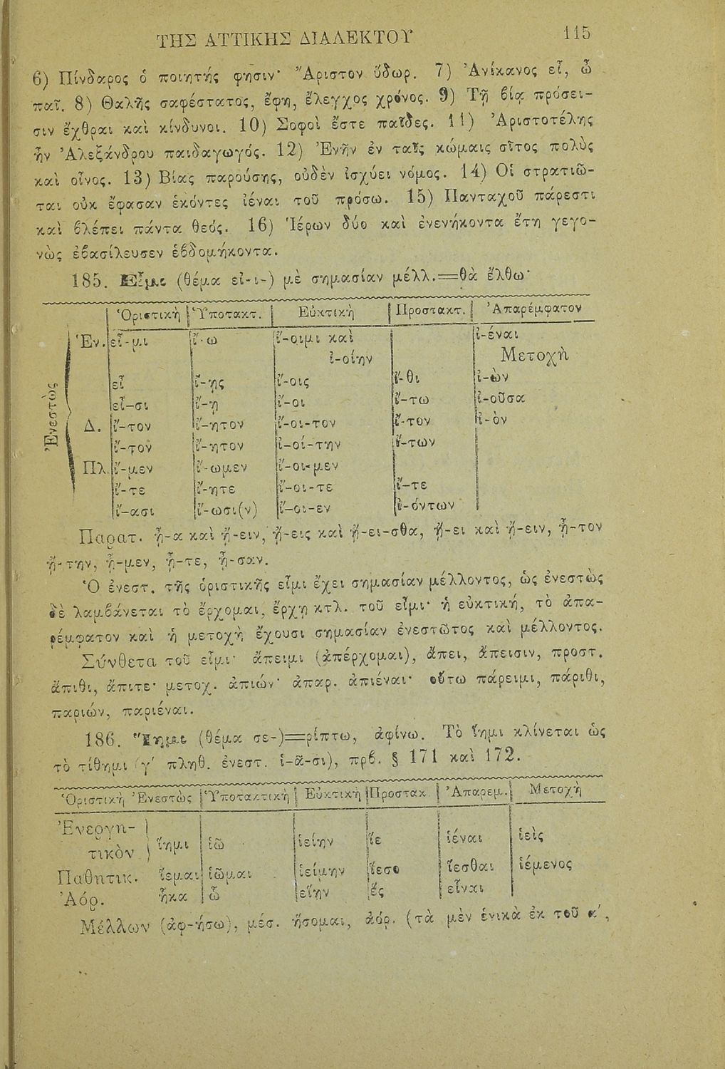 Βαθμίδα εκπαίδευσης: Δευτεροβάθμια Τάξη: Ελληνικό Σχολείο Μάθημα: Αρχαία Ελληνικά Γλώσσα: Καθαρεύουσα Παρουσίαση περιεχομένου: Σχολικό εγχειρίδιο Αρχαίων Ελληνικών που περιλαμβάνει τους κανόνες της γραμματικής και του συντακτικού της αττικής διαλέκτου. |