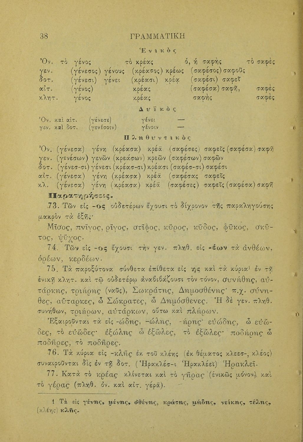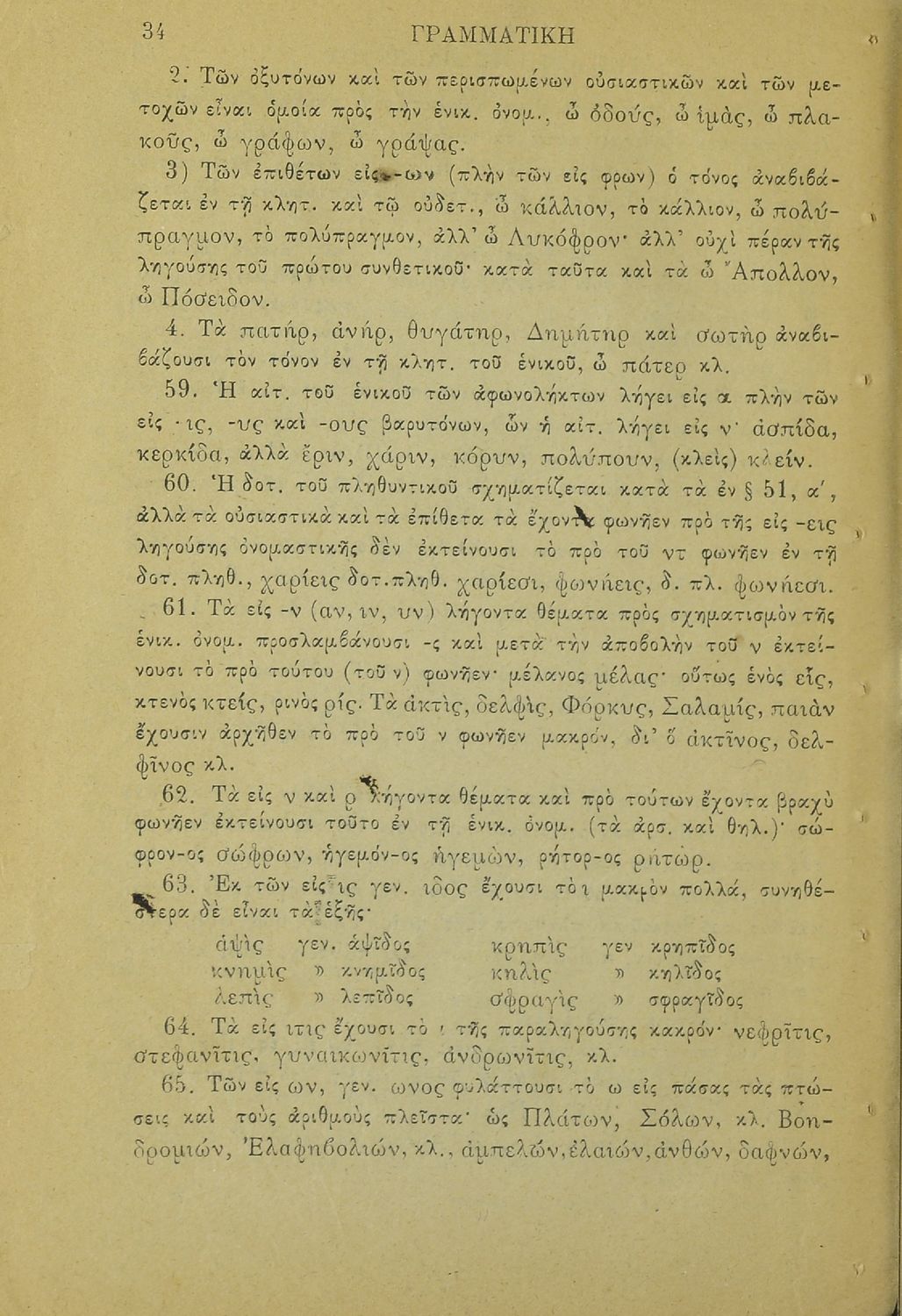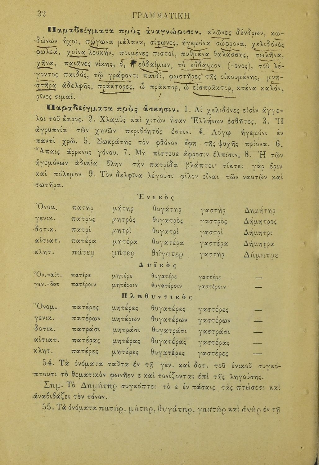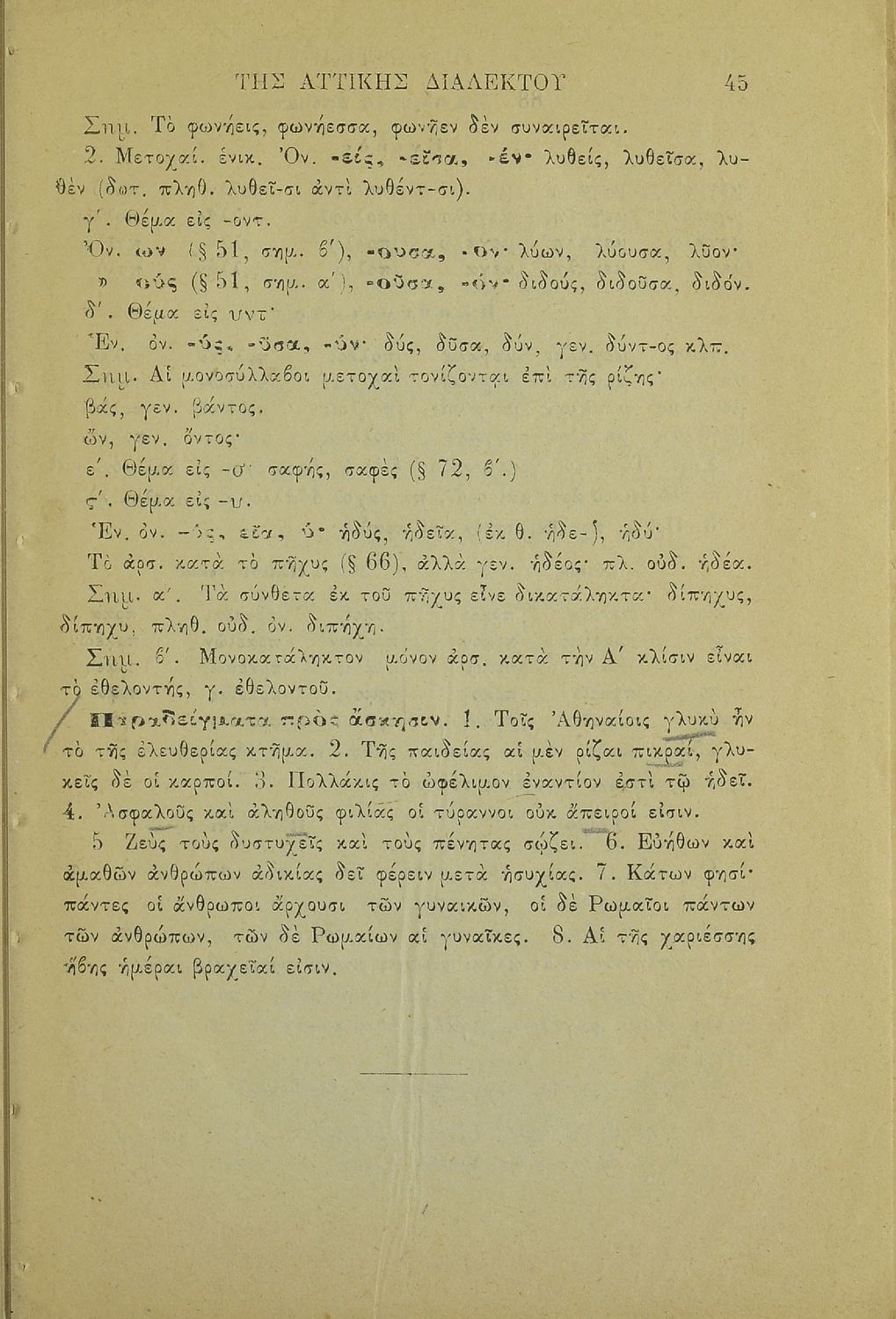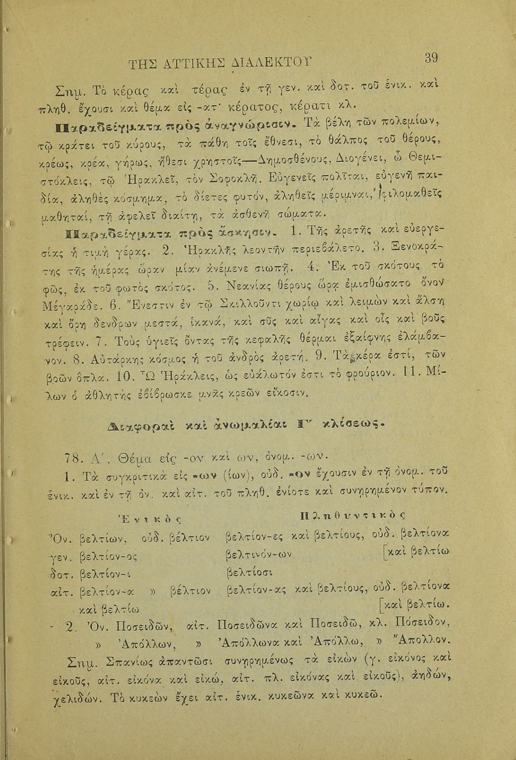 Βαθμίδα εκπαίδευσης: Δευτεροβάθμια Τάξη: Ελληνικό Σχολείο Μάθημα: Αρχαία Ελληνικά Γλώσσα: Καθαρεύουσα Παρουσίαση περιεχομένου: Σχολικό εγχειρίδιο Αρχαίων Ελληνικών που περιλαμβάνει τους κανόνες της γραμματικής και του συντακτικού της αττικής διαλέκτου. |