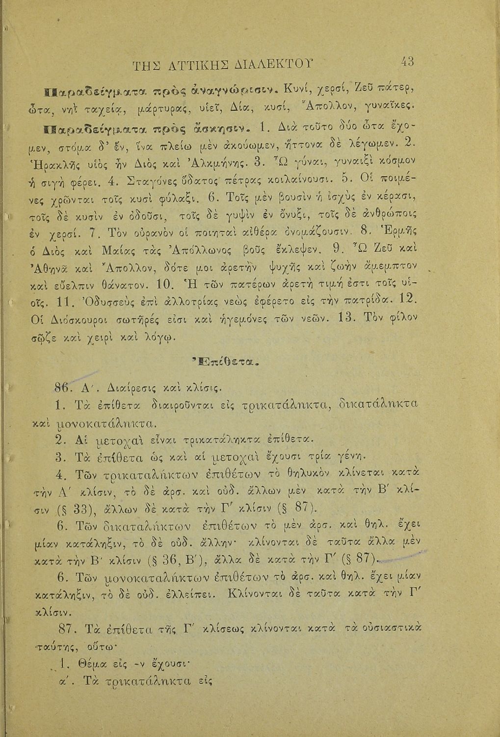 Σχολικό εγχειρίδιο Αρχαίων Ελληνικών που περιλαμβάνει τους κανόνες της γραμματικής και του συντακτικού της αττικής διαλέκτου.
