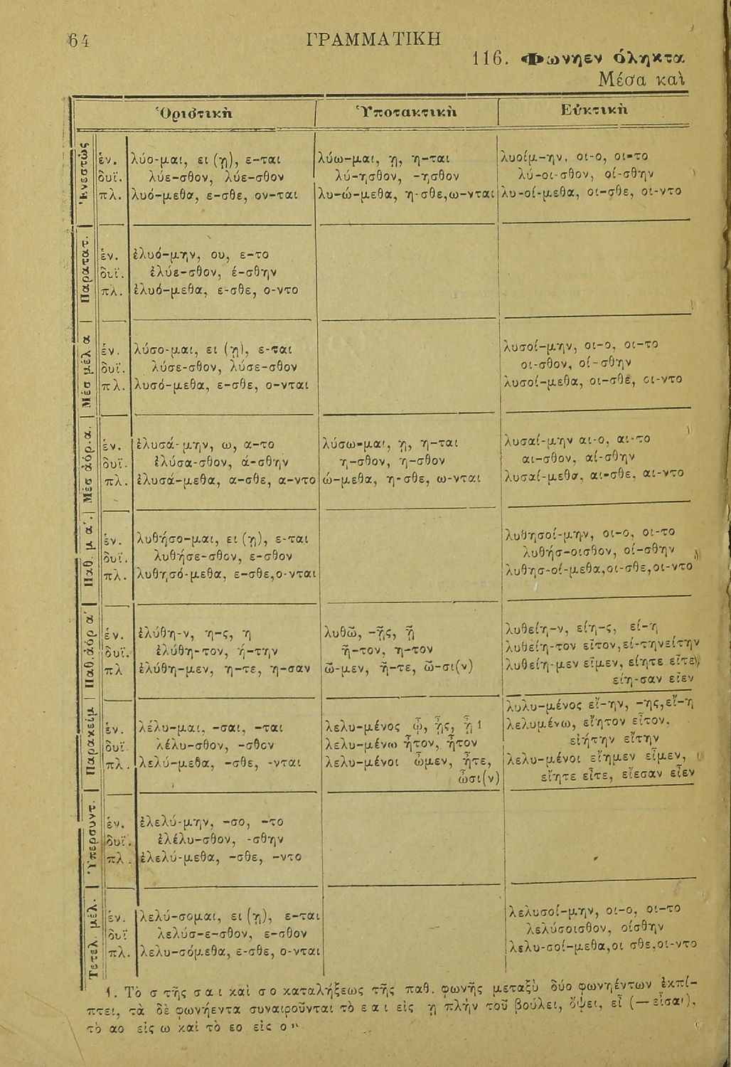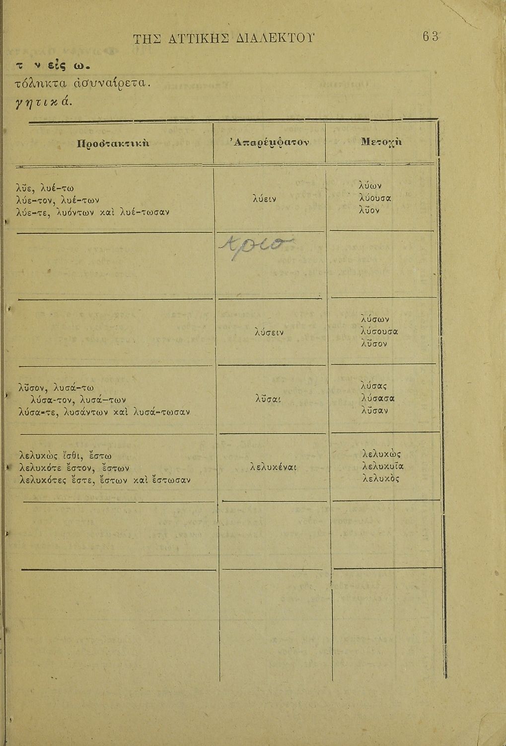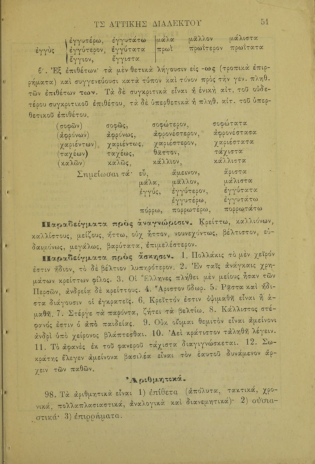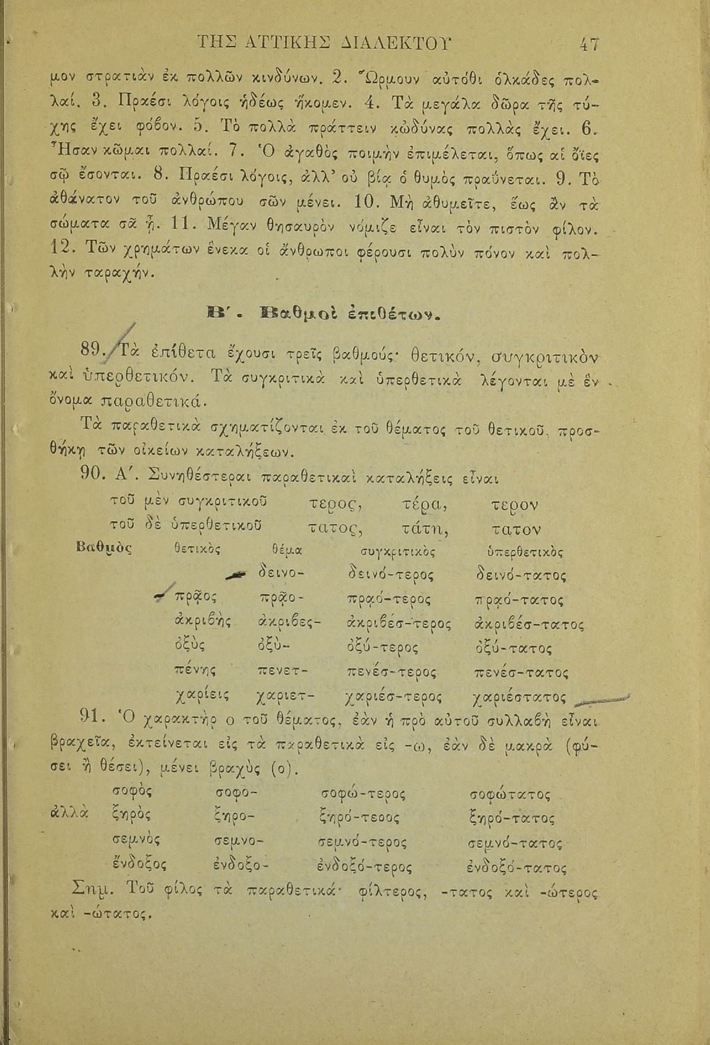 Βαθμίδα εκπαίδευσης: Δευτεροβάθμια Τάξη: Ελληνικό Σχολείο Μάθημα: Αρχαία Ελληνικά Γλώσσα: Καθαρεύουσα Παρουσίαση περιεχομένου: Σχολικό εγχειρίδιο Αρχαίων Ελληνικών που περιλαμβάνει τους κανόνες της γραμματικής και του συντακτικού της αττικής διαλέκτου. |
