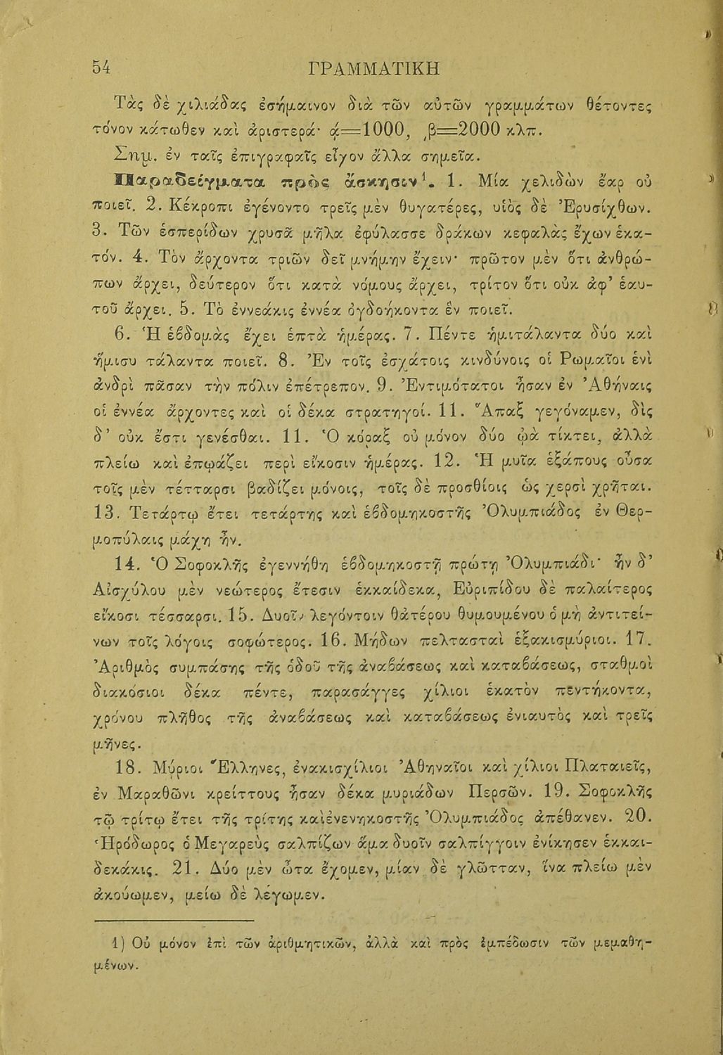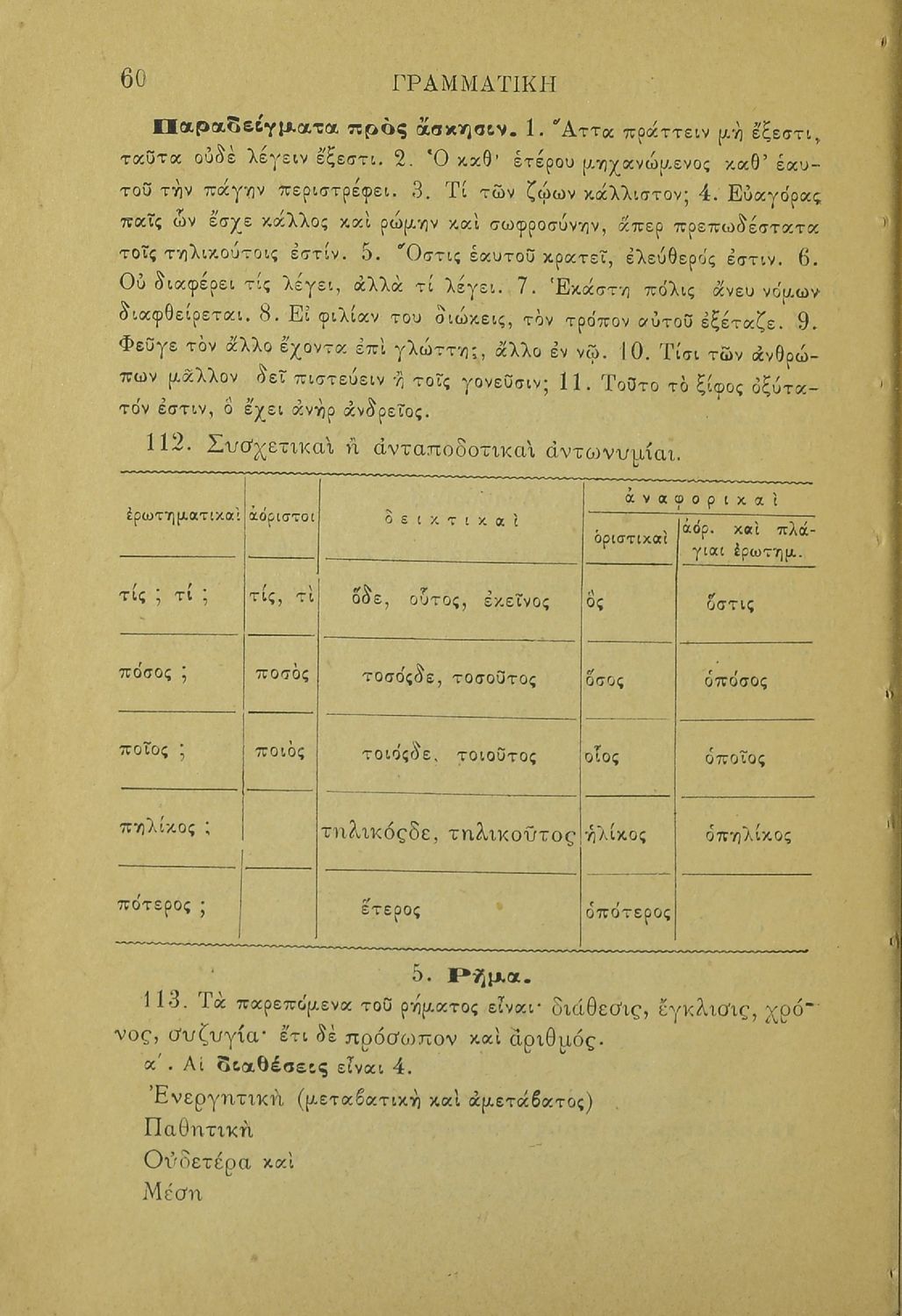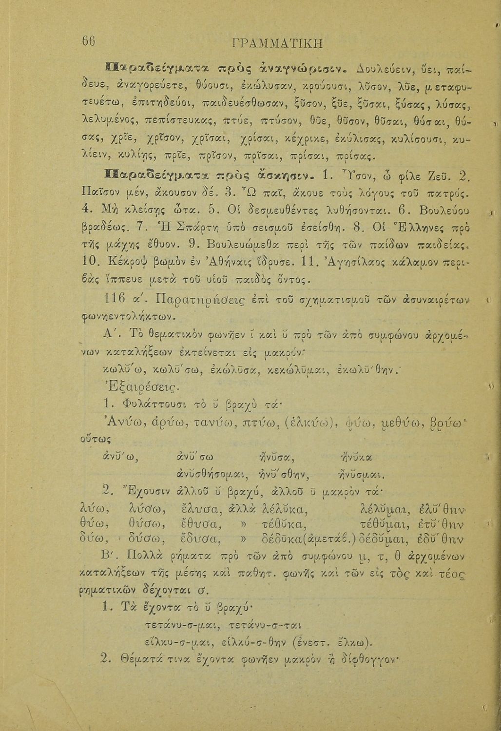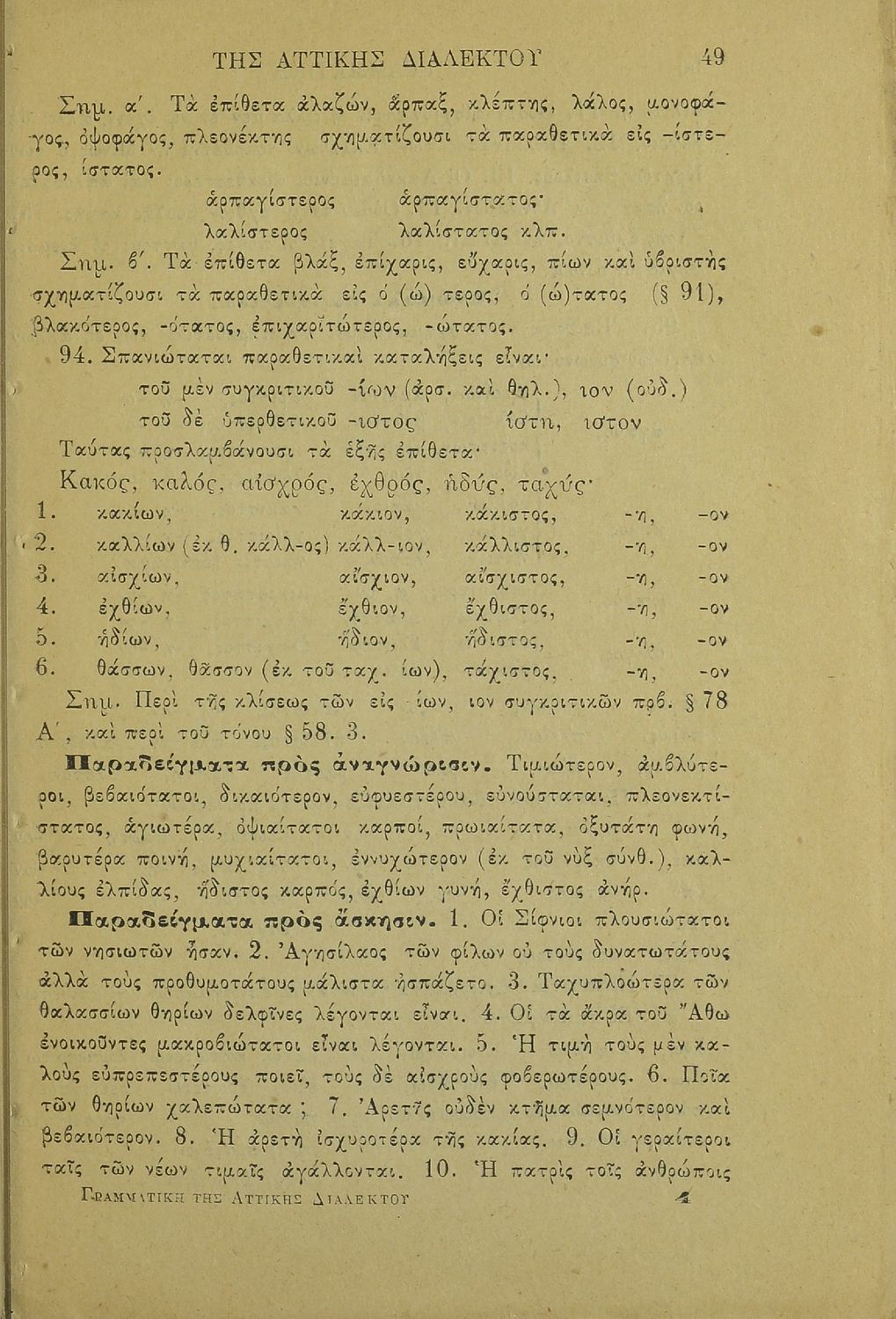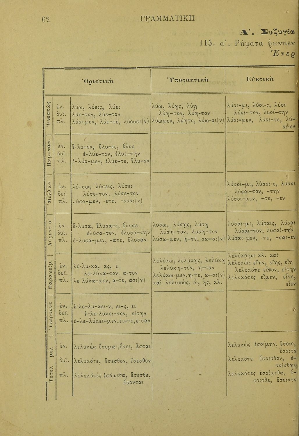 Βαθμίδα εκπαίδευσης: Δευτεροβάθμια Τάξη: Ελληνικό Σχολείο Μάθημα: Αρχαία Ελληνικά Γλώσσα: Καθαρεύουσα Παρουσίαση περιεχομένου: Σχολικό εγχειρίδιο Αρχαίων Ελληνικών που περιλαμβάνει τους κανόνες της γραμματικής και του συντακτικού της αττικής διαλέκτου. |