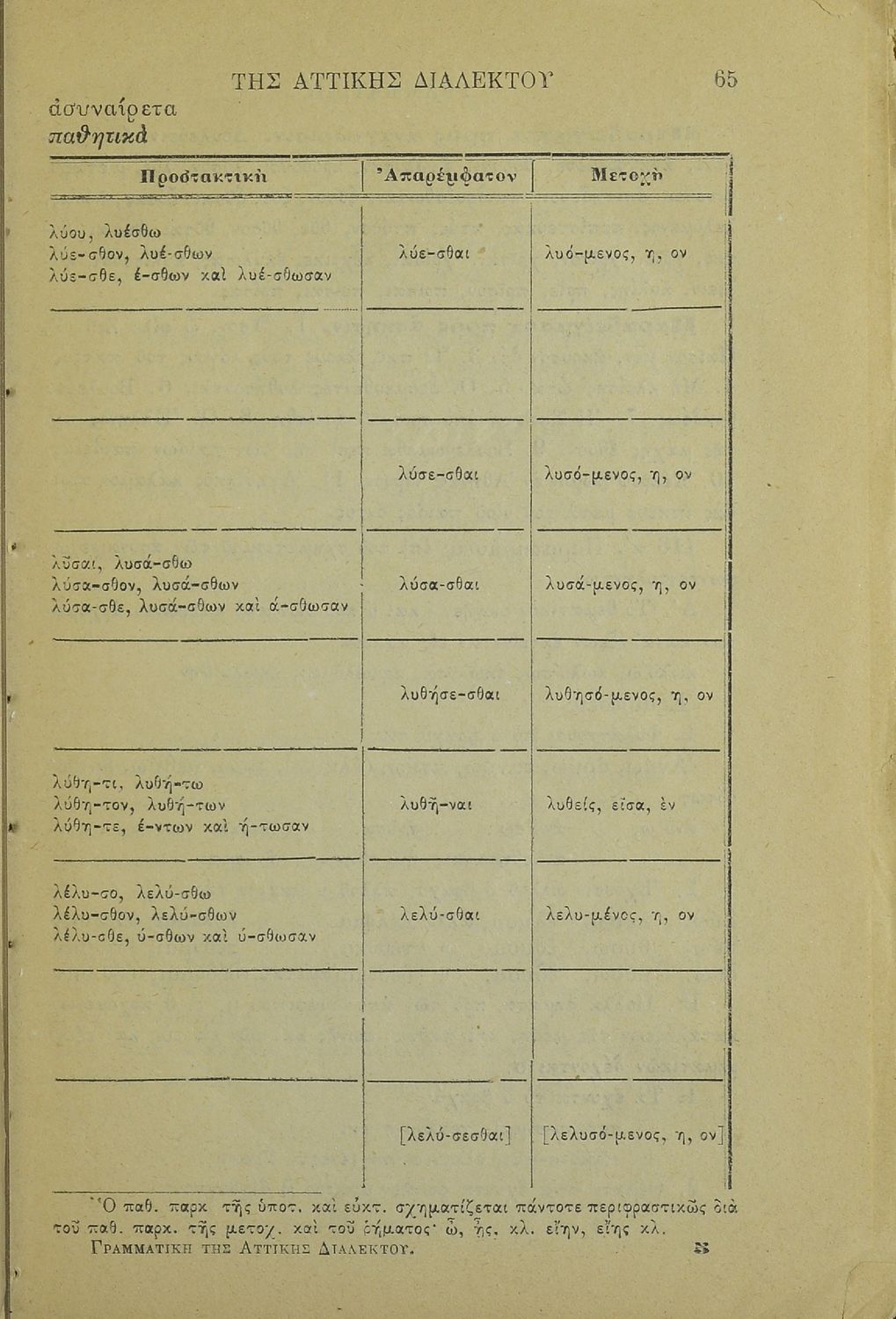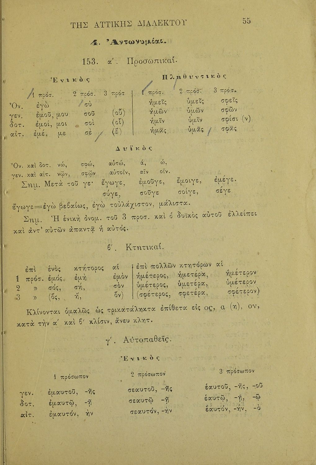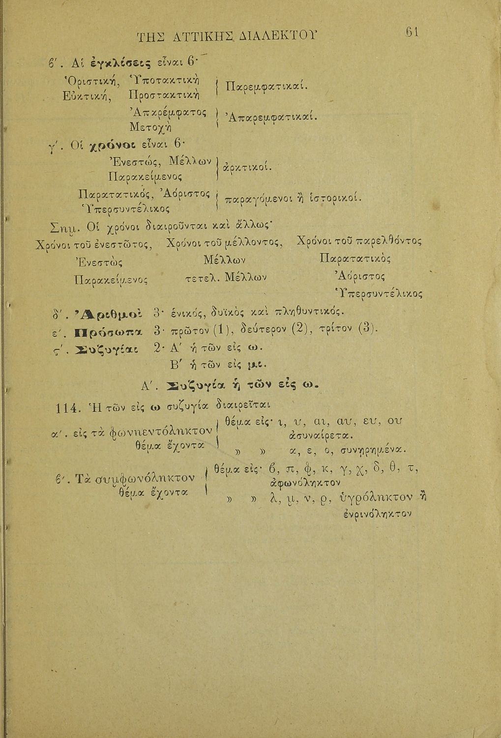 Σχολικό εγχειρίδιο Αρχαίων Ελληνικών που περιλαμβάνει τους κανόνες της γραμματικής και του συντακτικού της αττικής διαλέκτου.