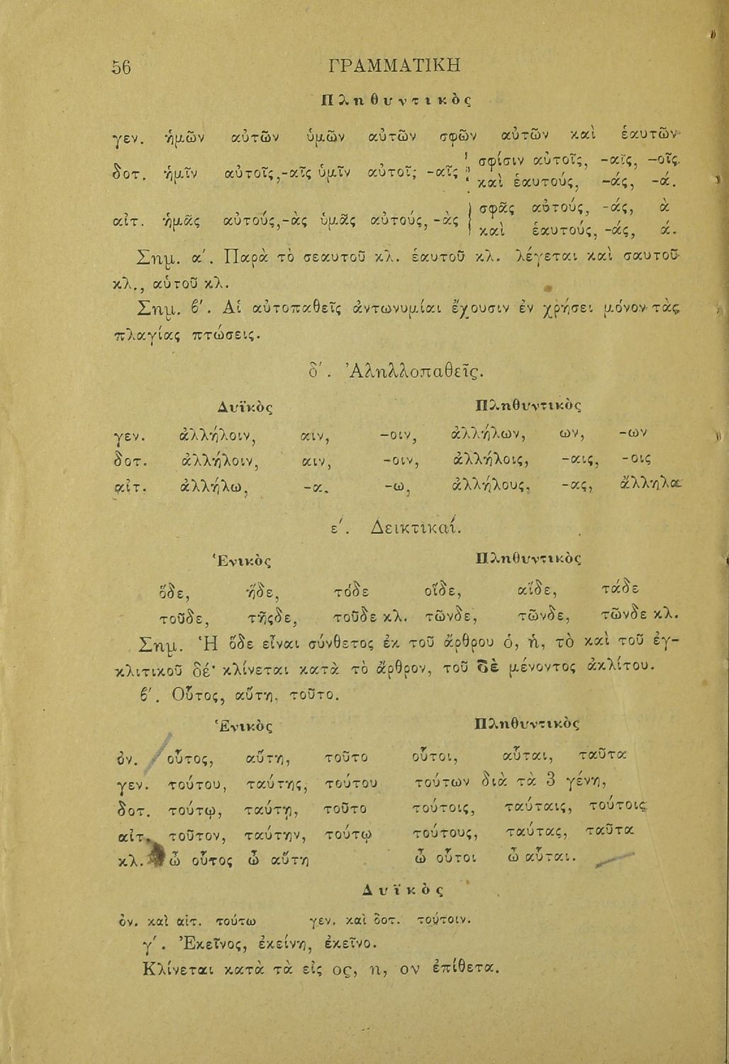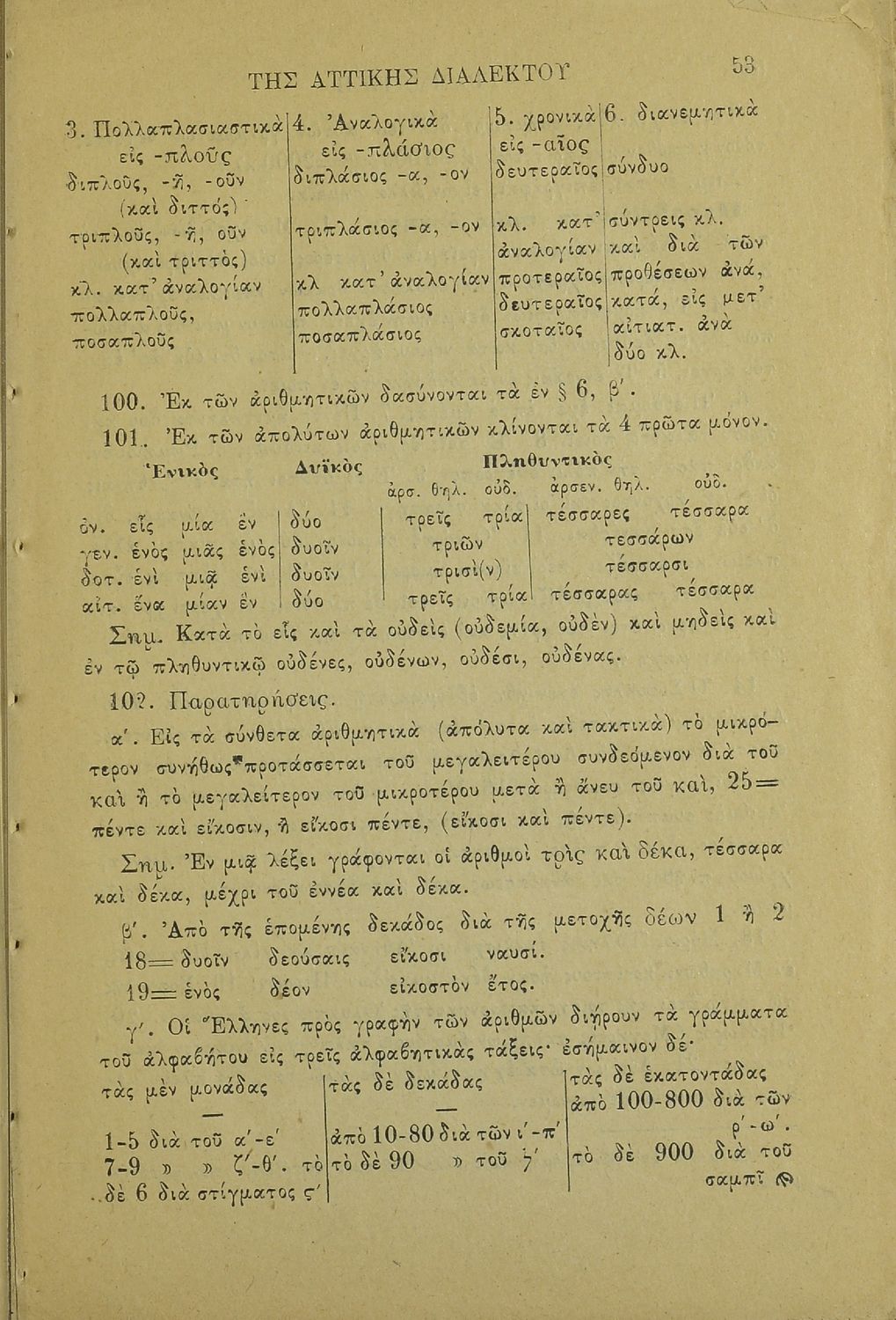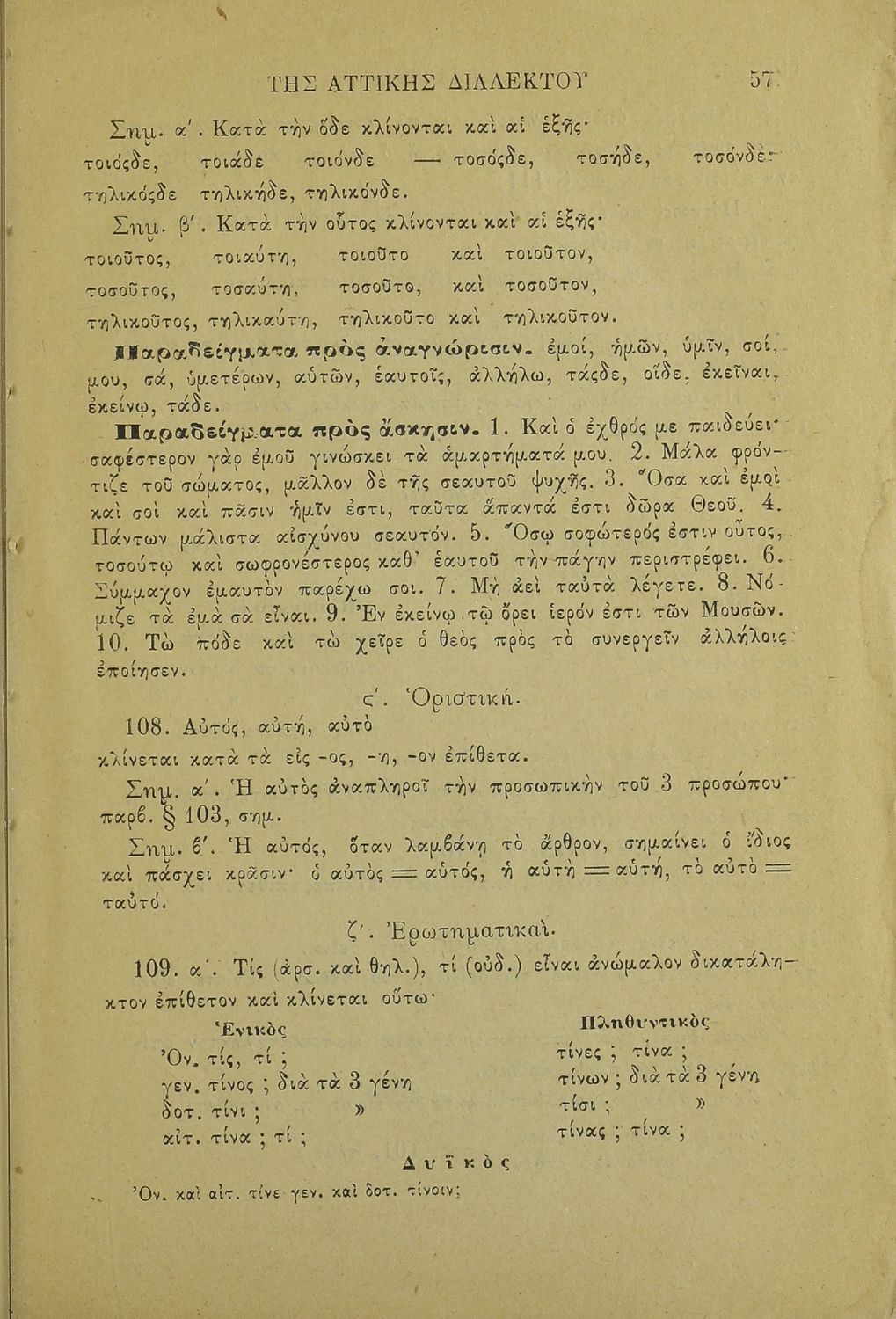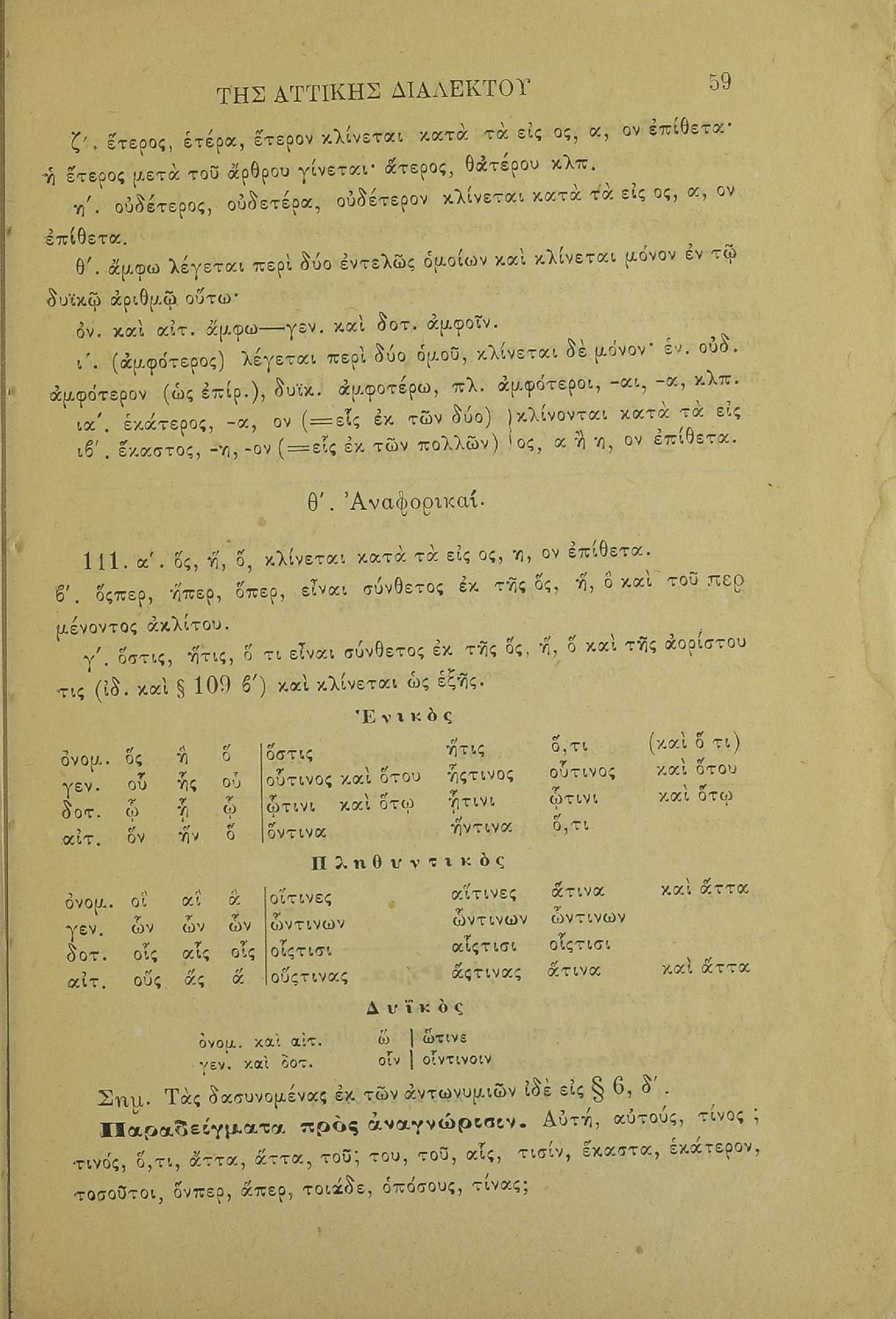 Σχολικό εγχειρίδιο Αρχαίων Ελληνικών που περιλαμβάνει τους κανόνες της γραμματικής και του συντακτικού της αττικής διαλέκτου.