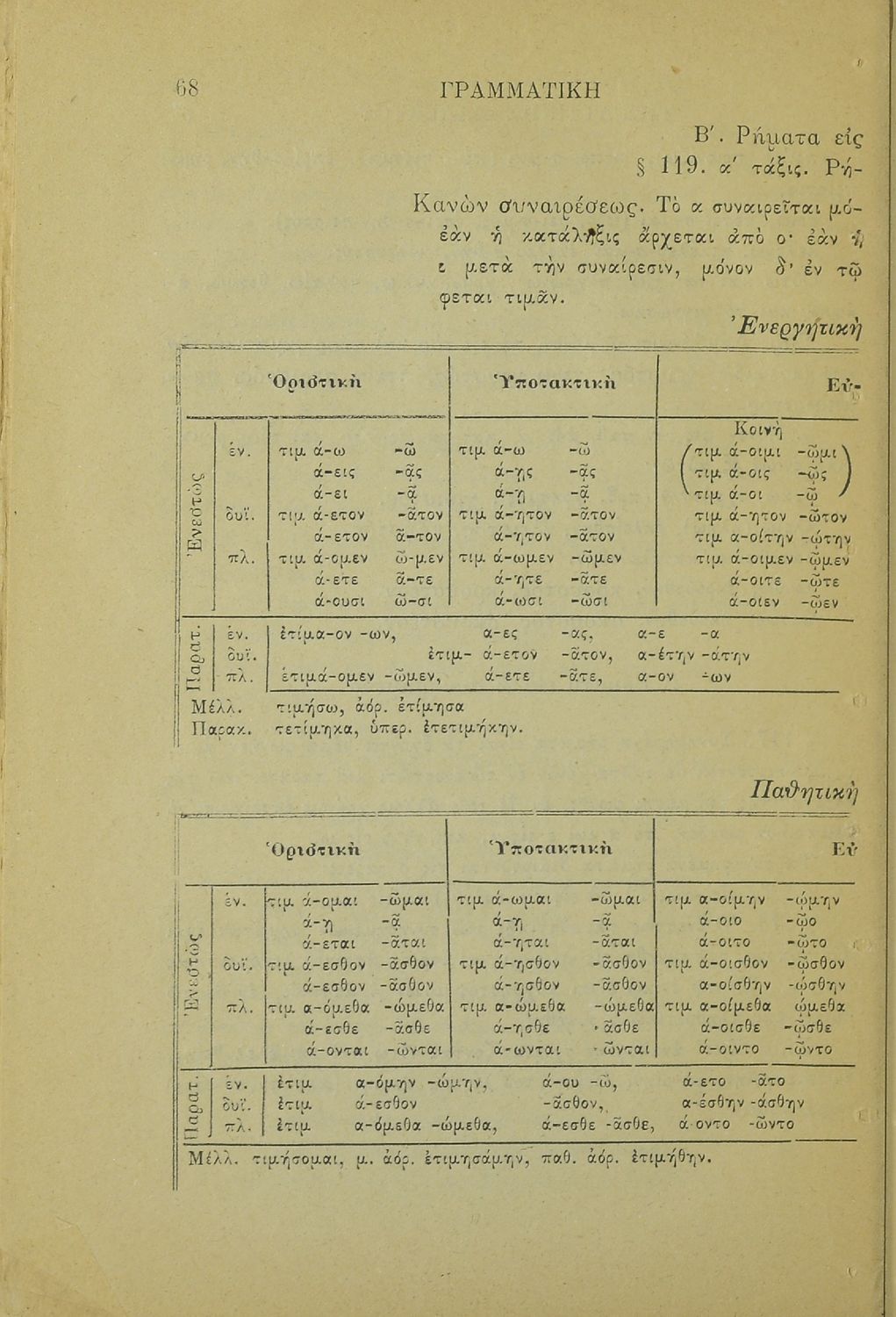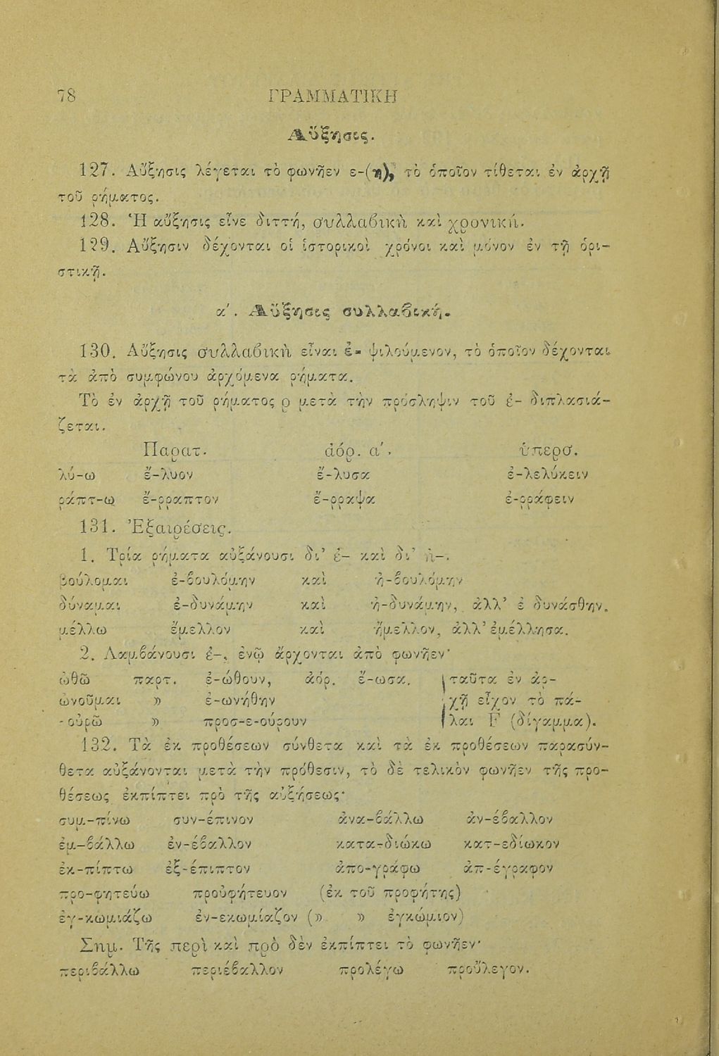 Σχολικό εγχειρίδιο Αρχαίων Ελληνικών για τα Ελληνικά Σχολεία και Παρθεναγωγεία που περιέχει τους κανόνες γραμματικής και είναι χωρισμένο σε φθογγολογικό, τυπολογικό και ετυμολογικό μέρος.