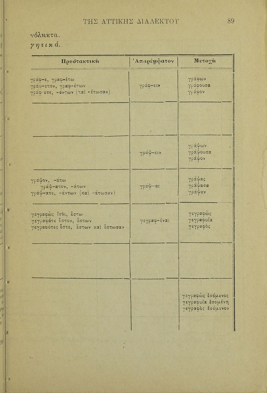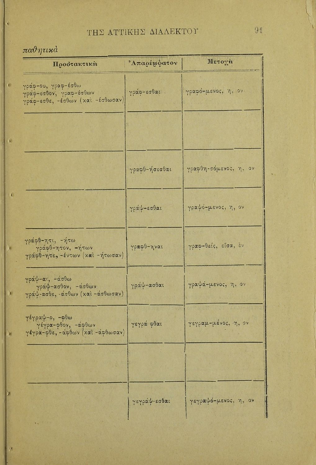 Σχολικό εγχειρίδιο Αρχαίων Ελληνικών που περιλαμβάνει τους κανόνες της γραμματικής και του συντακτικού της αττικής διαλέκτου.