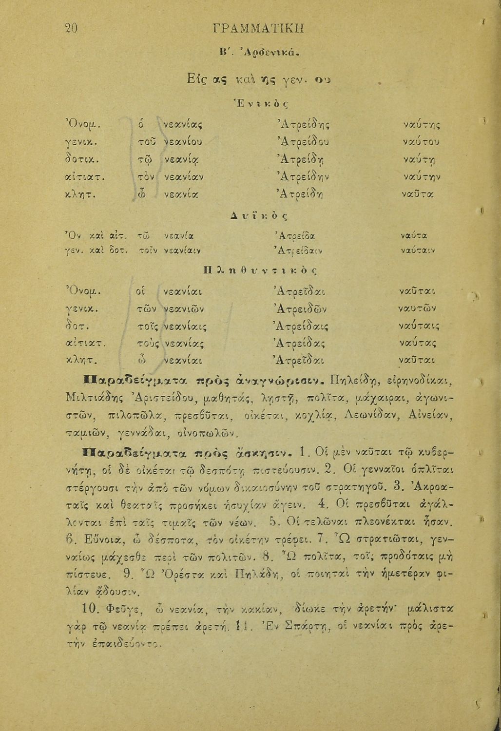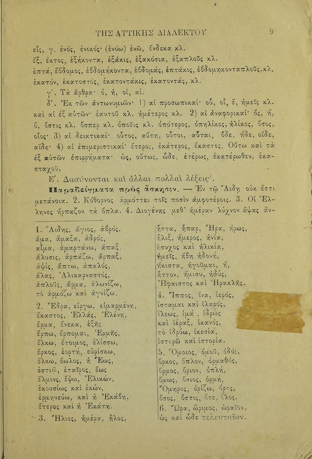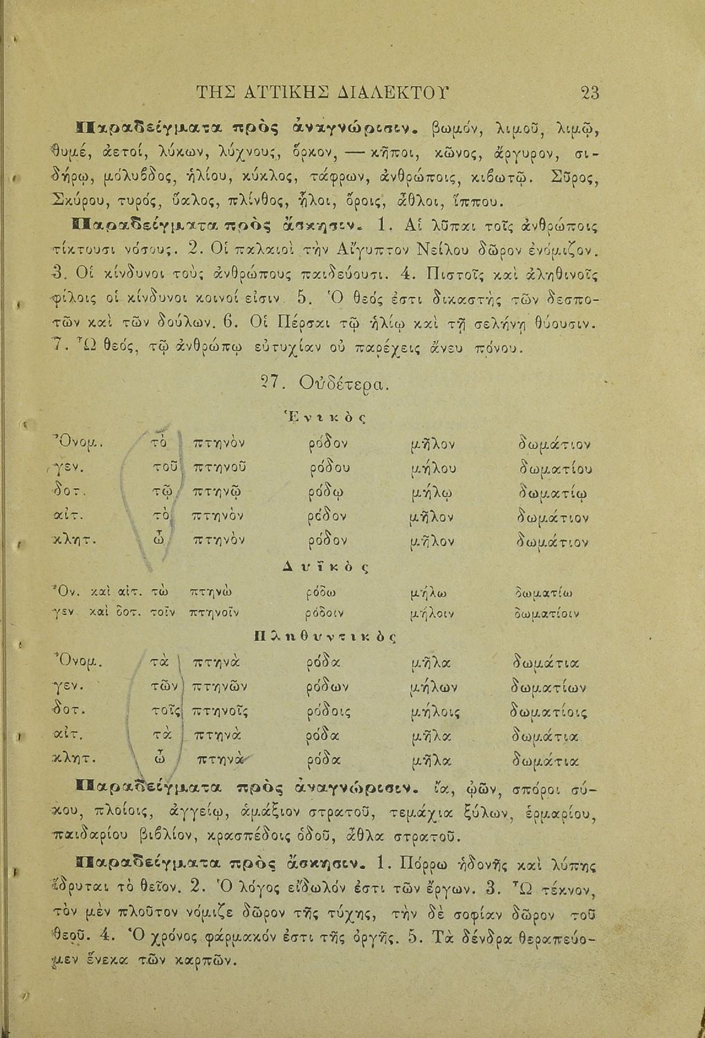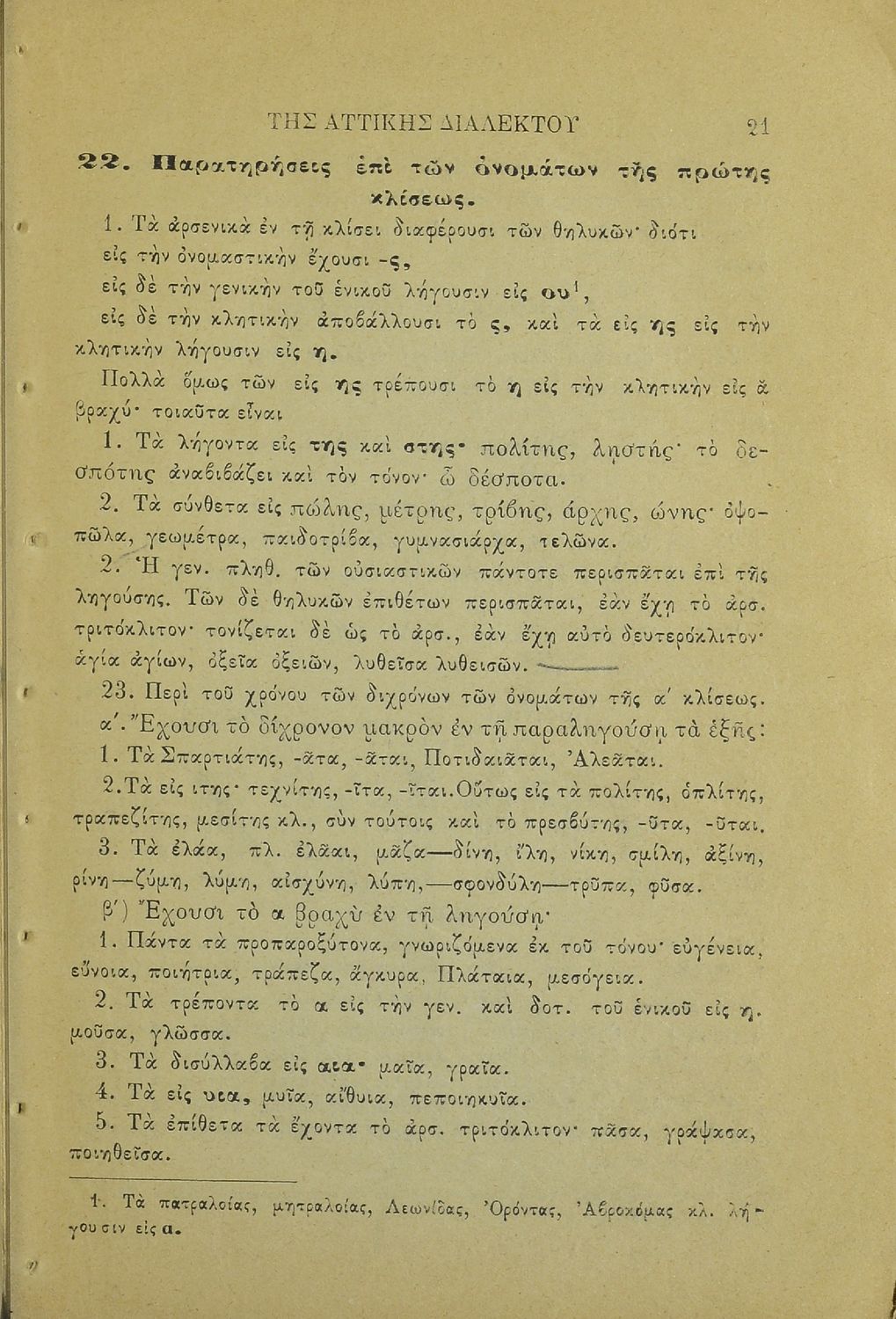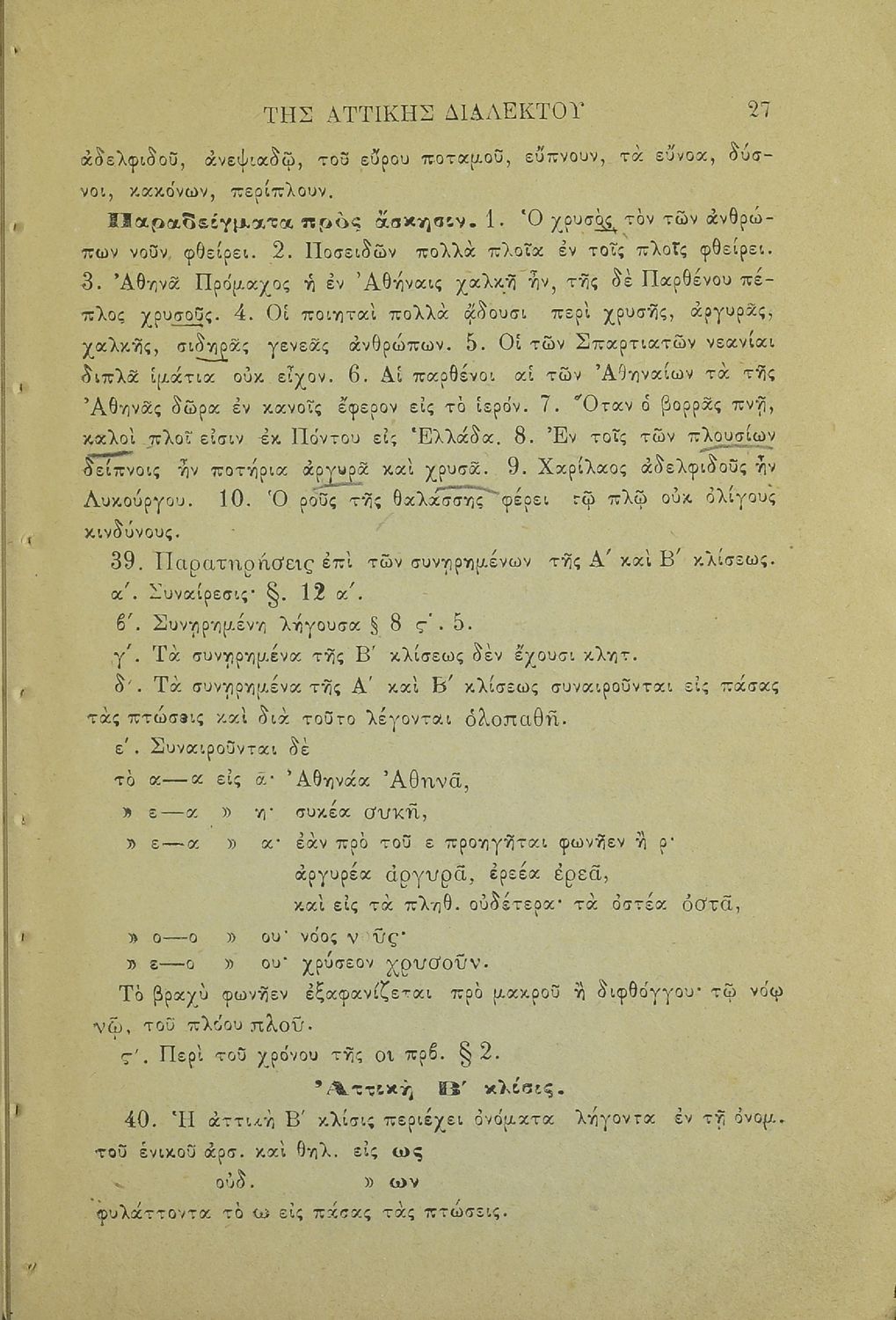 Βαθμίδα εκπαίδευσης: Δευτεροβάθμια Τάξη: Ελληνικό Σχολείο Μάθημα: Αρχαία Ελληνικά Γλώσσα: Καθαρεύουσα Παρουσίαση περιεχομένου: Σχολικό εγχειρίδιο Αρχαίων Ελληνικών που περιλαμβάνει τους κανόνες της γραμματικής και του συντακτικού της αττικής διαλέκτου. |