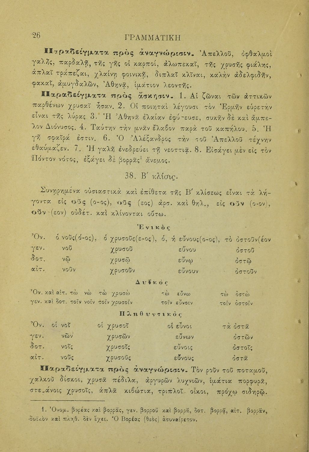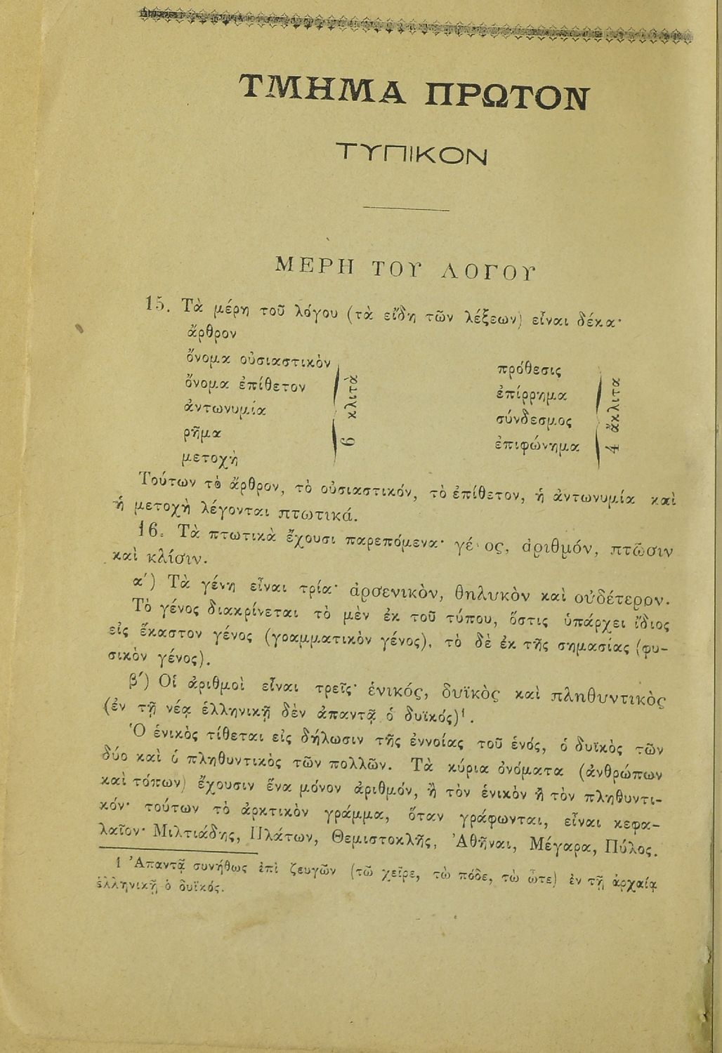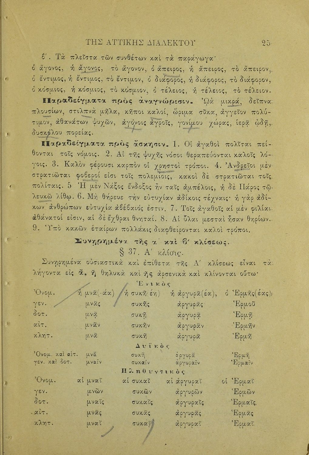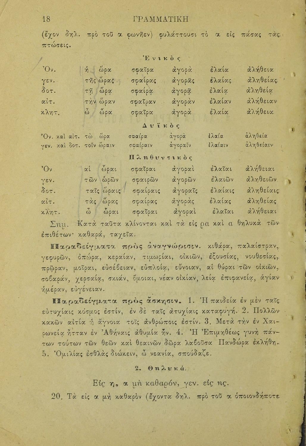Βαθμίδα εκπαίδευσης: Δευτεροβάθμια Τάξη: Ελληνικό Σχολείο Μάθημα: Αρχαία Ελληνικά Γλώσσα: Καθαρεύουσα Παρουσίαση περιεχομένου: Σχολικό εγχειρίδιο Αρχαίων Ελληνικών που περιλαμβάνει τους κανόνες της γραμματικής και του συντακτικού της αττικής διαλέκτου. |