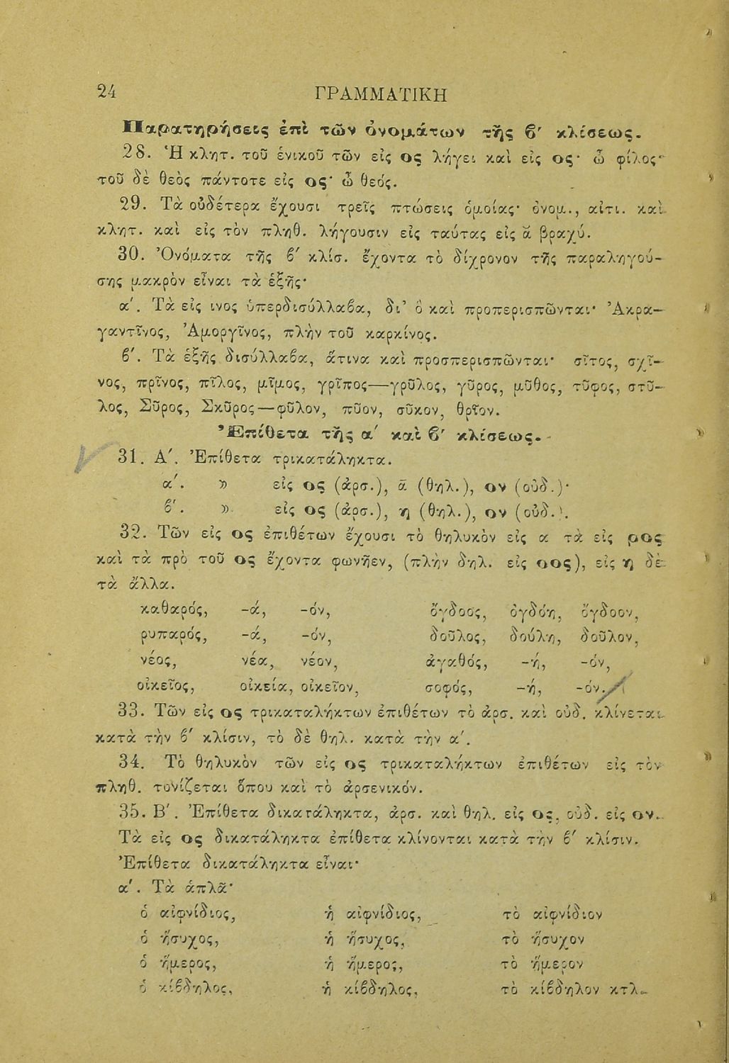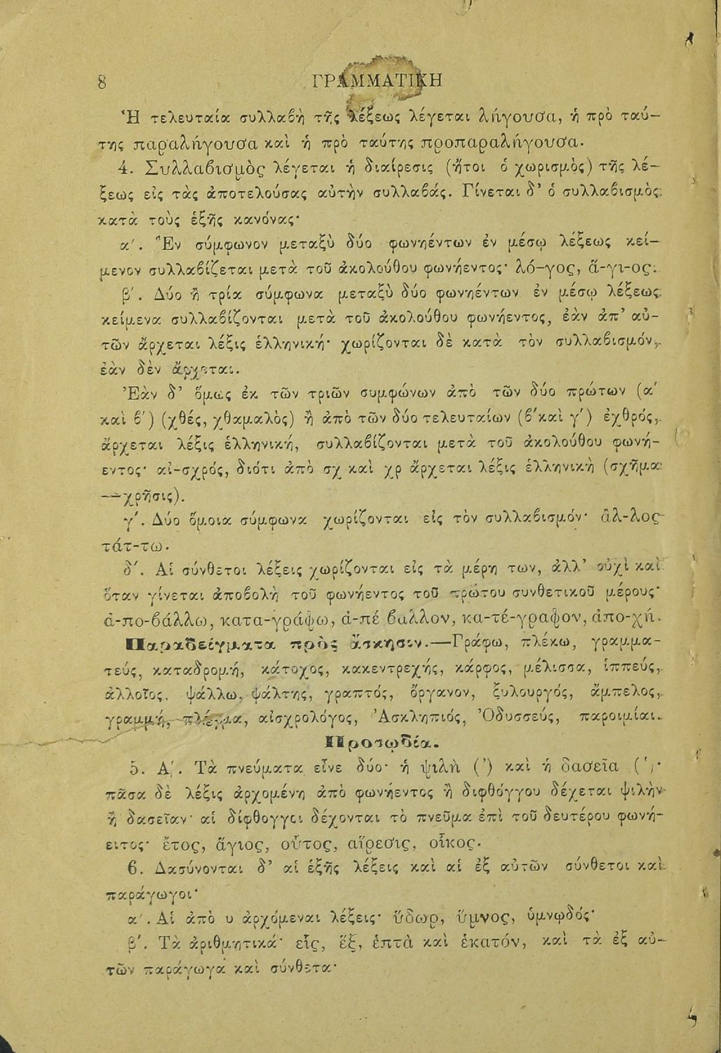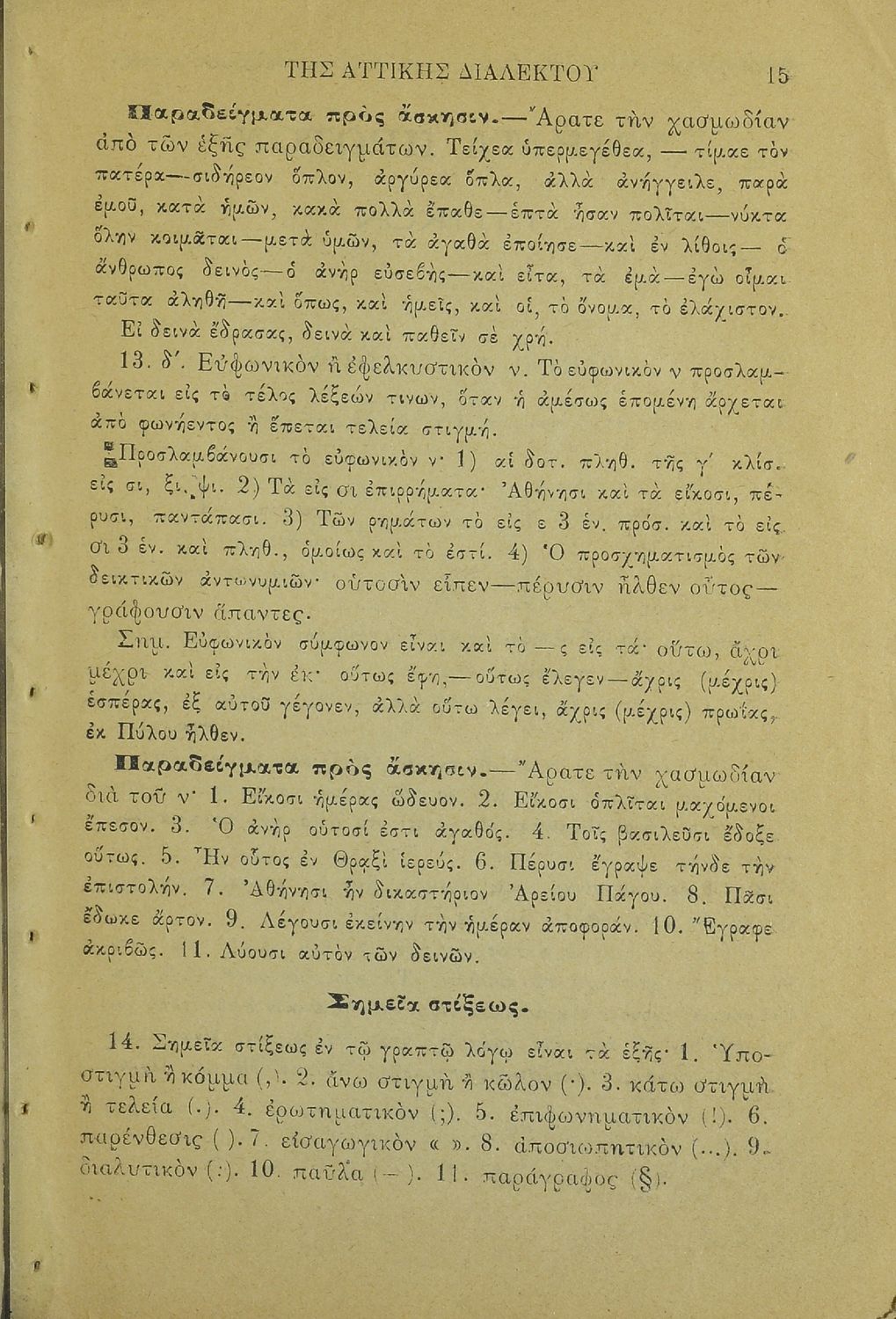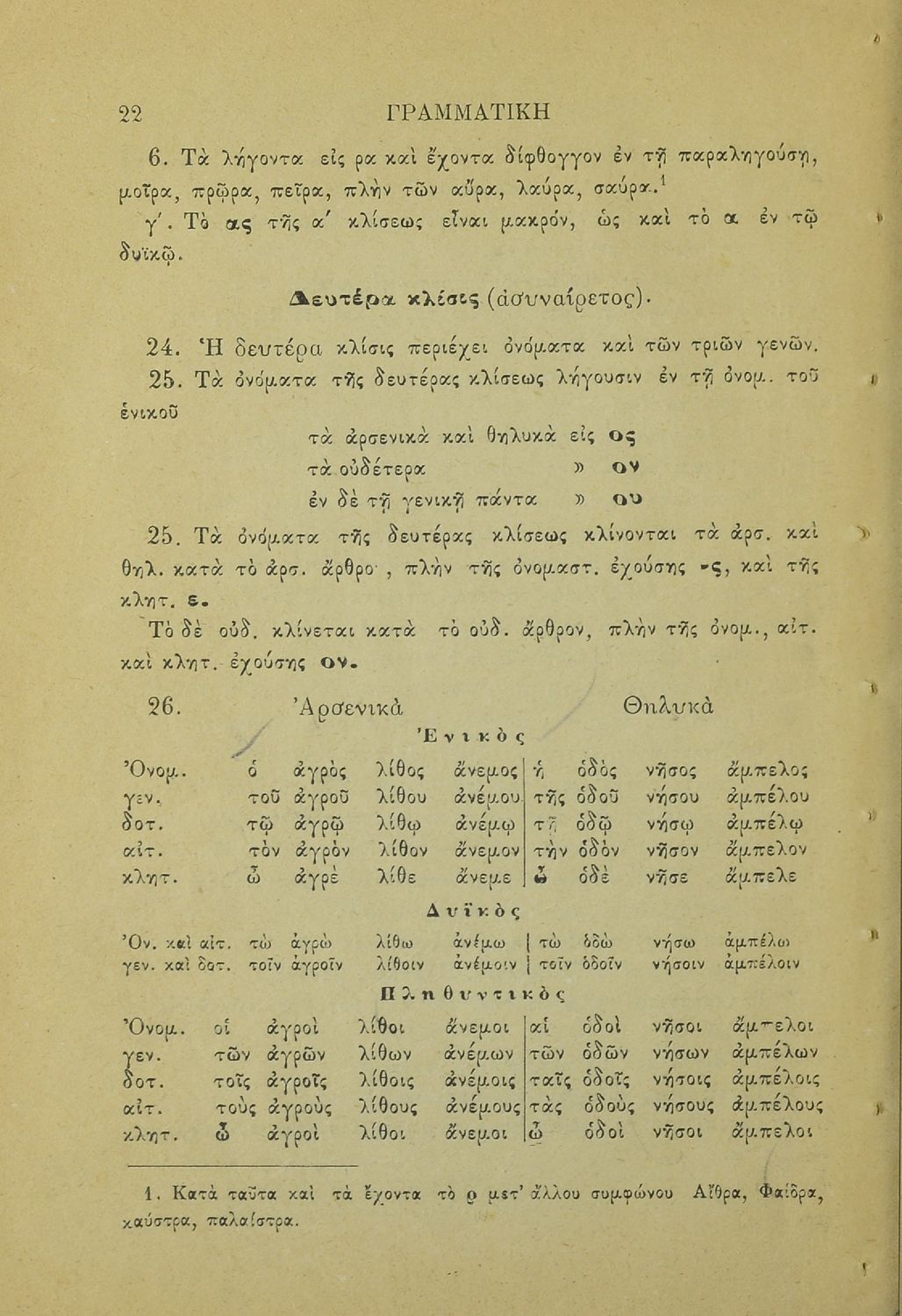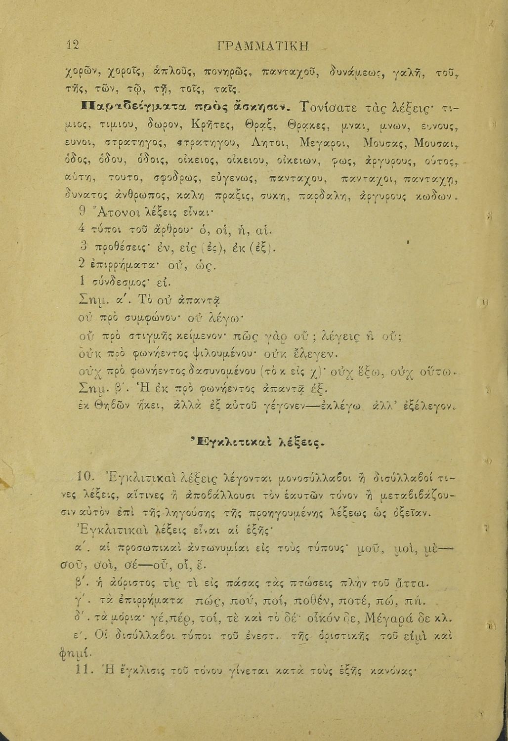 Βαθμίδα εκπαίδευσης: Δευτεροβάθμια Τάξη: Ελληνικό Σχολείο Μάθημα: Αρχαία Ελληνικά Γλώσσα: Καθαρεύουσα Παρουσίαση περιεχομένου: Σχολικό εγχειρίδιο Αρχαίων Ελληνικών που περιλαμβάνει τους κανόνες της γραμματικής και του συντακτικού της αττικής διαλέκτου. |