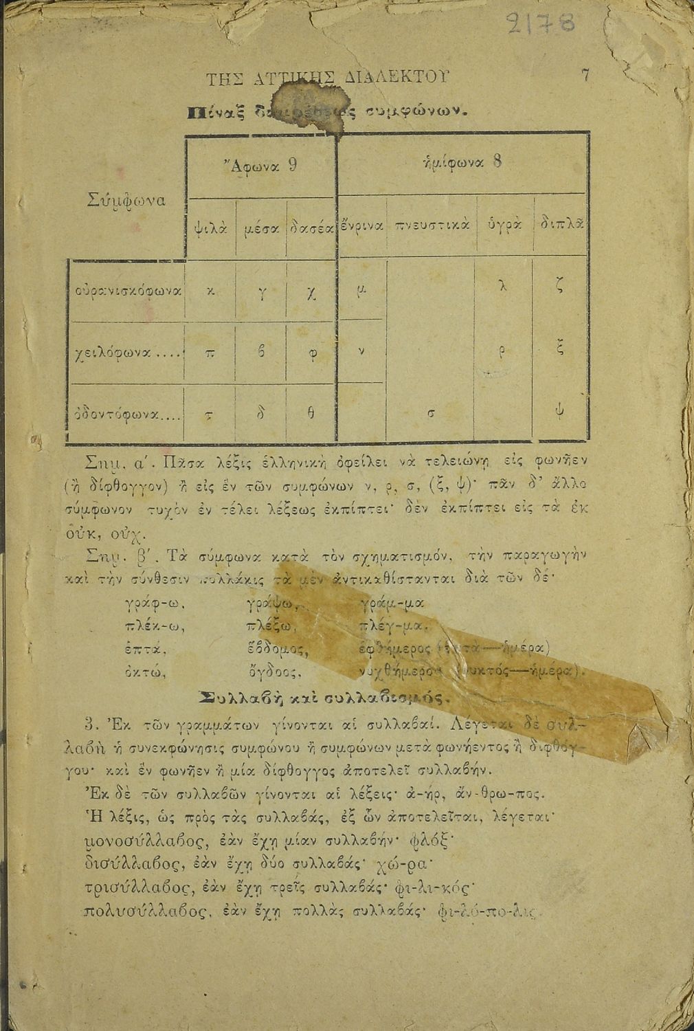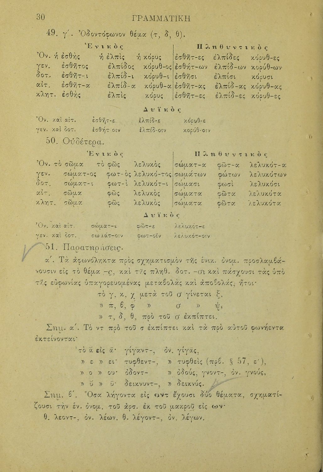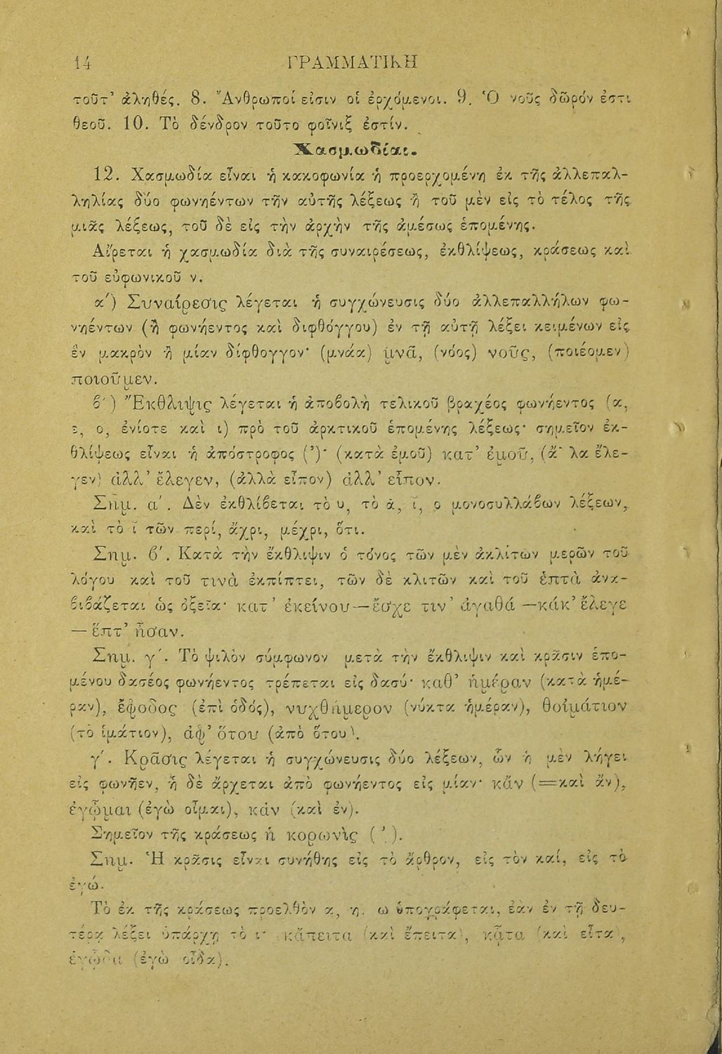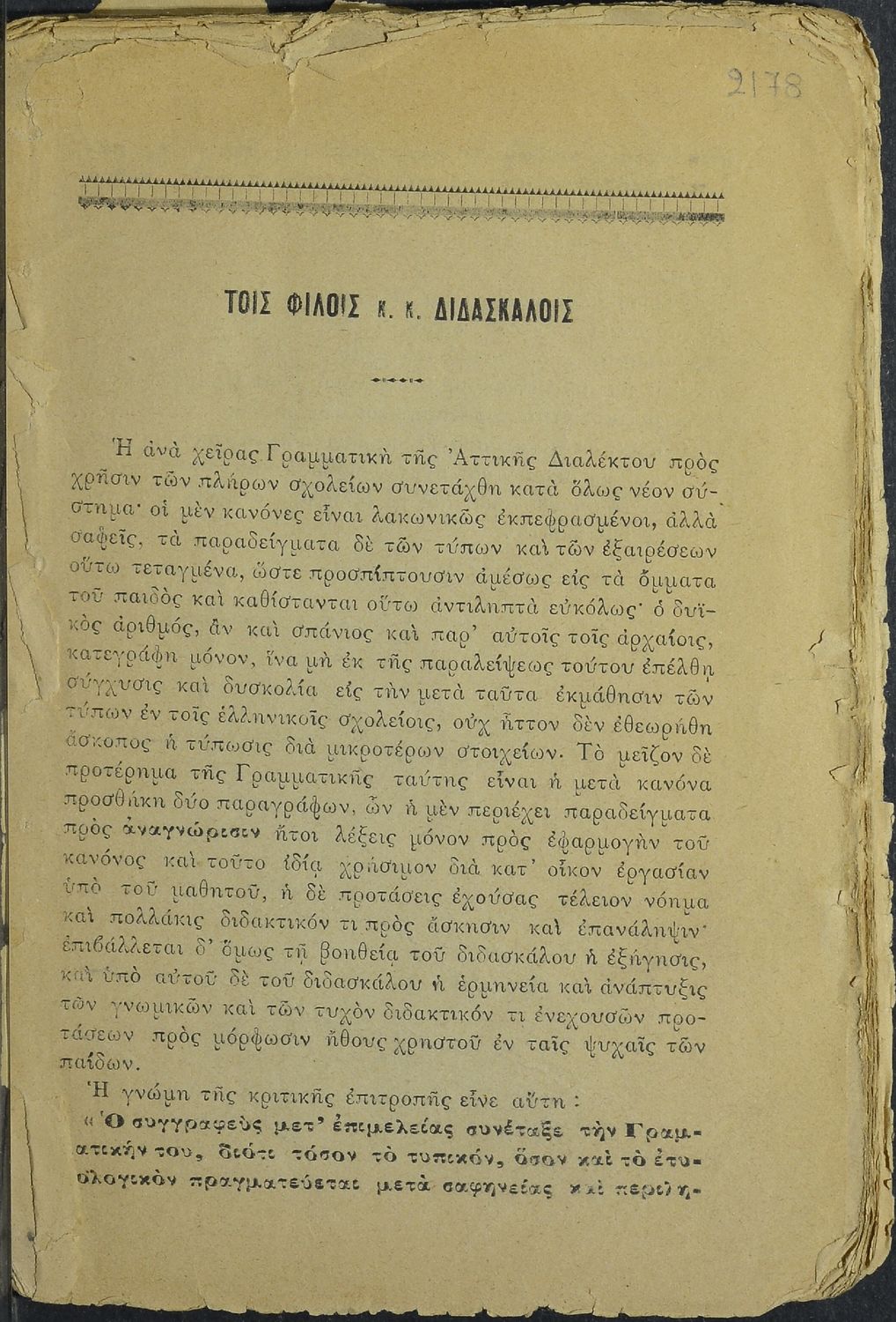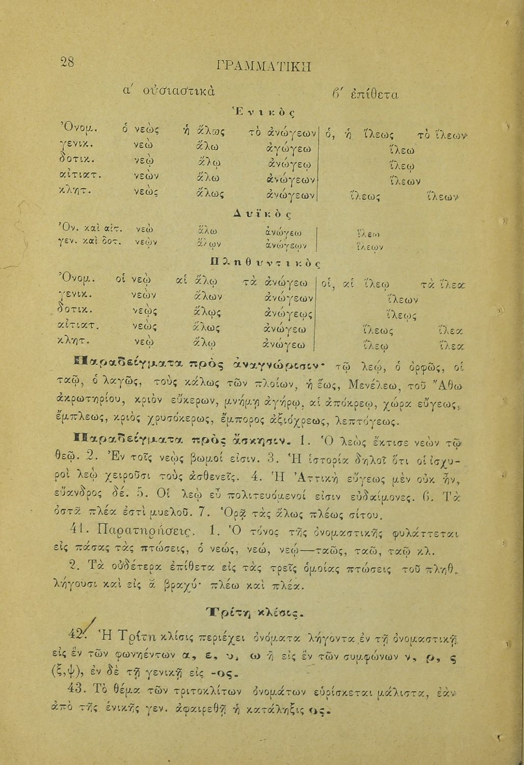 Βαθμίδα εκπαίδευσης: Δευτεροβάθμια Τάξη: Ελληνικό Σχολείο Μάθημα: Αρχαία Ελληνικά Γλώσσα: Καθαρεύουσα Παρουσίαση περιεχομένου: Σχολικό εγχειρίδιο Αρχαίων Ελληνικών που περιλαμβάνει τους κανόνες της γραμματικής και του συντακτικού της αττικής διαλέκτου. |