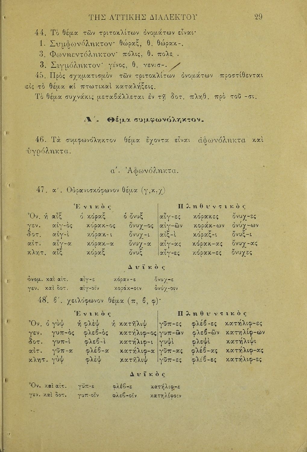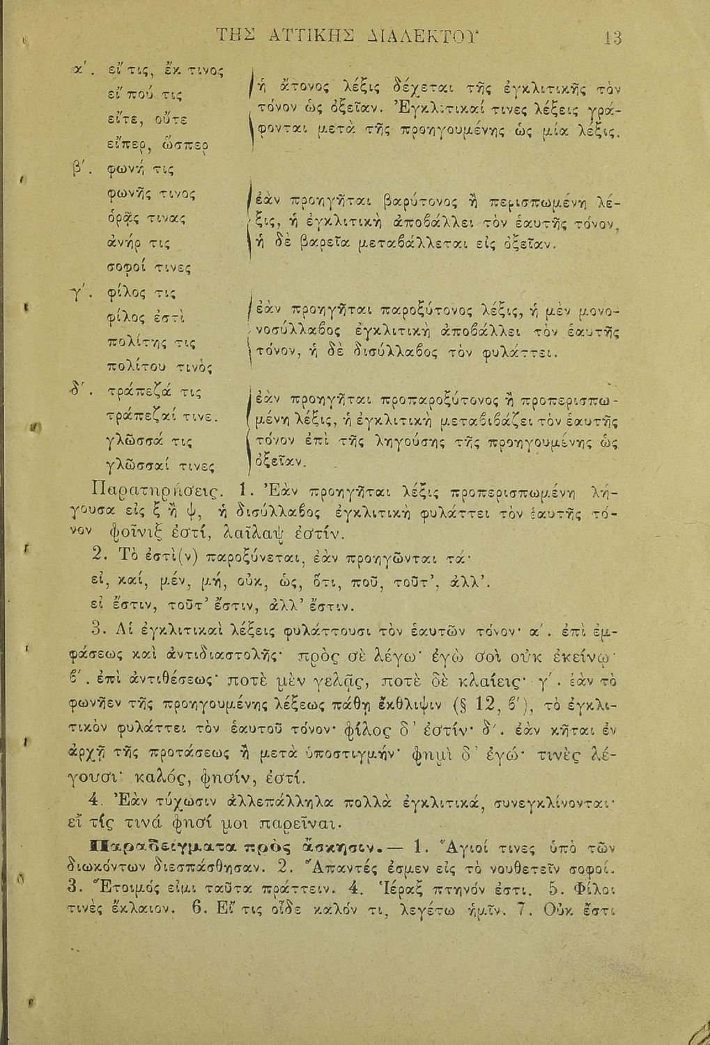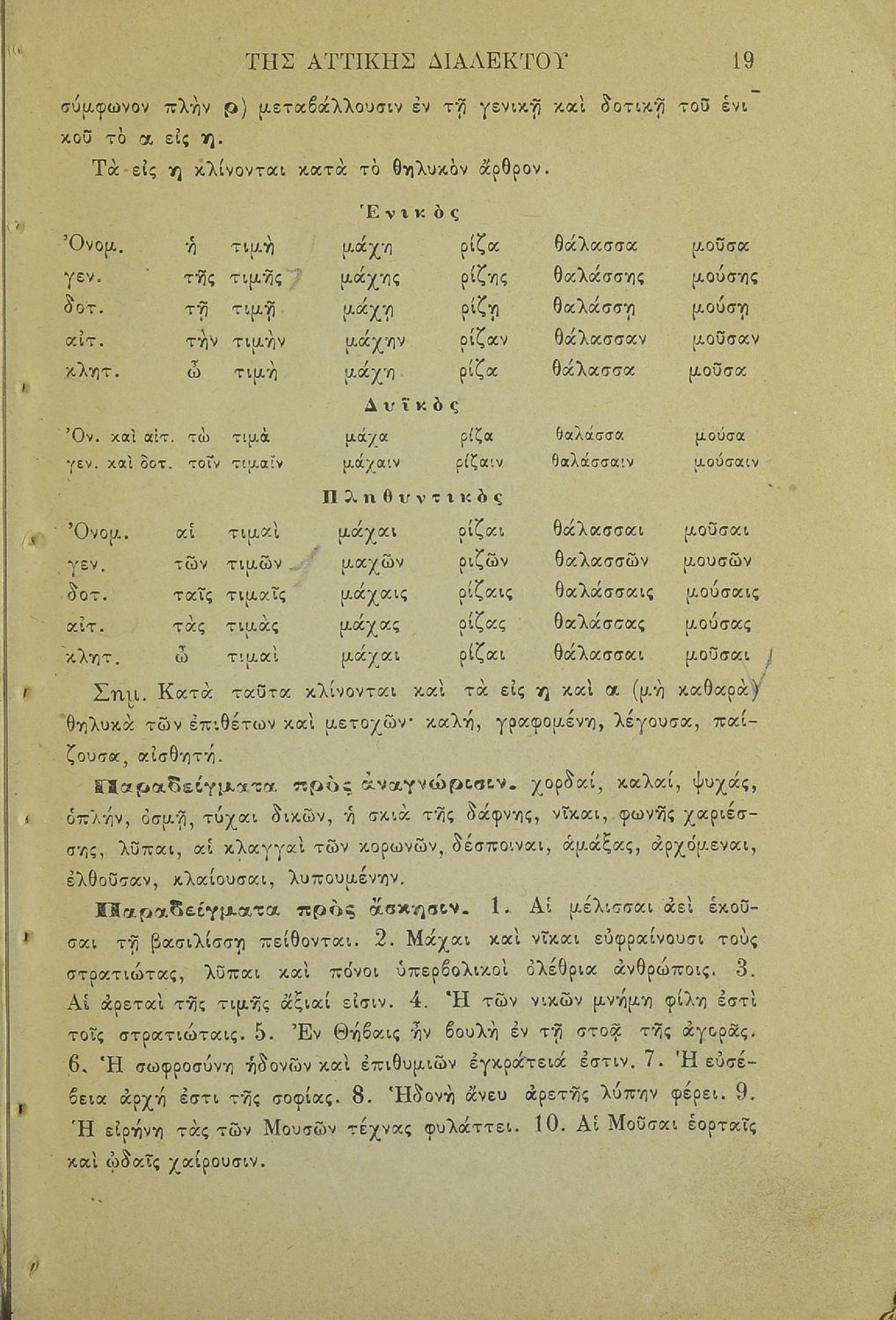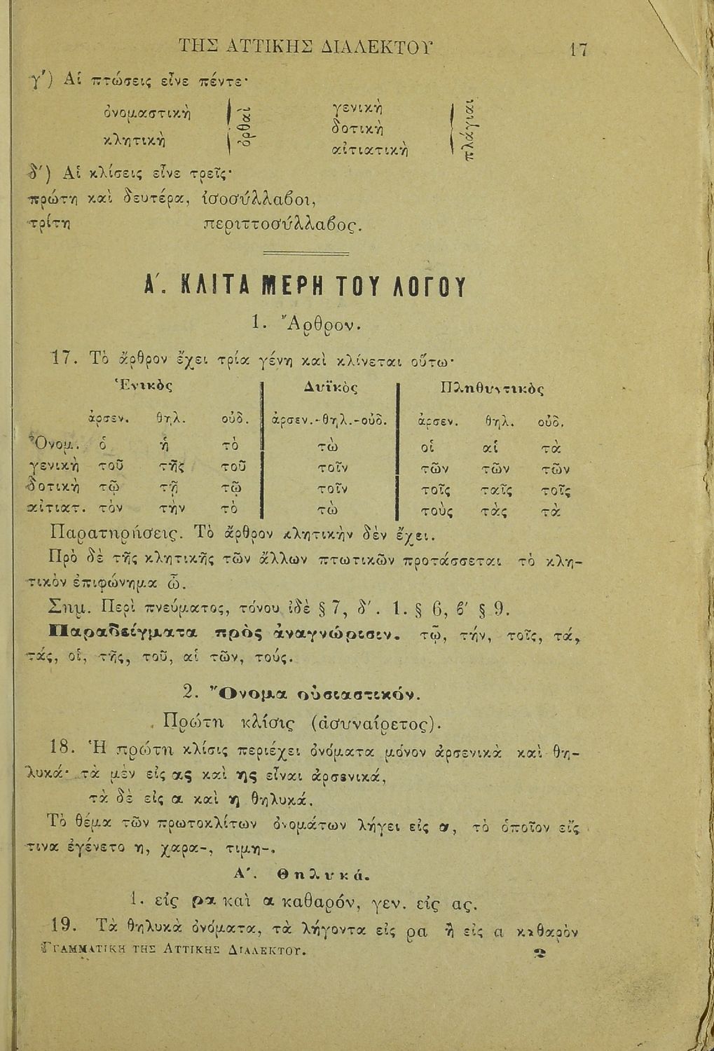 Σχολικό εγχειρίδιο Αρχαίων Ελληνικών που περιλαμβάνει τους κανόνες της γραμματικής και του συντακτικού της αττικής διαλέκτου.