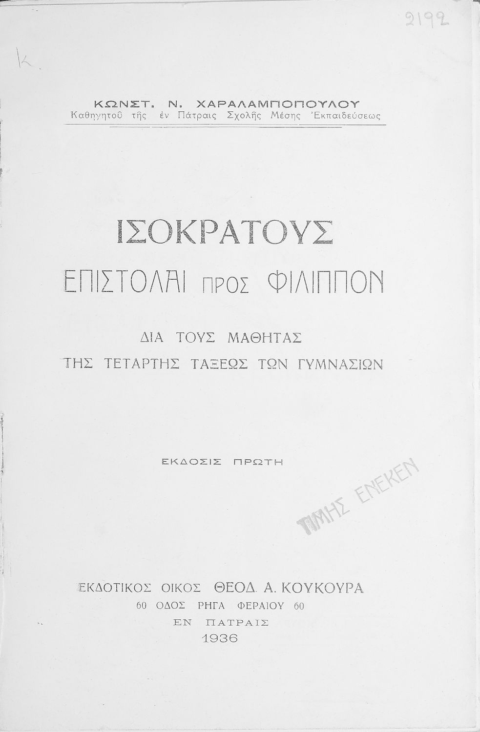 Κωδικός αναγνώρισης: 20-02192 Τίτλος: Ισοκράτους επιστολαί προς Φίλιππον διά τους μαθητάς της τετάρτης τάξεως των Γυμνασίων Συγγραφέας: Ισοκράτης, Κωνστ. Ν. Χαραλαμπόπουλος (σχόλια) Μέγεθος και υπόστρωμα: Μαθητικό βοήθημα, 22εκ., μαλακό εξώφυλλο, 38 σελίδες. |