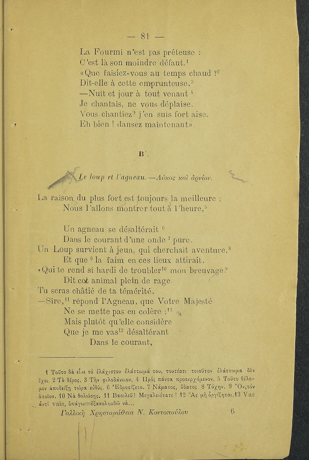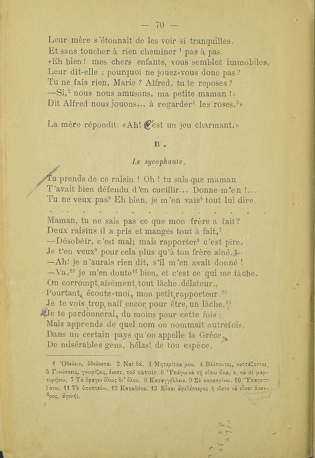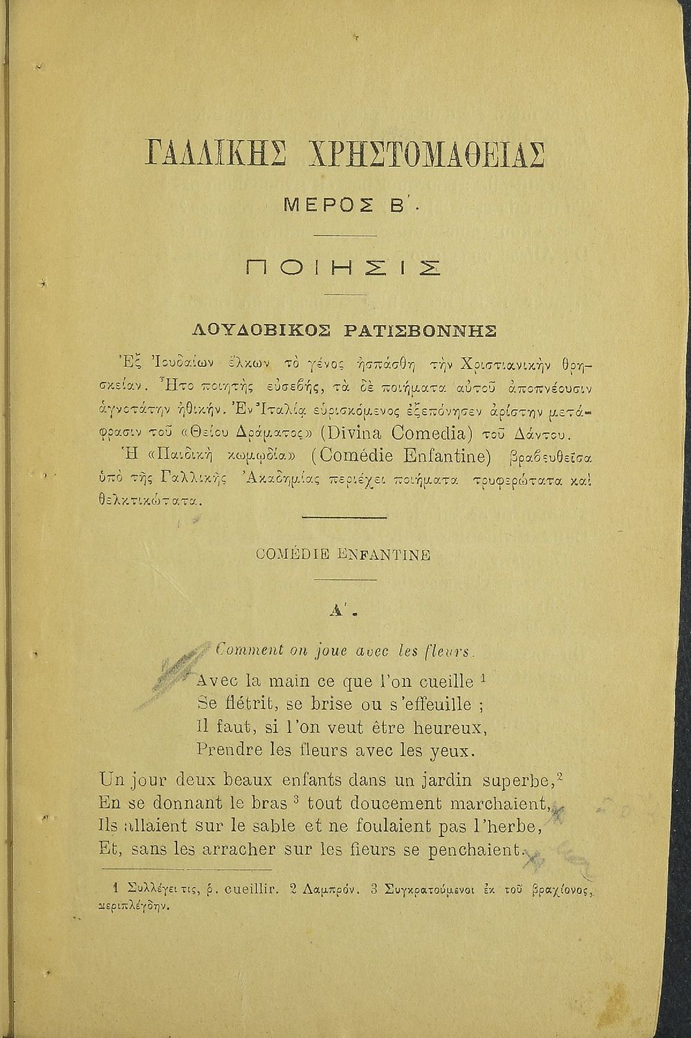 Σχολικό εγχειρίδιο Γαλλικής γλώσσας των τάξεων της Γ΄ Γυμνάσιου, Β΄ Διδασκαλείου Θηλέων και Α' Διδασκαλείου Αρρένων που περιέχει σειρά ποιημάτων και πεζών Γάλλων συγγραφέων, σύντομα βιογραφικά σημειώματα, ...