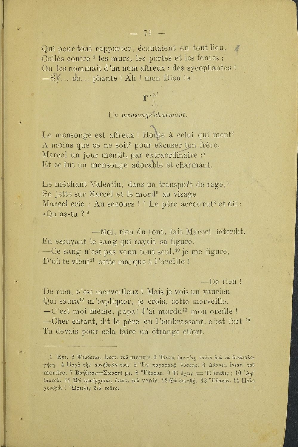 Σχολικό εγχειρίδιο Γαλλικών για τις Γ΄ Γυμνάσιου, Β΄ Διδασκαλείου Θηλέων και Α' Διδασκαλείου Αρρένων που περιέχει αποσπάσματα έργων Γάλλων συγγραφέων, και γλωσσικά και ερμηνευτικά σχόλια.