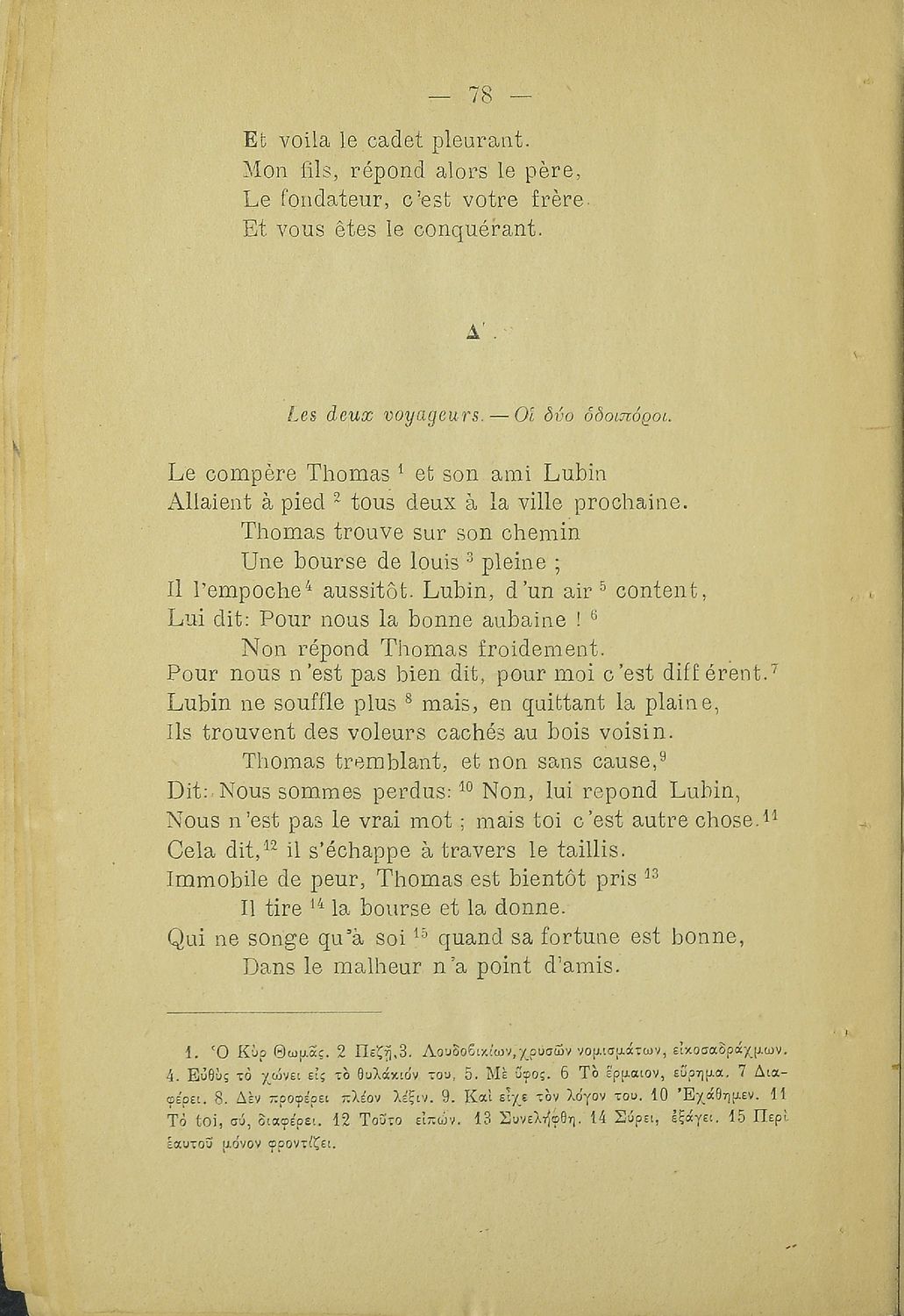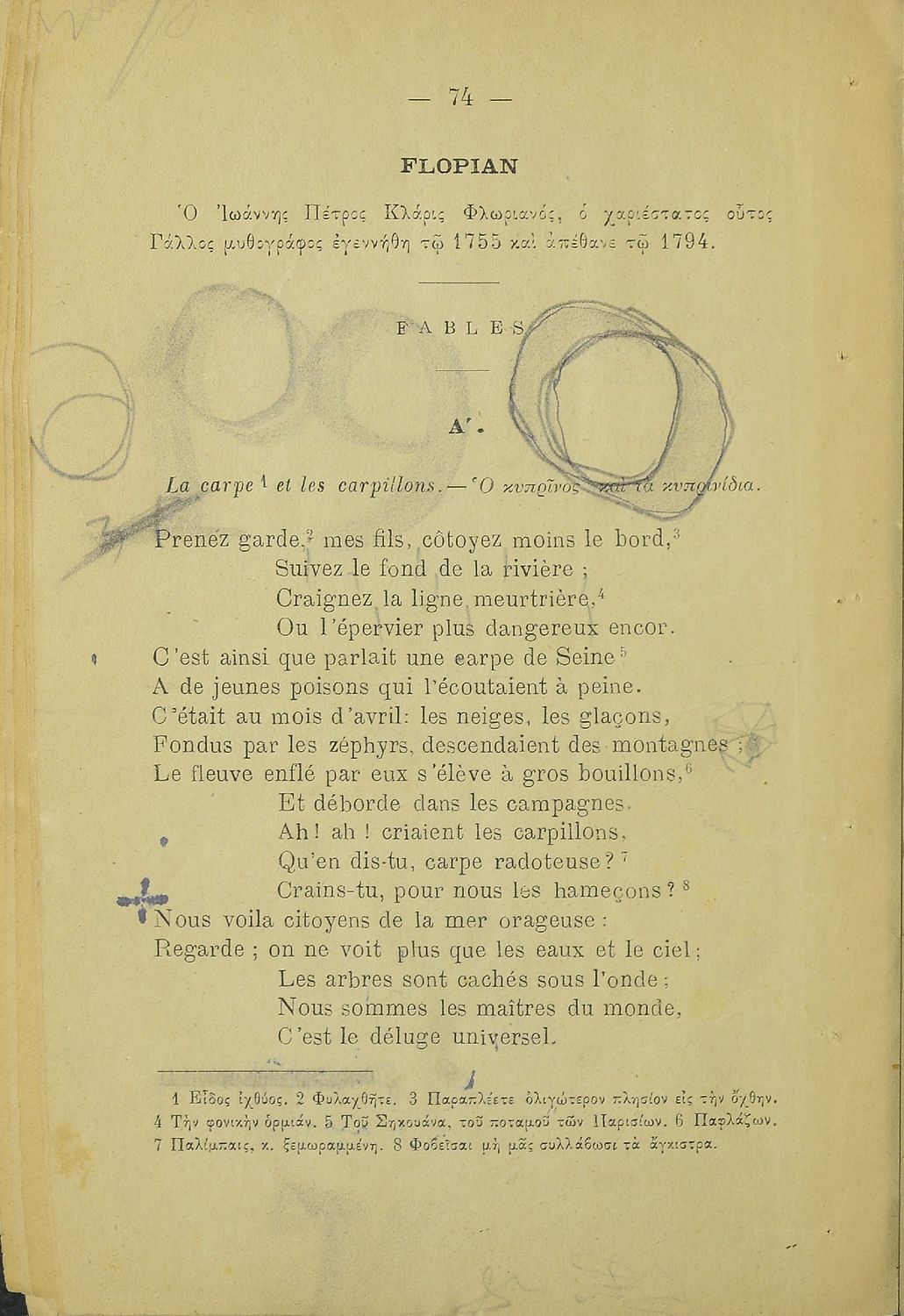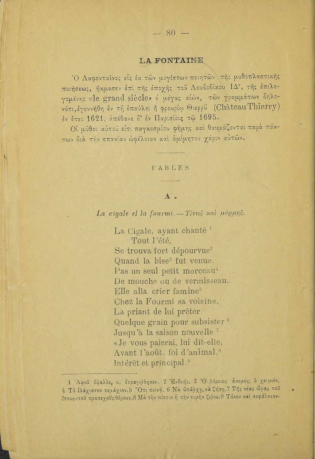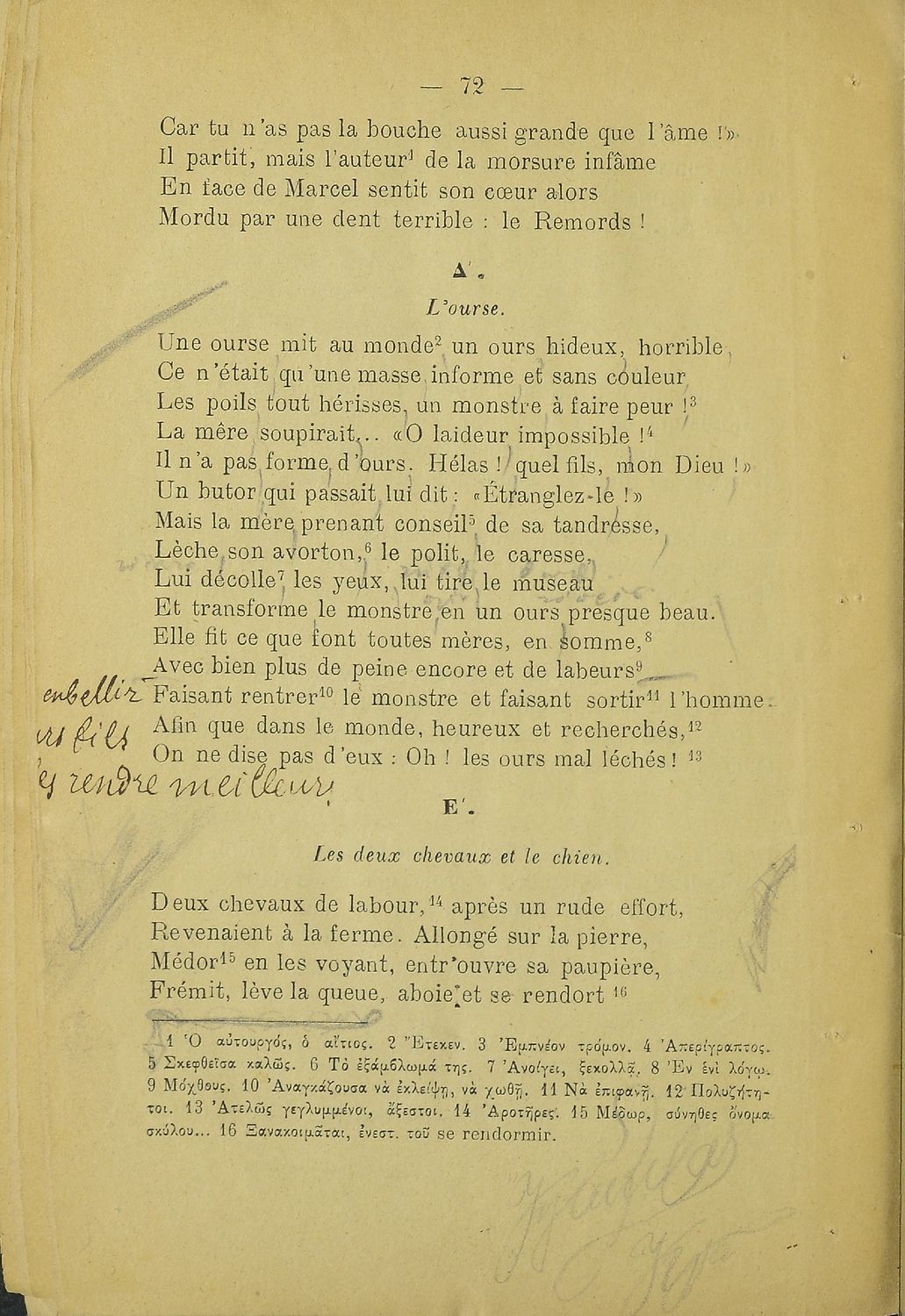 Σχολικό εγχειρίδιο Γαλλικών Β΄ Γυμνασίου και Α' Διδασκαλείου Δημοτικής Εκπαίδευσης που περιέχει σειρά ποιημάτων και πεζών Γάλλων συγγραφέων, σύντομα βιογραφικά σημειώματα, ερμηνευτικές και γλωσσικές σημειώσεις