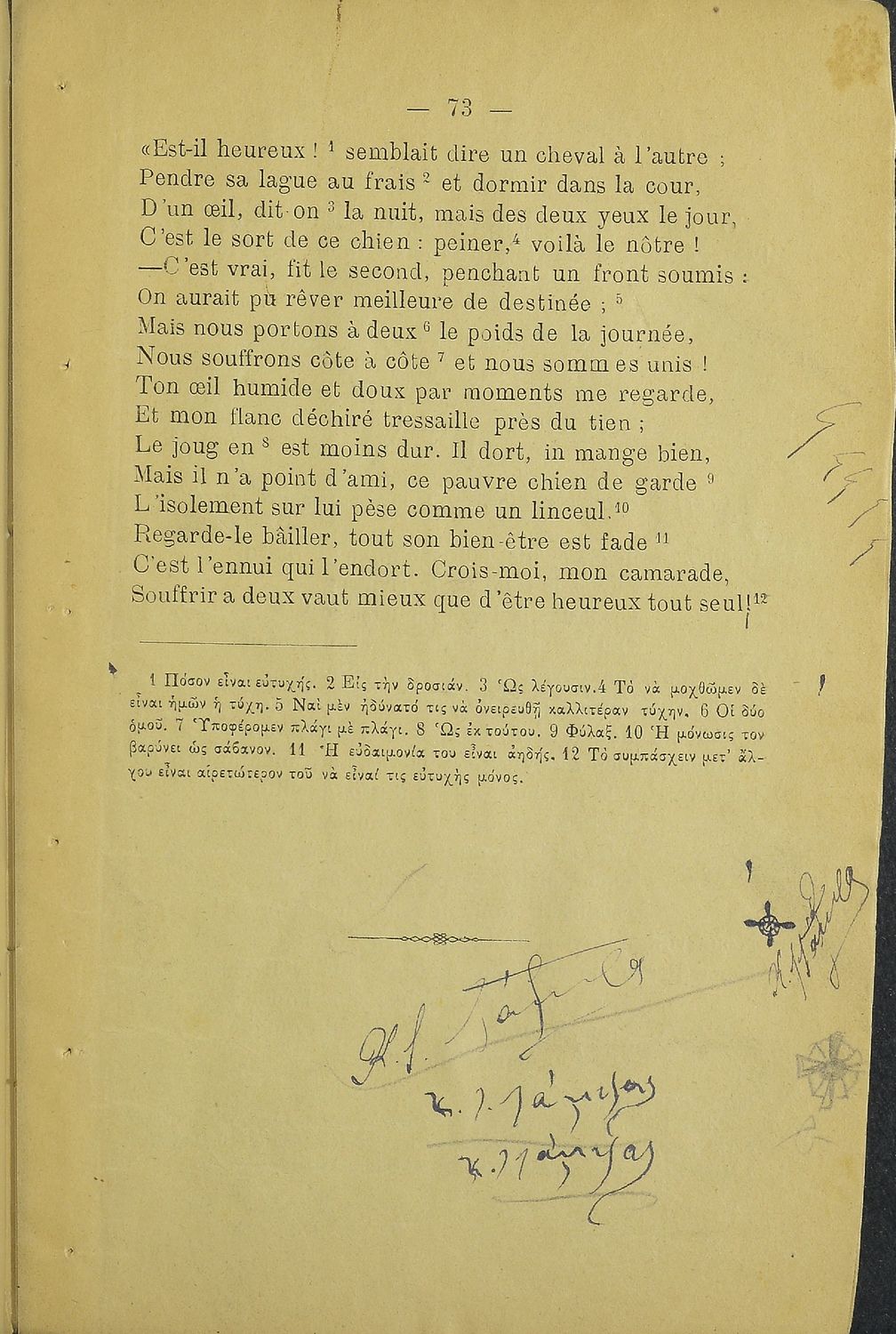 Σχολικό εγχειρίδιο Γαλλικών Γ' Γυμνασίου, Α΄ Διδασκαλείου Αρρένων και Β΄ Διδασκαλείου θηλέων που περιέχει σειρά ποιημάτων και πεζών Γάλλων συγγραφέων, σύντομα βιογραφικά σημειώματα, ερμηνευτικές και γλωσσικές ...