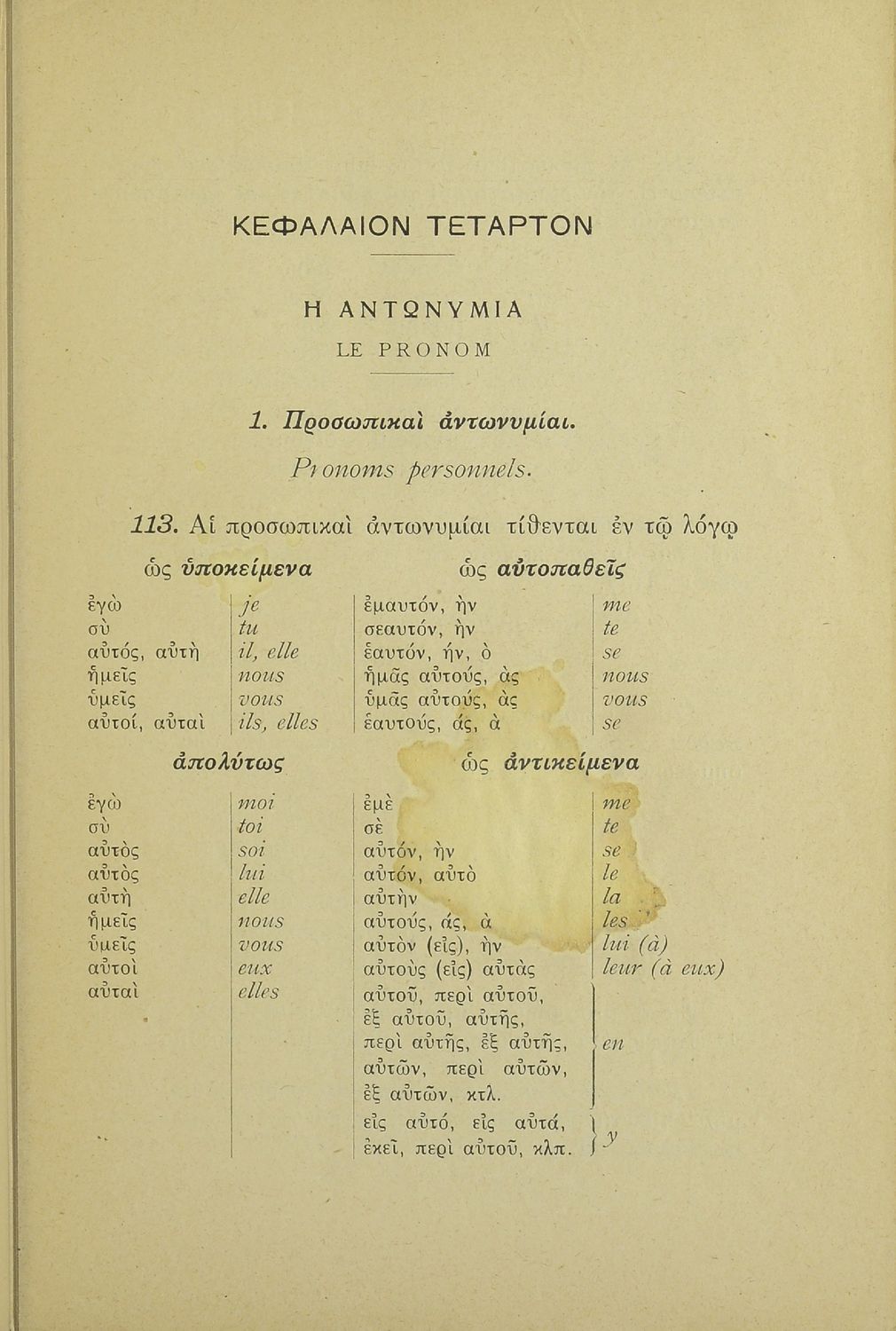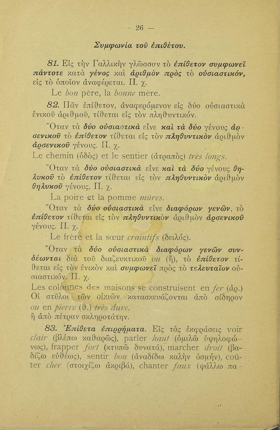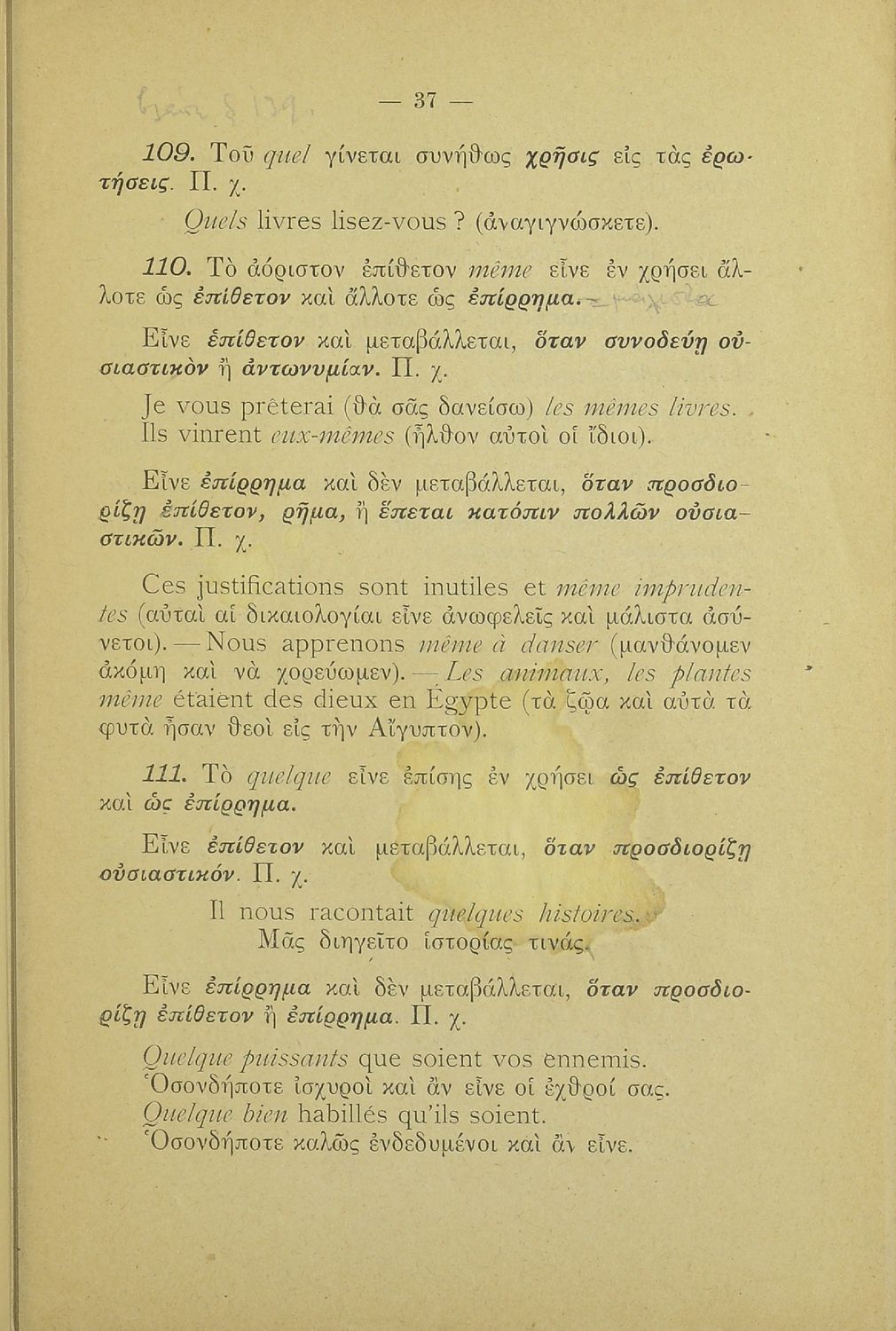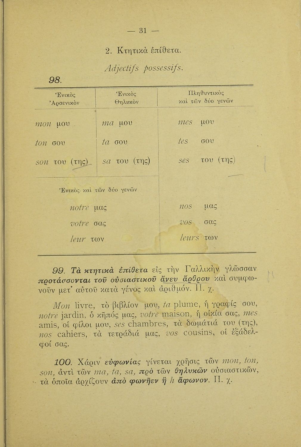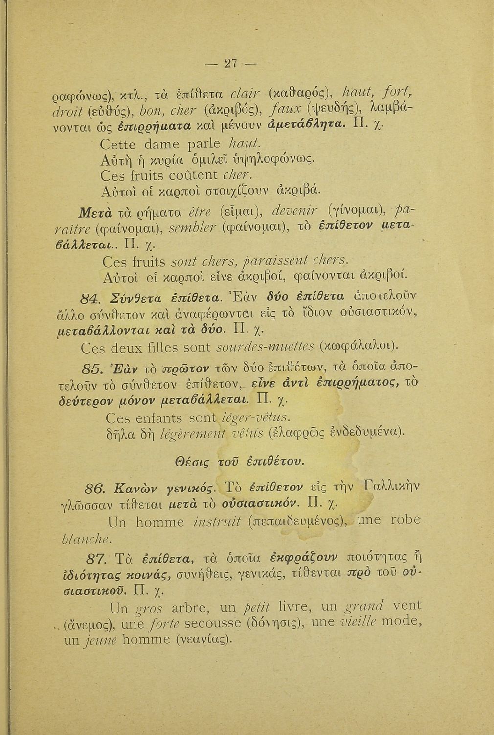 Γραμματική της Γαλλικής γλώσσας για τα Τετρατάξια Γυμνάσια, τη Γ΄ τάξη των Αστικών Σχολείων των Θηλέων και τα Διδασκαλεία της Δημοτικής Εκπαίδευσης που περιλαμβάνει θεωρία, ασκήσεις και λεξιλόγιο.