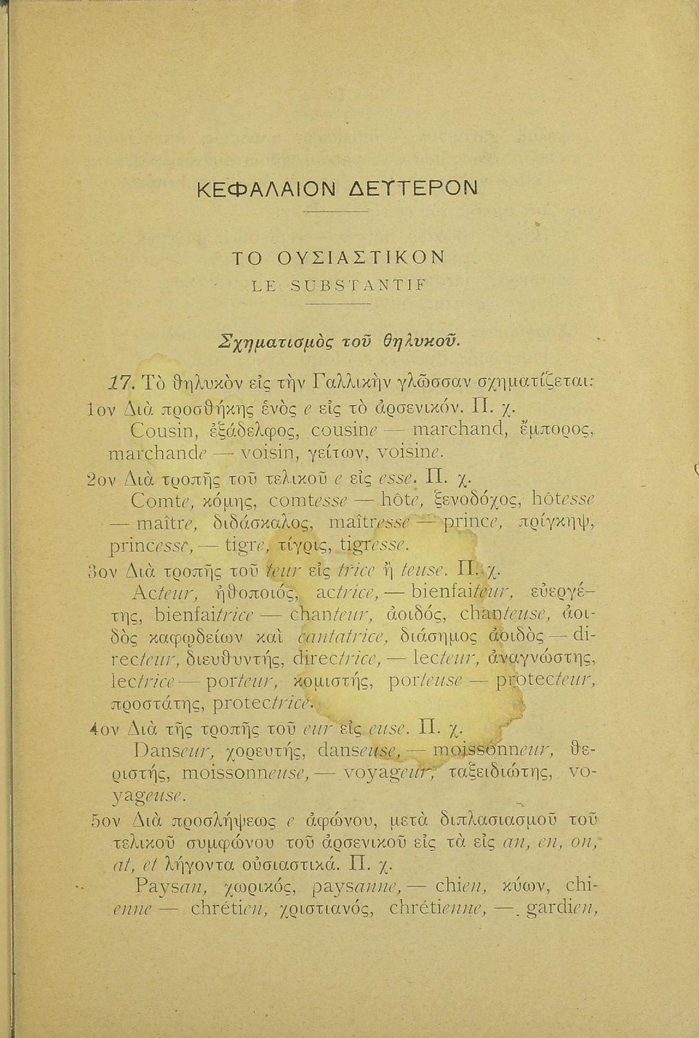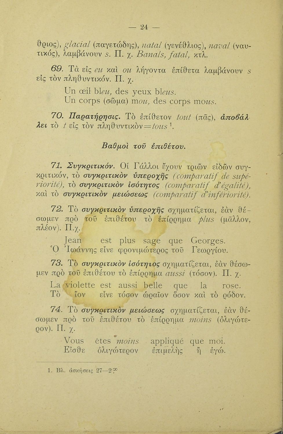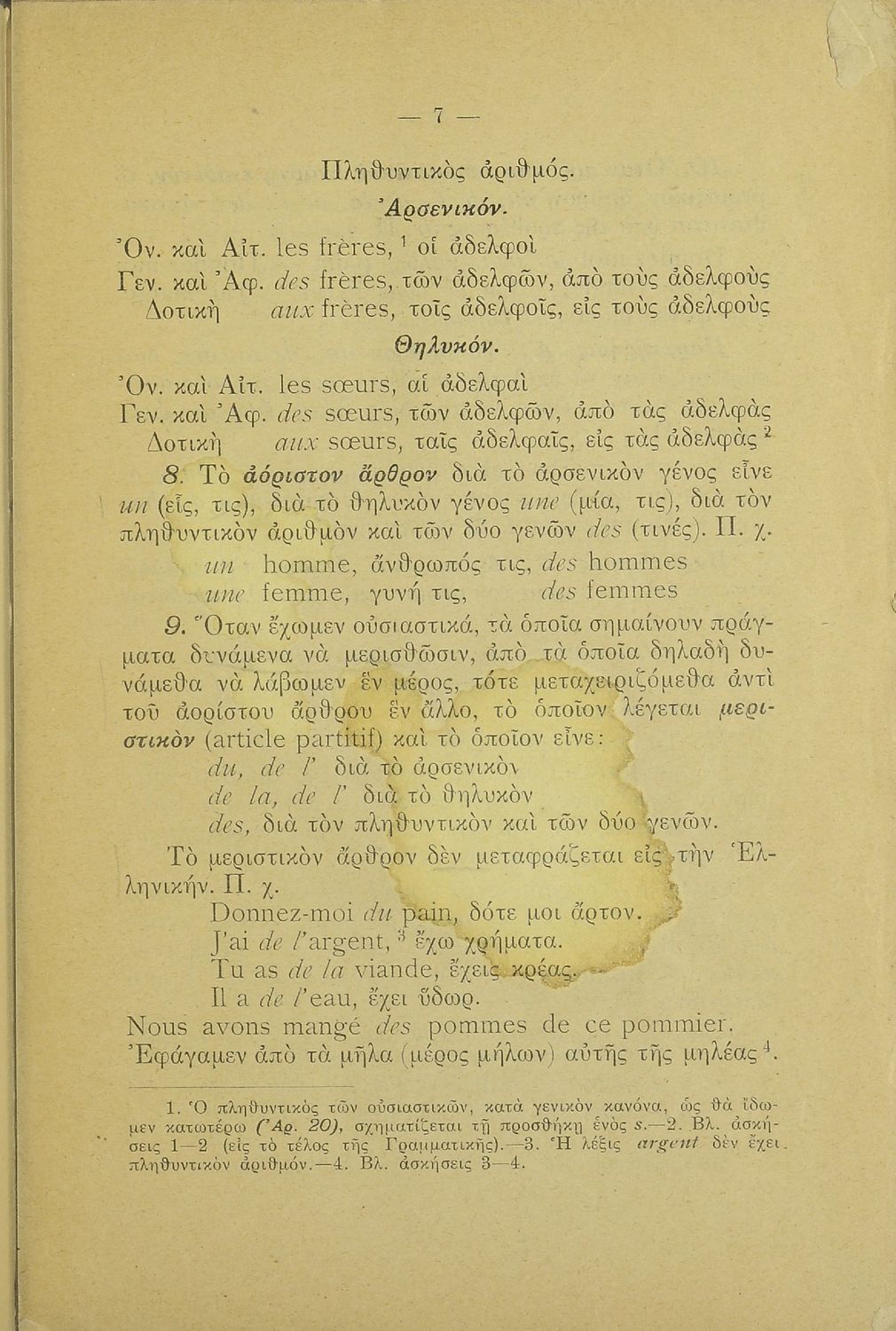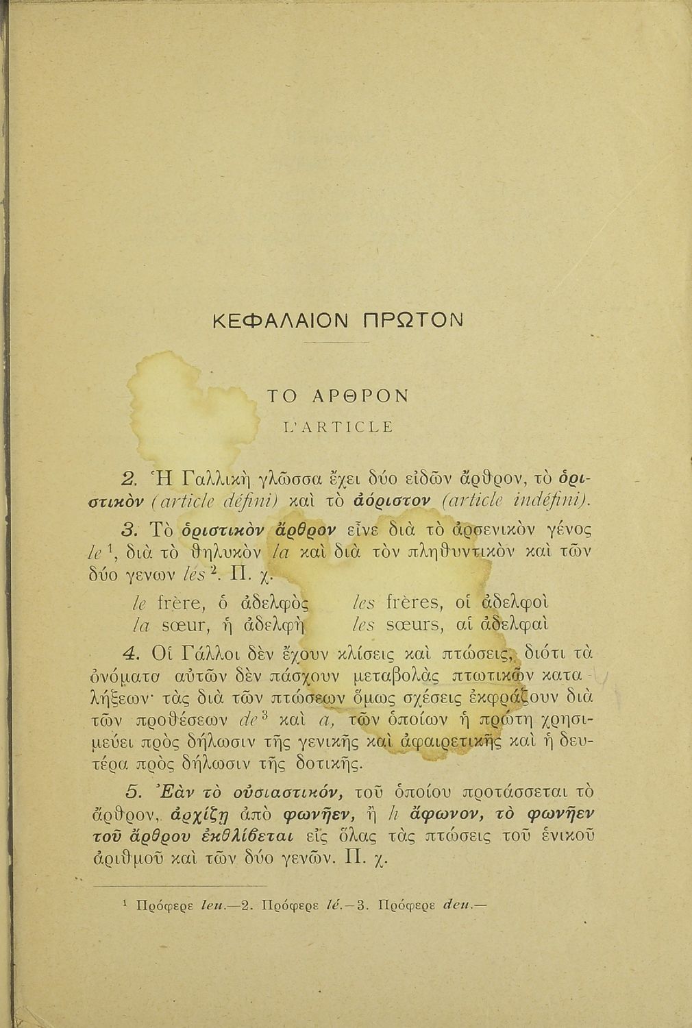 Γραμματική της Γαλλικής γλώσσας για τα Τετρατάξια Γυμνάσια, τη Γ΄ τάξη των Αστικών Σχολείων των Θηλέων και τα Διδασκαλεία της Δημοτικής Εκπαίδευσης που περιλαμβάνει θεωρία, ασκήσεις και λεξιλόγιο.