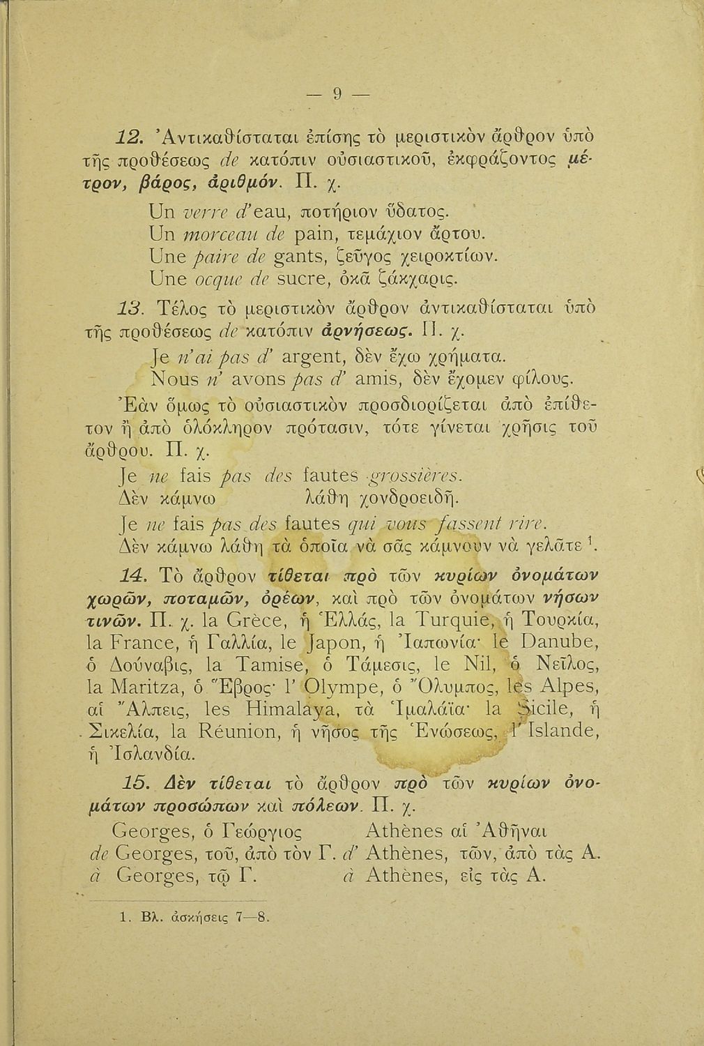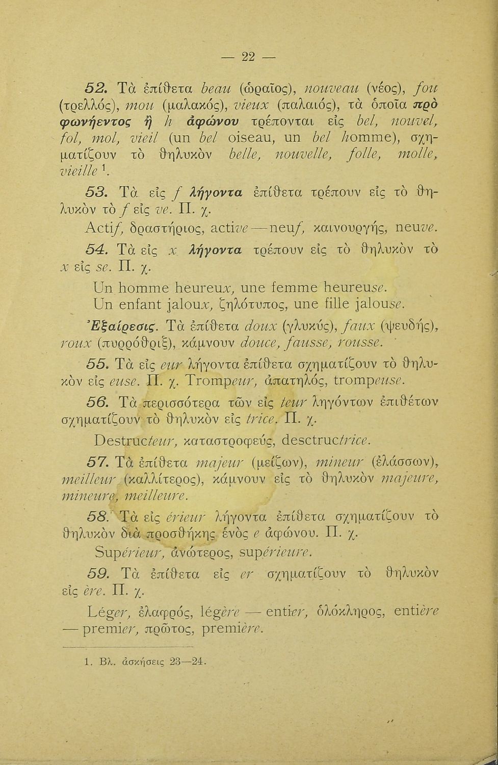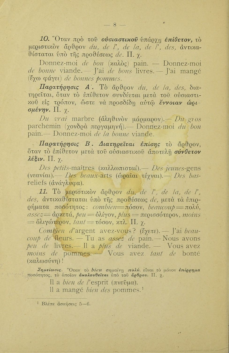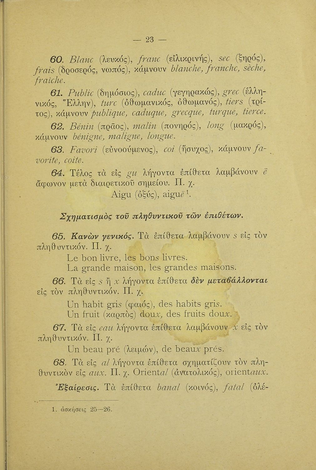 Γραμματική της Γαλλικής γλώσσας για τα Τετρατάξια Γυμνάσια, τη Γ΄ τάξη των Αστικών Σχολείων των Θηλέων και τα Διδασκαλεία της Δημοτικής Εκπαίδευσης που περιλαμβάνει θεωρία, ασκήσεις και λεξιλόγιο.