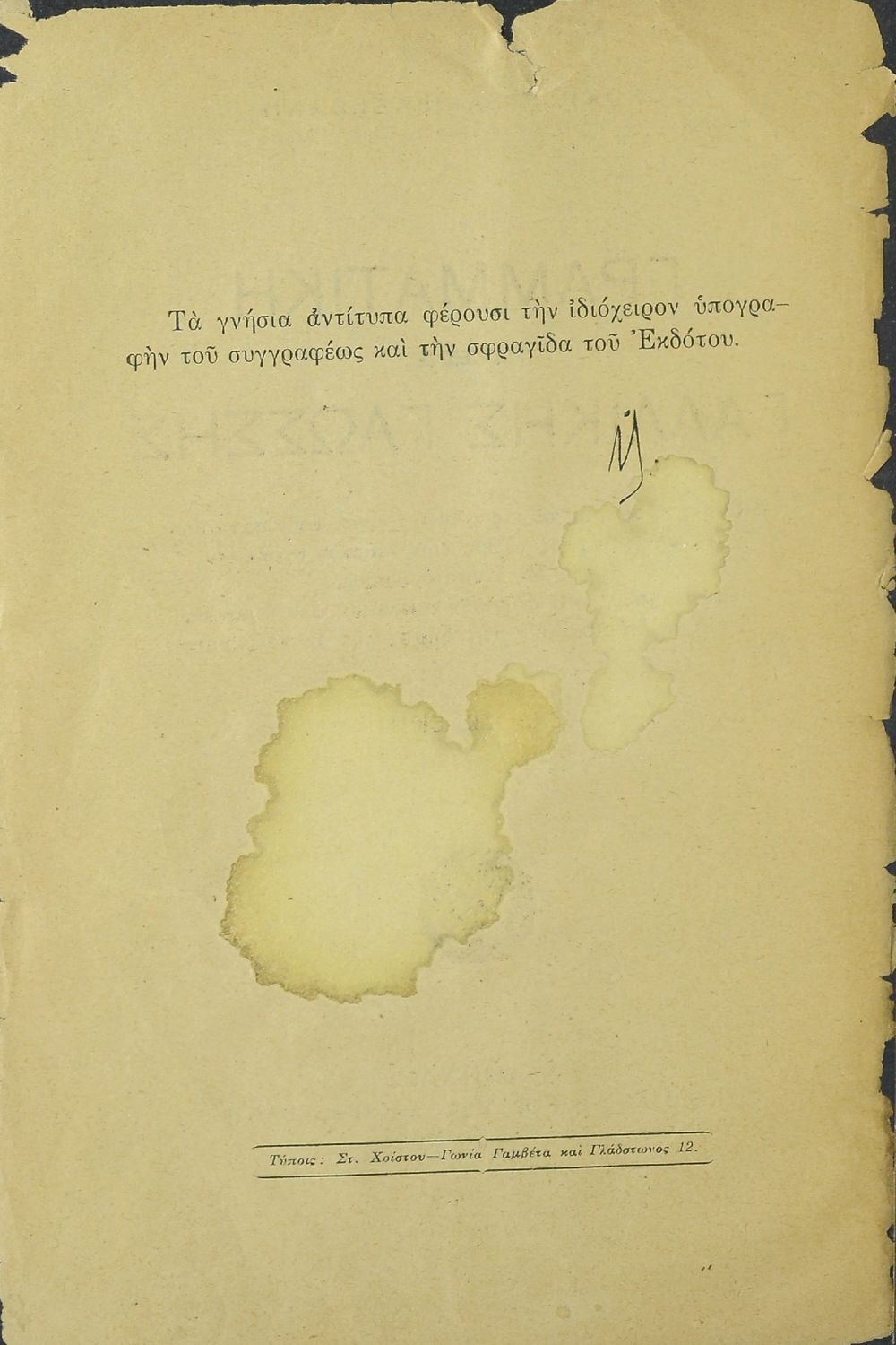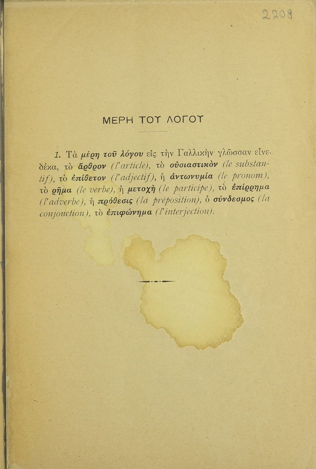 Τίτλος: Γραμματική της γαλλικής γλώσσης διά τας τέσσερας τάξεις των τετραταξίων Γυμνασίων, τας αντιστοίχους τάξεις των λοιπών σχολείων της Μ. Εκπαιδεύσεως, την Γ΄ τάξιν των Αστικών Σχολείων των θηλέων και διά τα Διδασκαλία της Δημοτικής Εκπαιδεύσεως