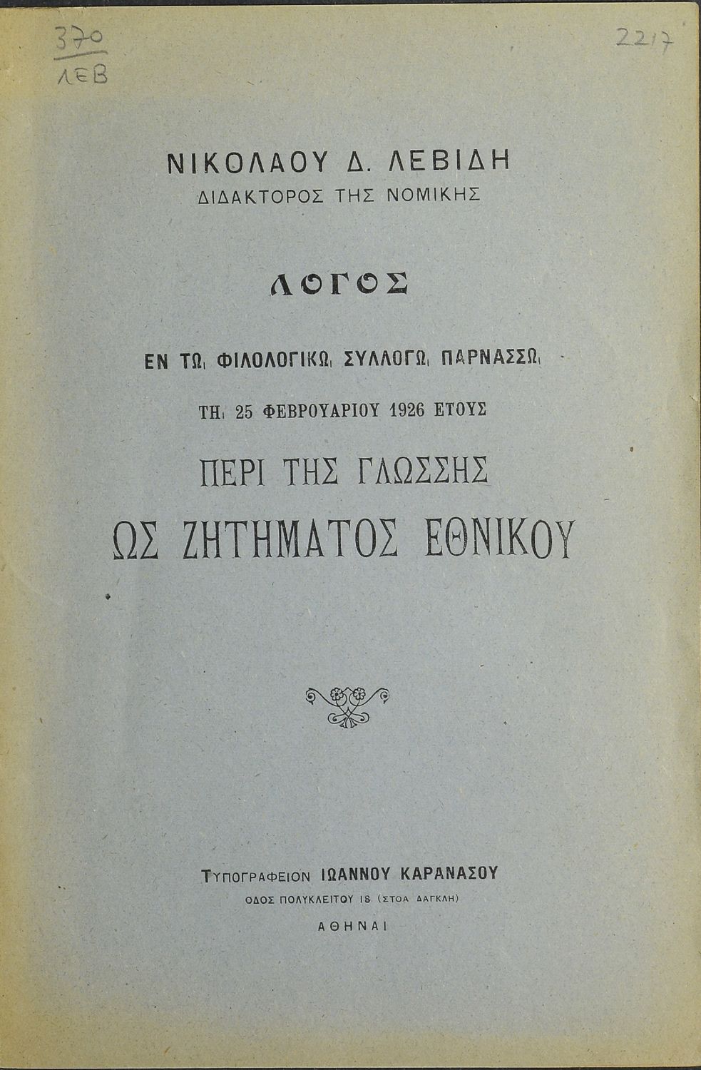 Κωδικός αναγνώρισης: 20-02217 Τίτλος: Λόγος εν τω Φιλολογικώ Συλλόγω Παρνασσώ τη 25 Φεβρουαρίου 1926 έτους περί της γλώσσης ως ζητήματος εθνικού Συγγραφέας: Νικόλαος Δ. Λεβίδης Μέγεθος και υπόστρωμα: Άλλο, 21εκ., μαλακό εξώφυλλο, 30 σελίδες. |