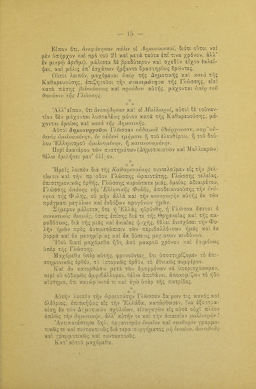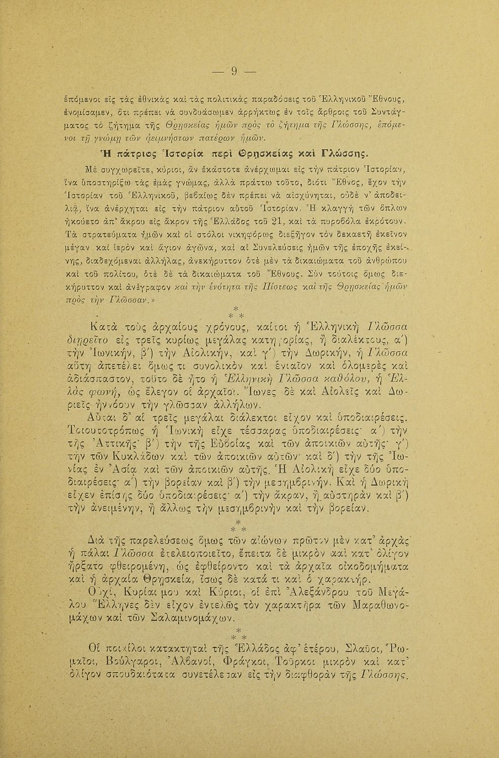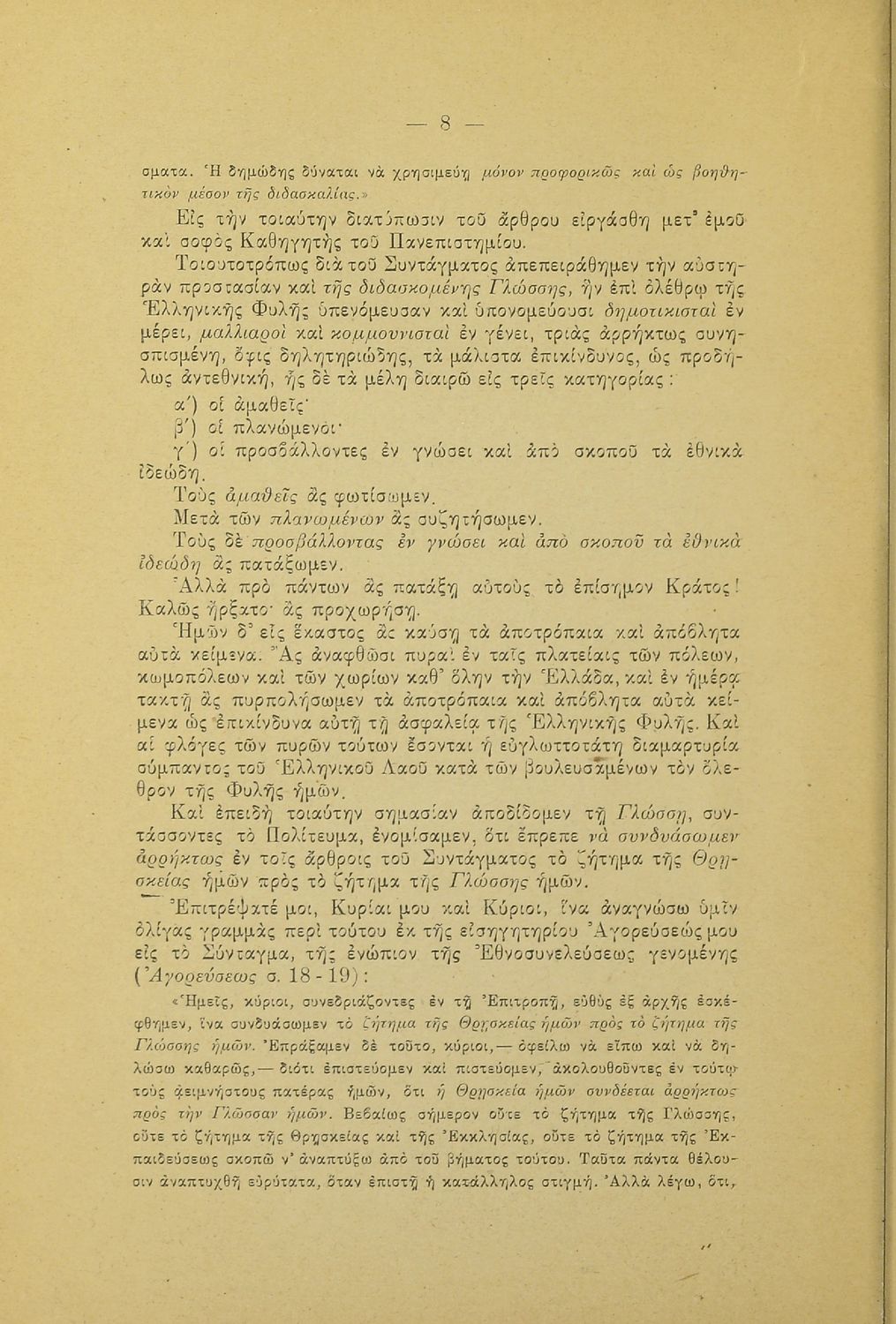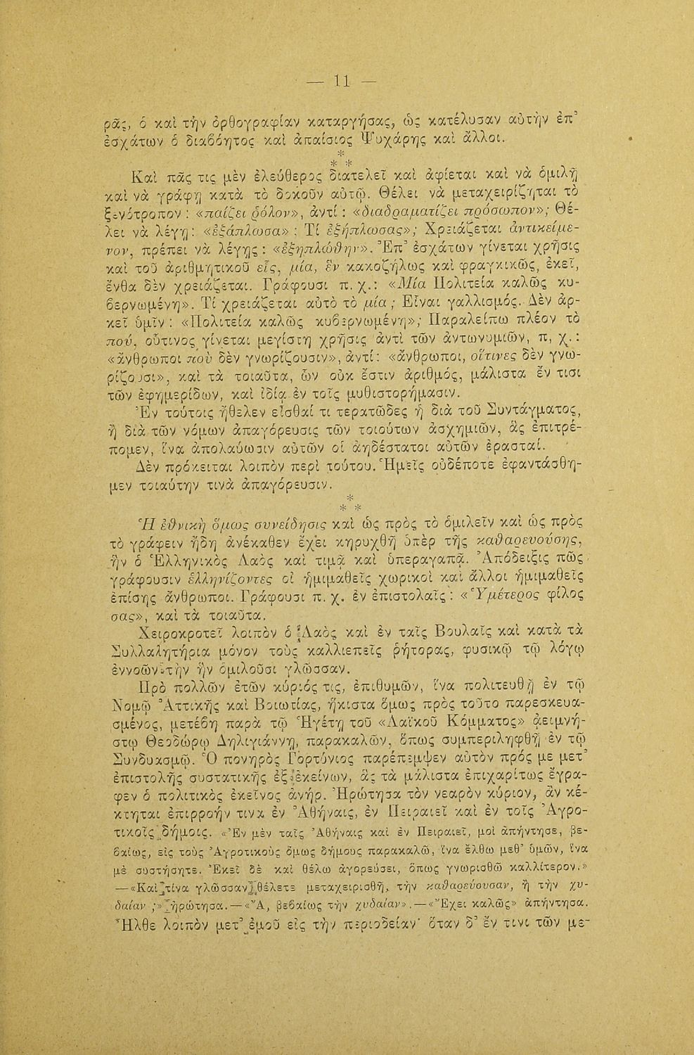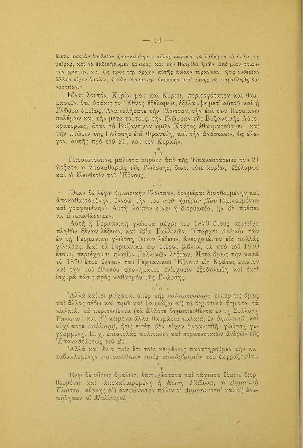Λόγος που εκφωνήθηκε στο Φιλολογικό Σύλλογο Παρνασσός σχετικά με το γλωσσικό ζήτημα από έναν υπέρμαχο της καθαρεύουσας ο οποίος αντιμετωπίζει το θέμα της γλώσσας ως εθνικό.