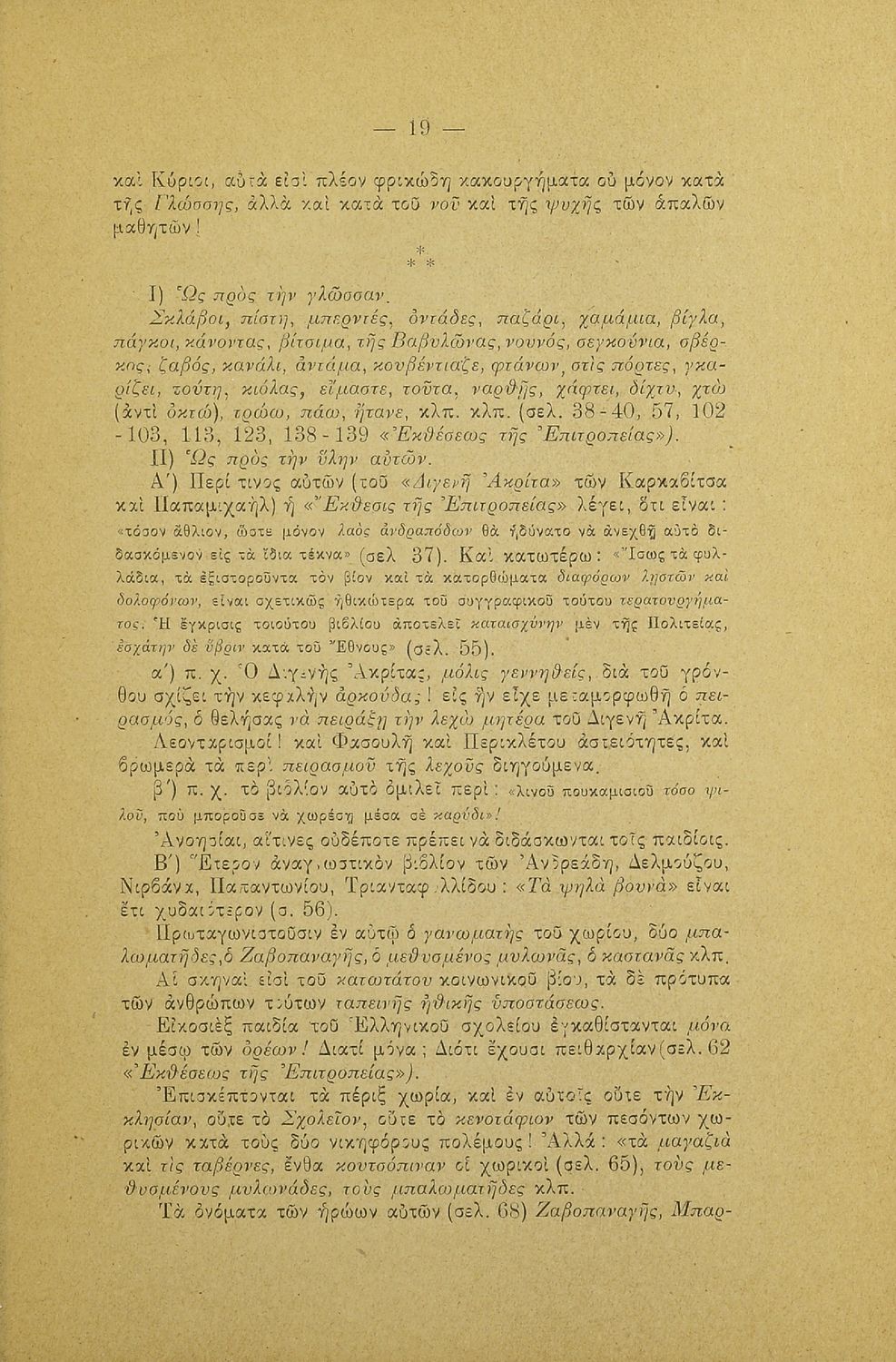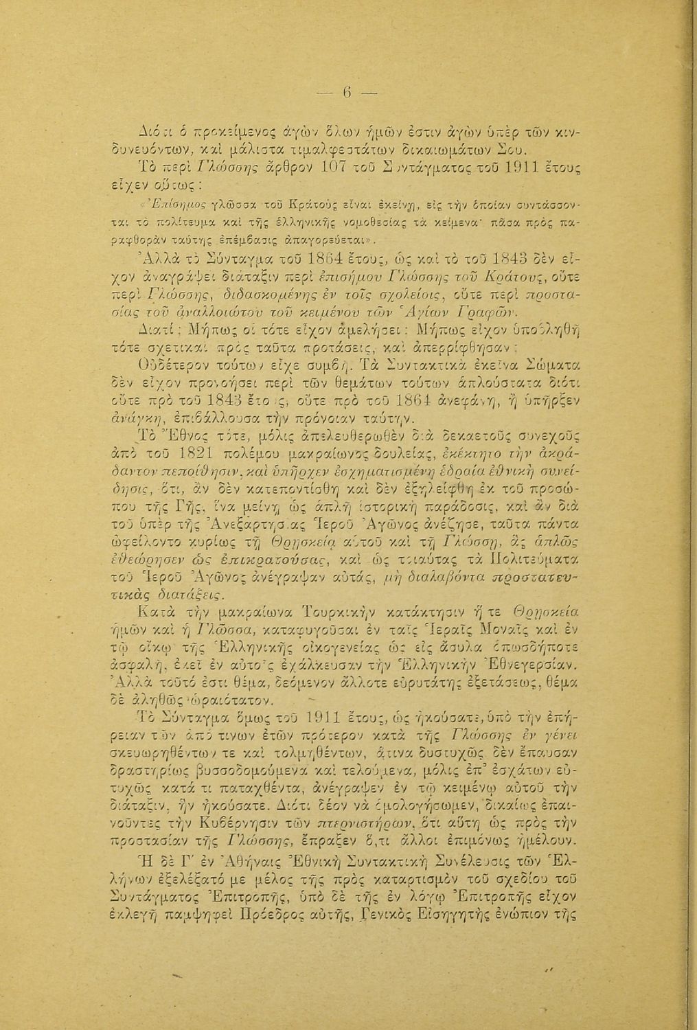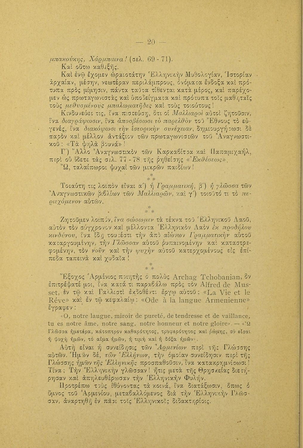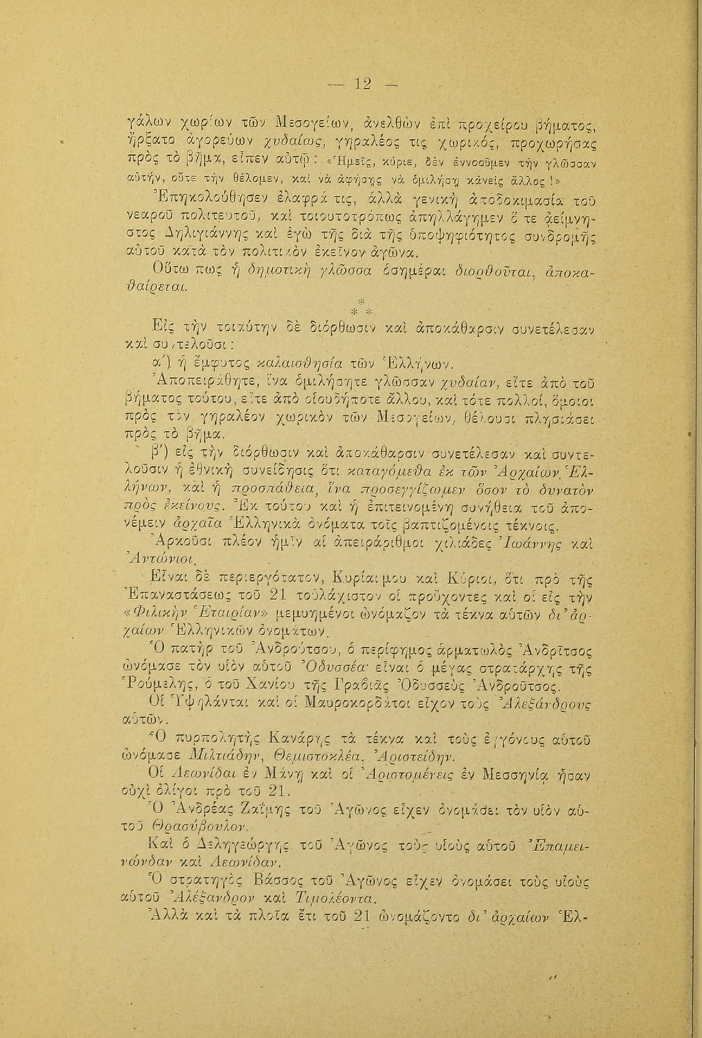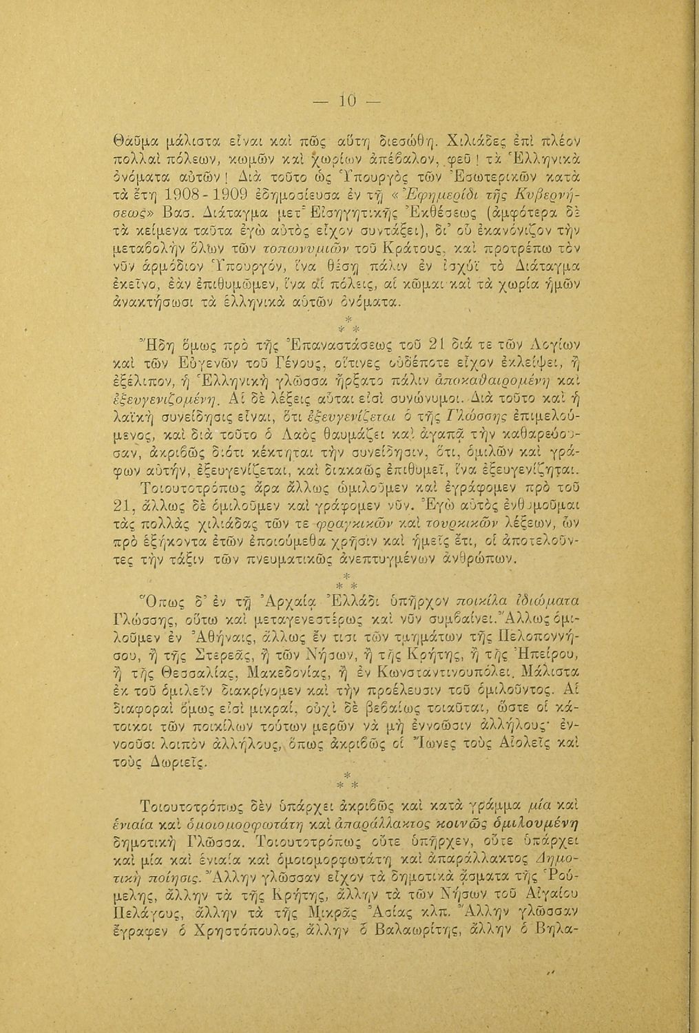 Λόγος που εκφωνήθηκε στο Φιλολογικό Σύλλογο Παρνασσός σχετικά με το γλωσσικό ζήτημα από έναν υπέρμαχο της καθαρεύουσας ο οποίος αντιμετωπίζει το θέμα της γλώσσας ως εθνικό.