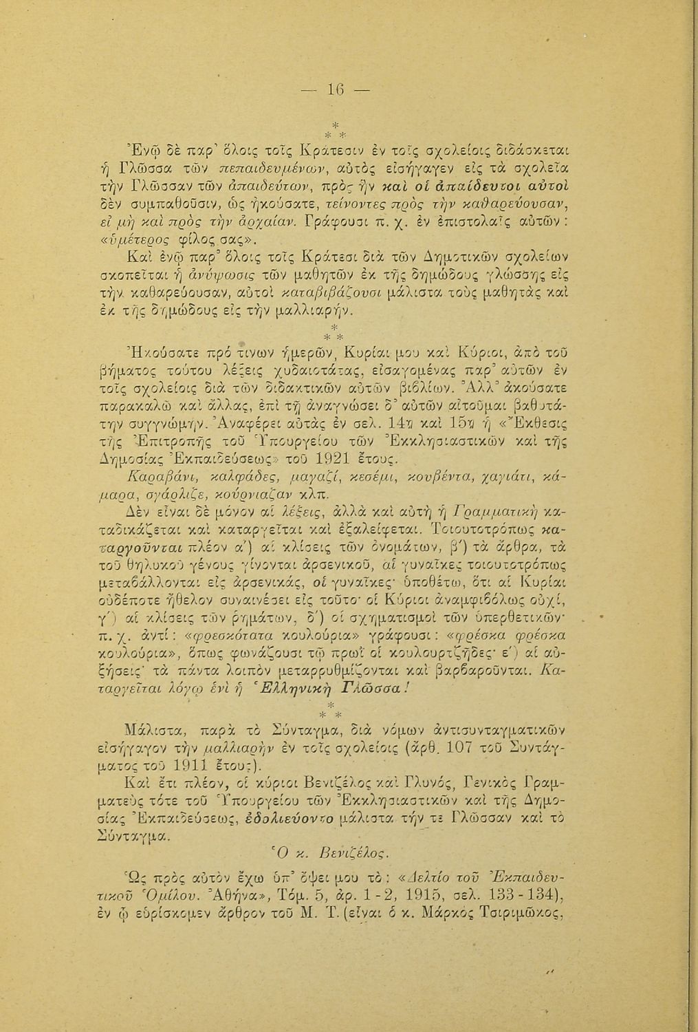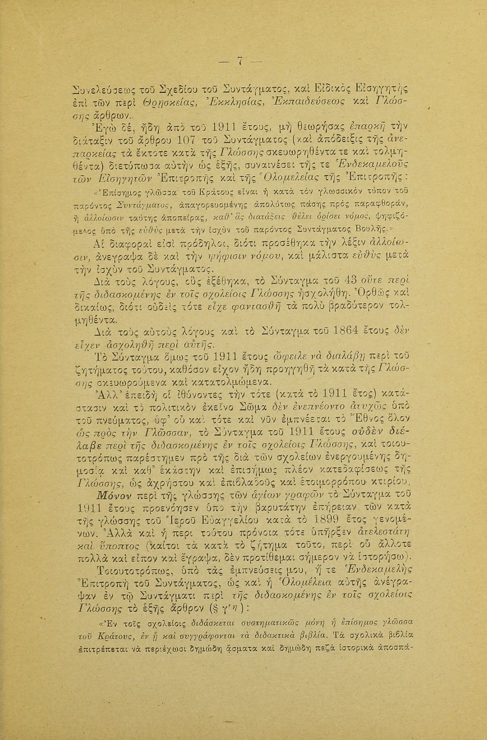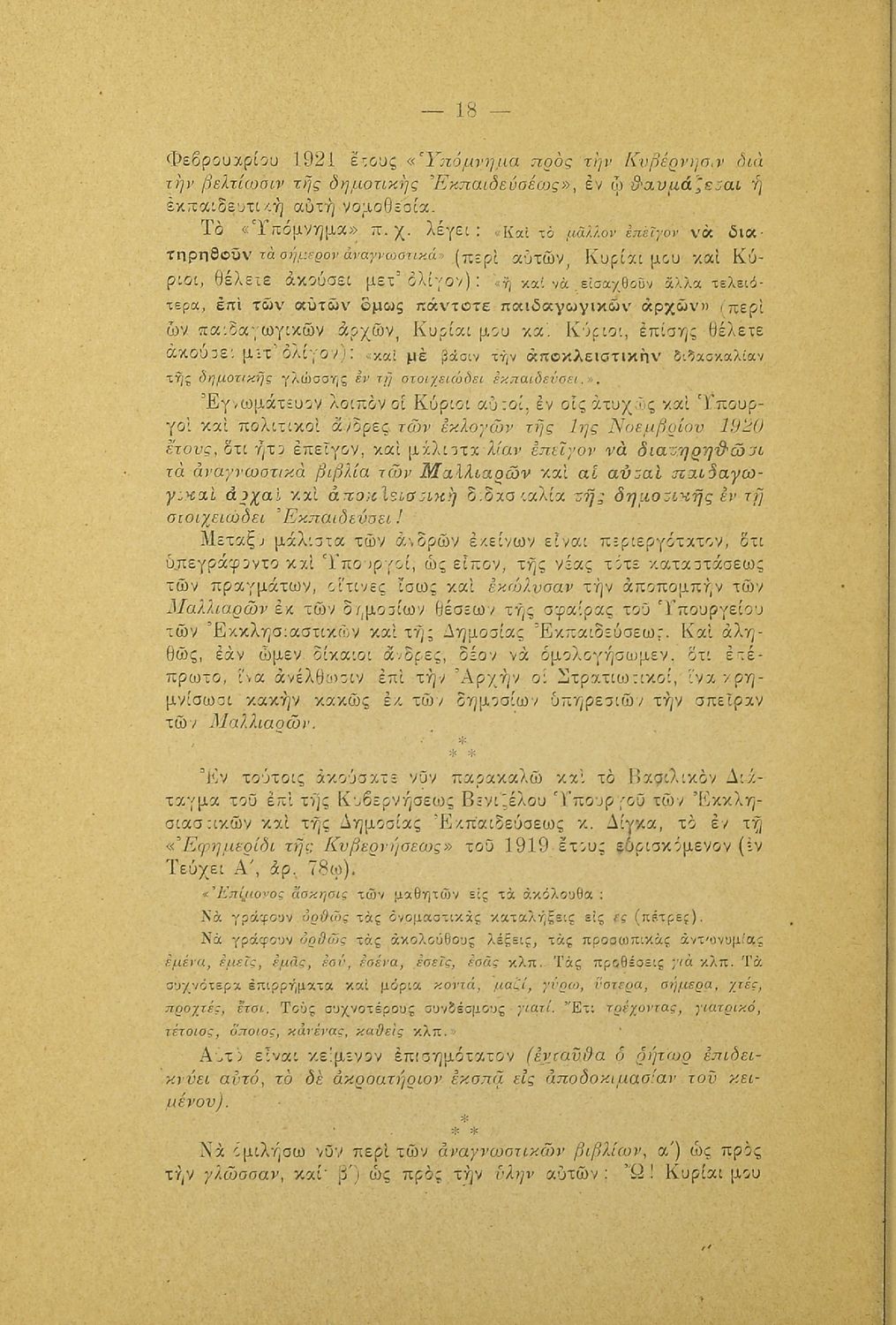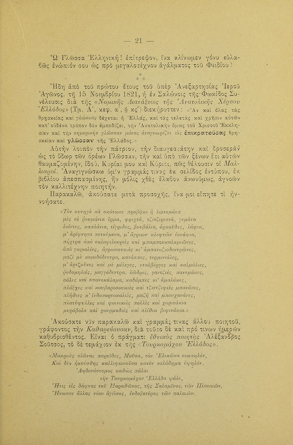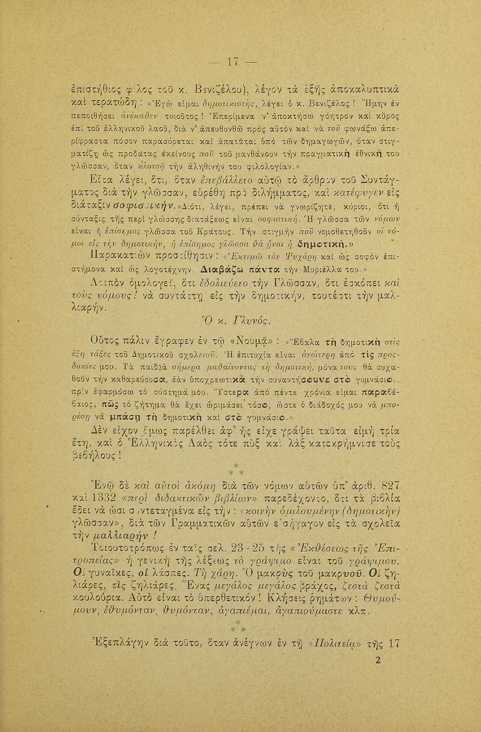 Λόγος που εκφωνήθηκε στο Φιλολογικό Σύλλογο Παρνασσός σχετικά με το γλωσσικό ζήτημα από έναν υπέρμαχο της καθαρεύουσας ο οποίος αντιμετωπίζει το θέμα της γλώσσας ως εθνικό.