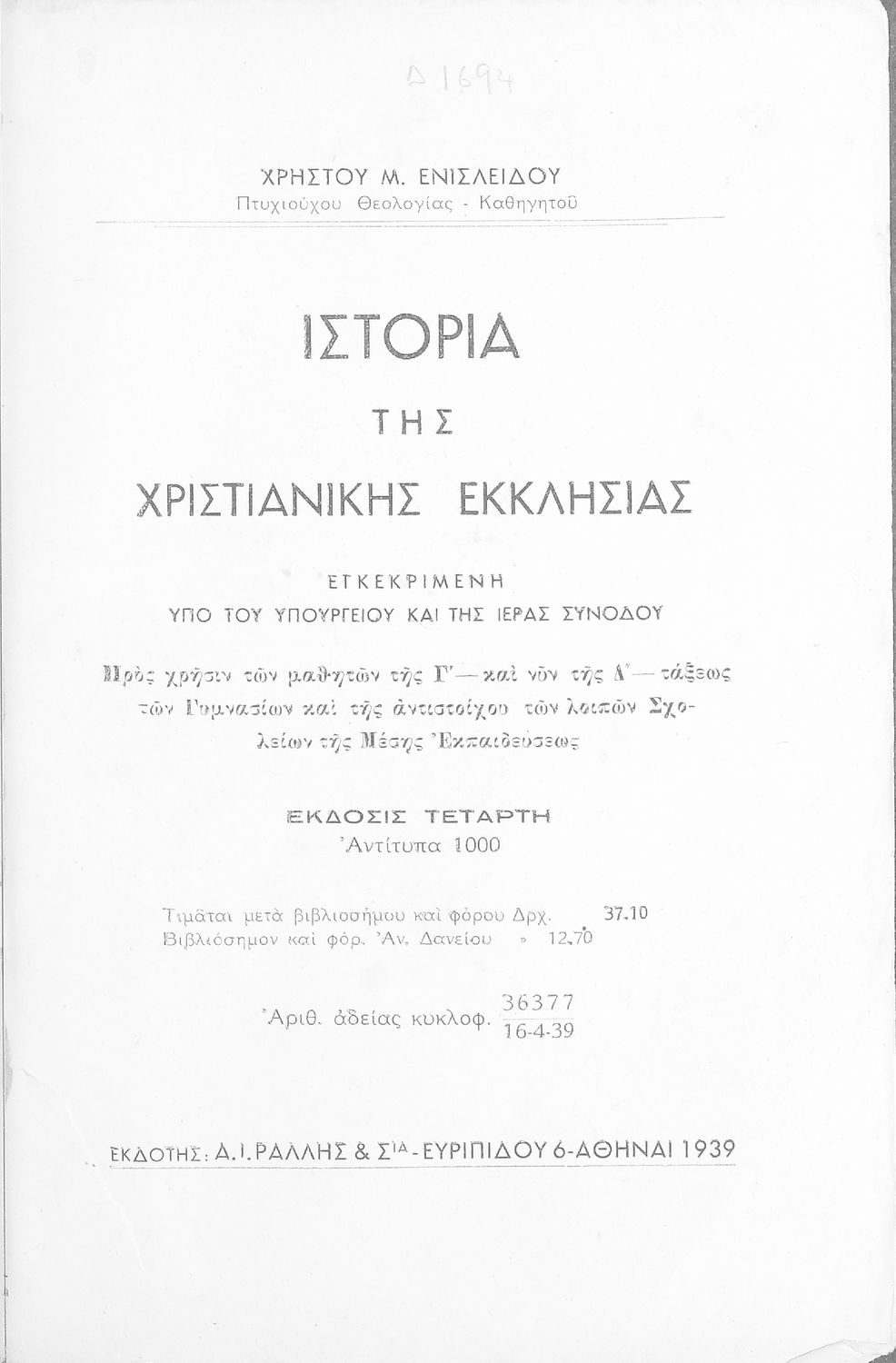 Τίτλος: Ιστορία της Χριστιανικής Εκκλησίας εγκεκριμένη υπό του υπουργείου και της Ιεράς Συνόδου προς χρήσιν των μαθητών της Γ΄ και νυν Δ΄ τάξεως των Γυμνασίων και της αντιστοίχου των λοιπών σχολείων της Μέσης Εκπαιδεύσεως