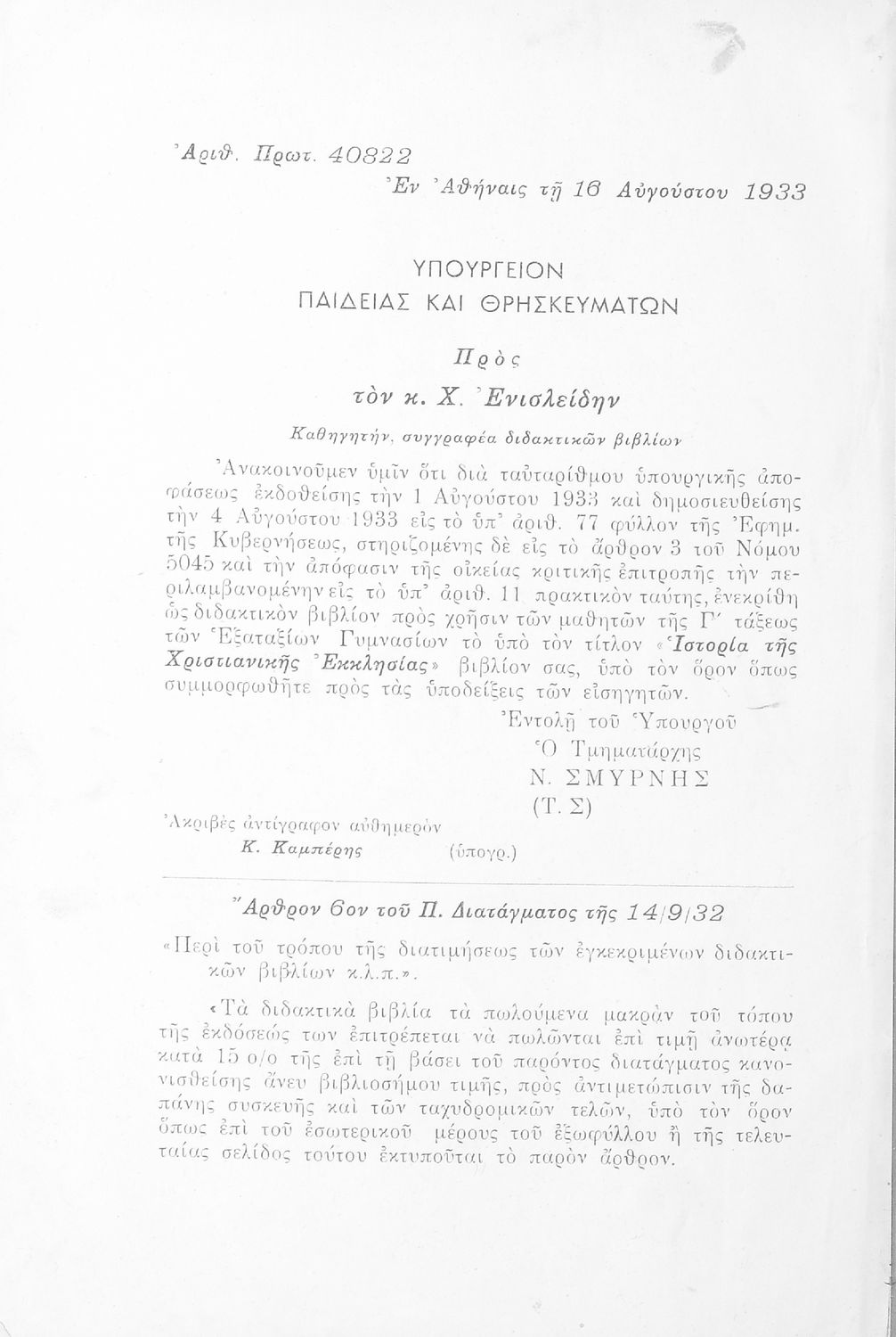 Υπουργική απόφαση / Σύμβαση: 40822/4-8-1933