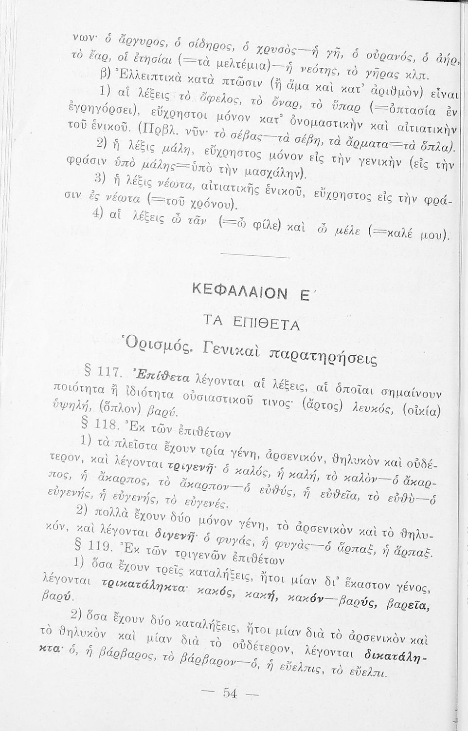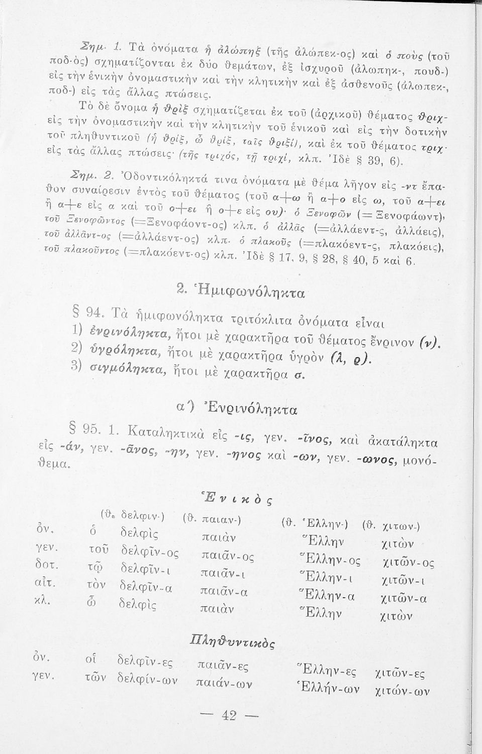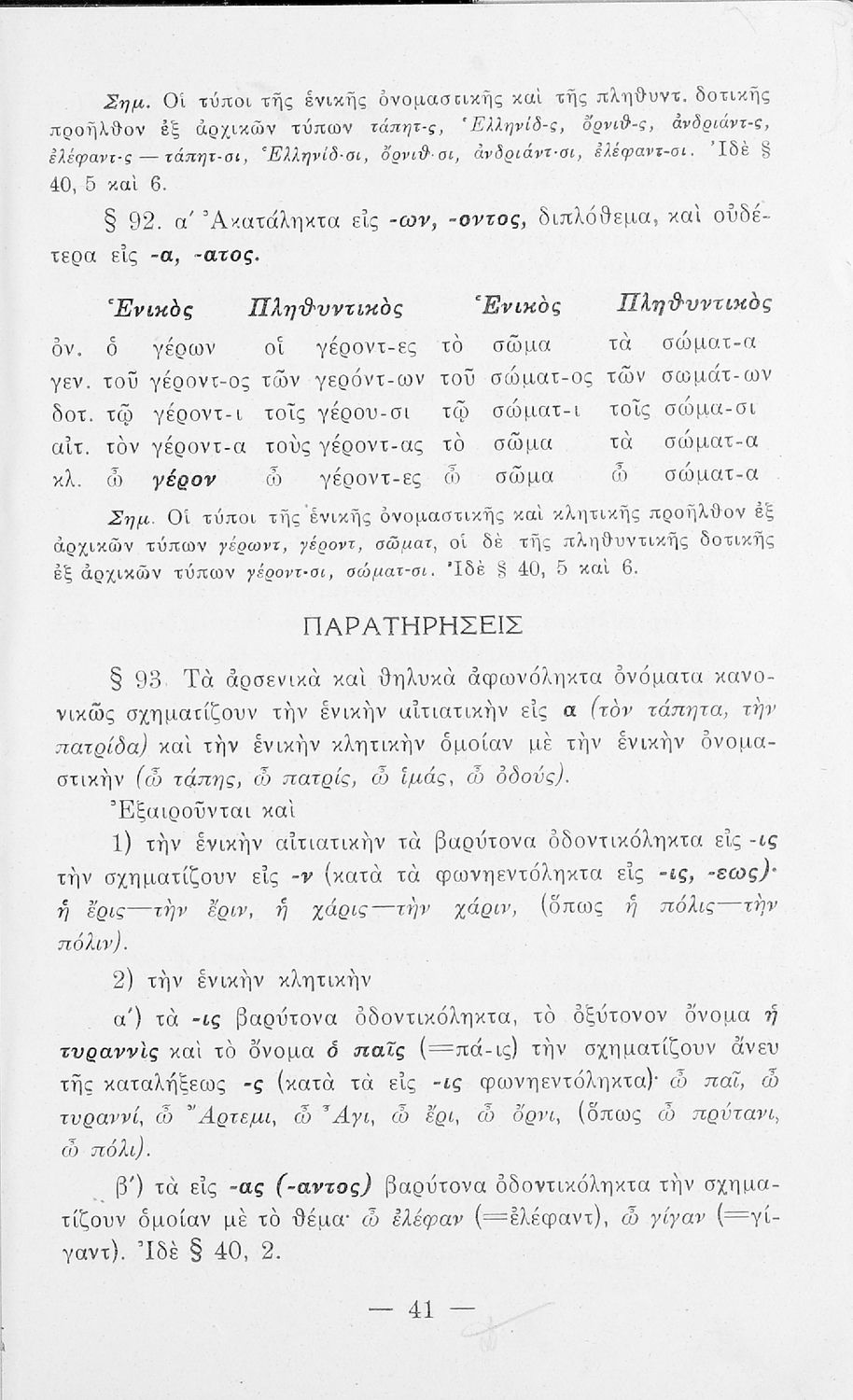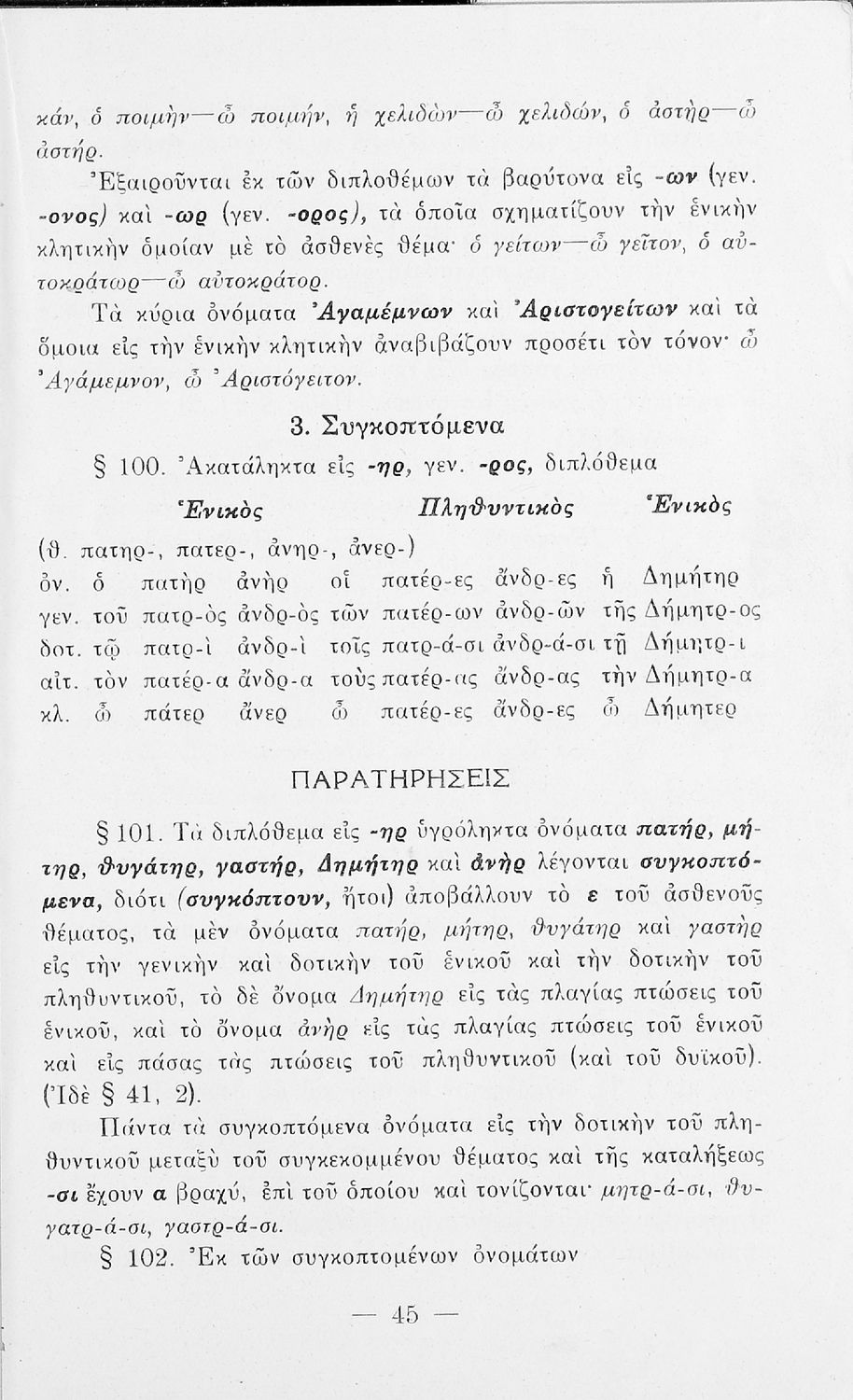 Σχολικό εγχειρίδιο Αρχαίων Ελληνικών Γυμνασίου που περιέχει τους κανόνες γραμματικής και είναι χωρισμένο σε φθογγολογικό, τυπολογικό και ετυμολογικό μέρος. Περιέχει και κατάλογο ανωμάλων ρημάτων.