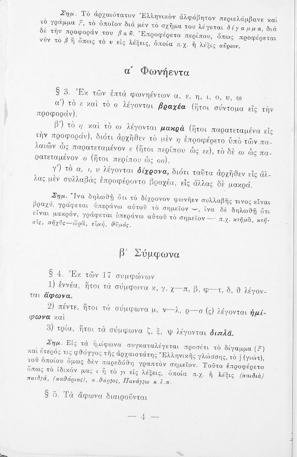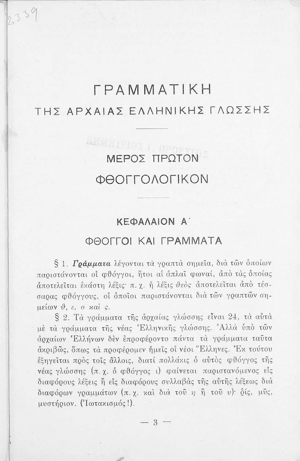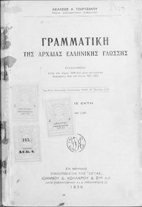 Σχολικό εγχειρίδιο Αρχαίων Ελληνικών για τα Ελληνικά Σχολεία και Παρθεναγωγεία που περιέχει τους κανόνες γραμματικής και είναι χωρισμένο σε φθογγολογικό, τυπολογικό και ετυμολογικό μέρος.