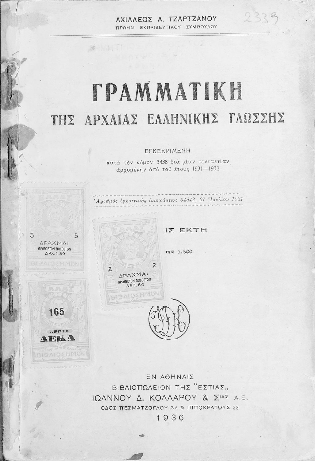 Τίτλος: Γραμματική της αρχαίας ελληνικής γλώσσης εγκεκριμένη κατά τον νόμον 3438 διά μίαν πενταετίαν αρχόμενην από του έτους 1931-1932