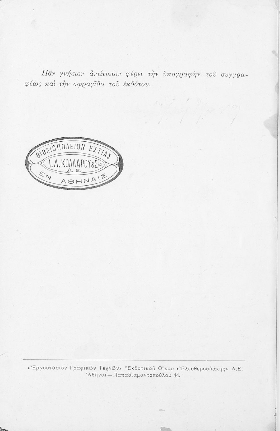 Εκδότης: Ιωάννης Δ. Κολλάρος, Βιβλιοπωλείο της "Εστίας"