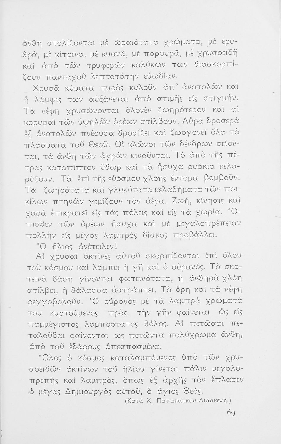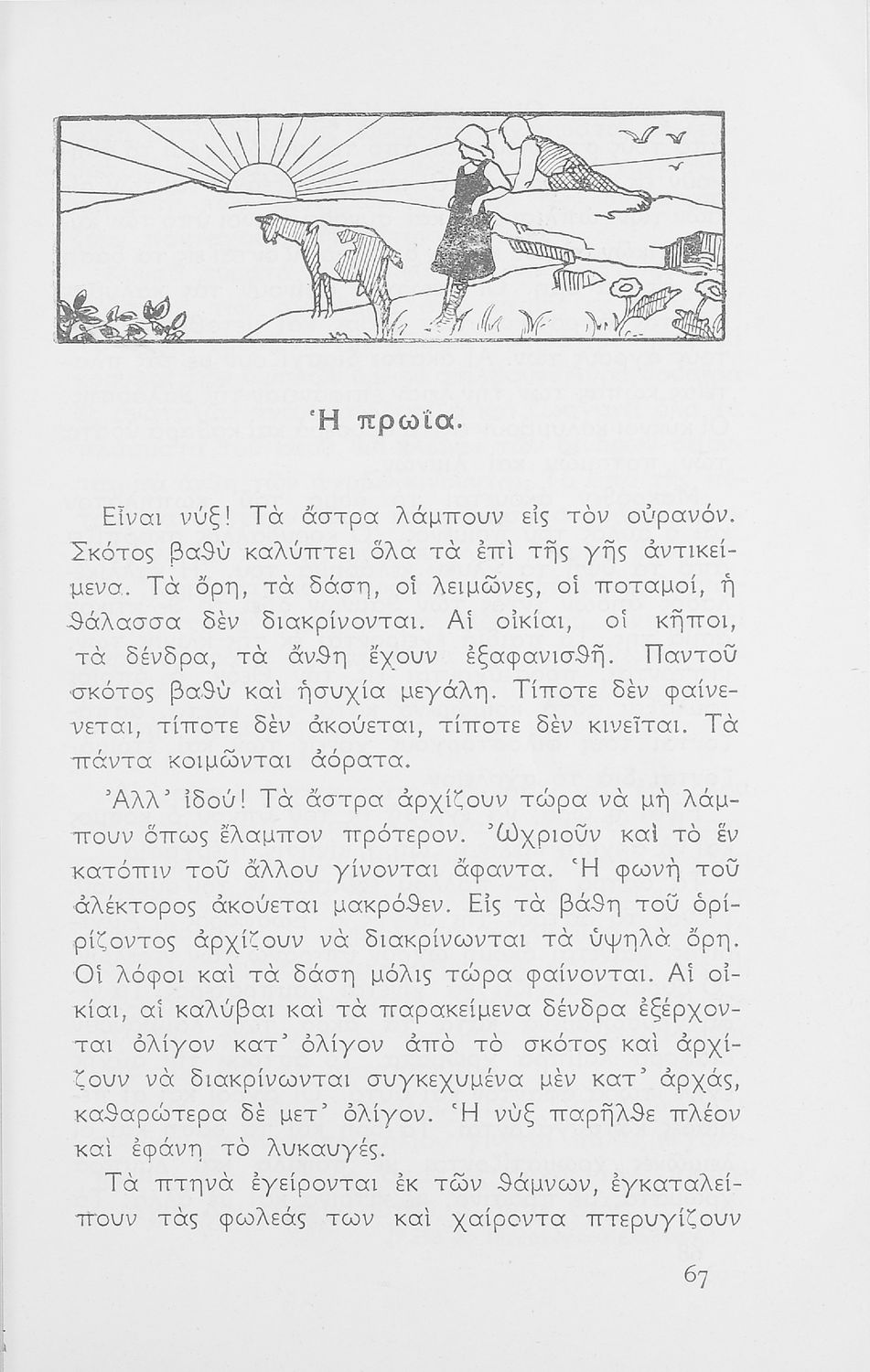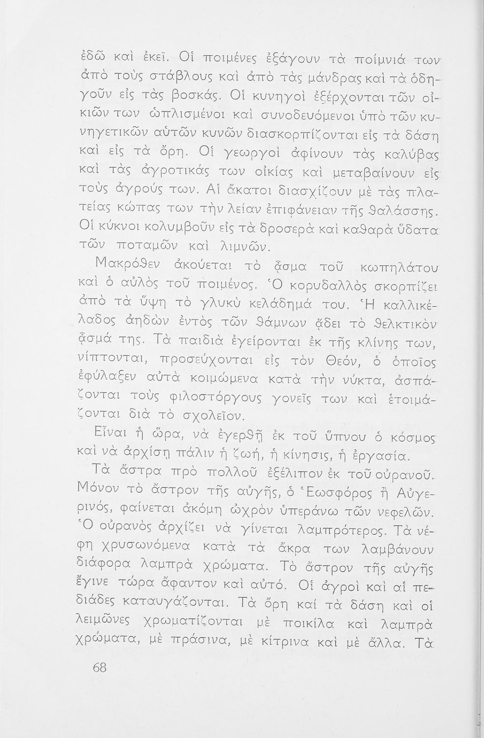 Αναγνωστικό Ε΄ Δημοτικού που περιλαμβάνει πεζογραφήματα εμπνευσμένα από την ελληνική φύση, την αγροτική ζωή και από το τρίπτυχο "Πατρίς- θρησκεία- οικογένεια".