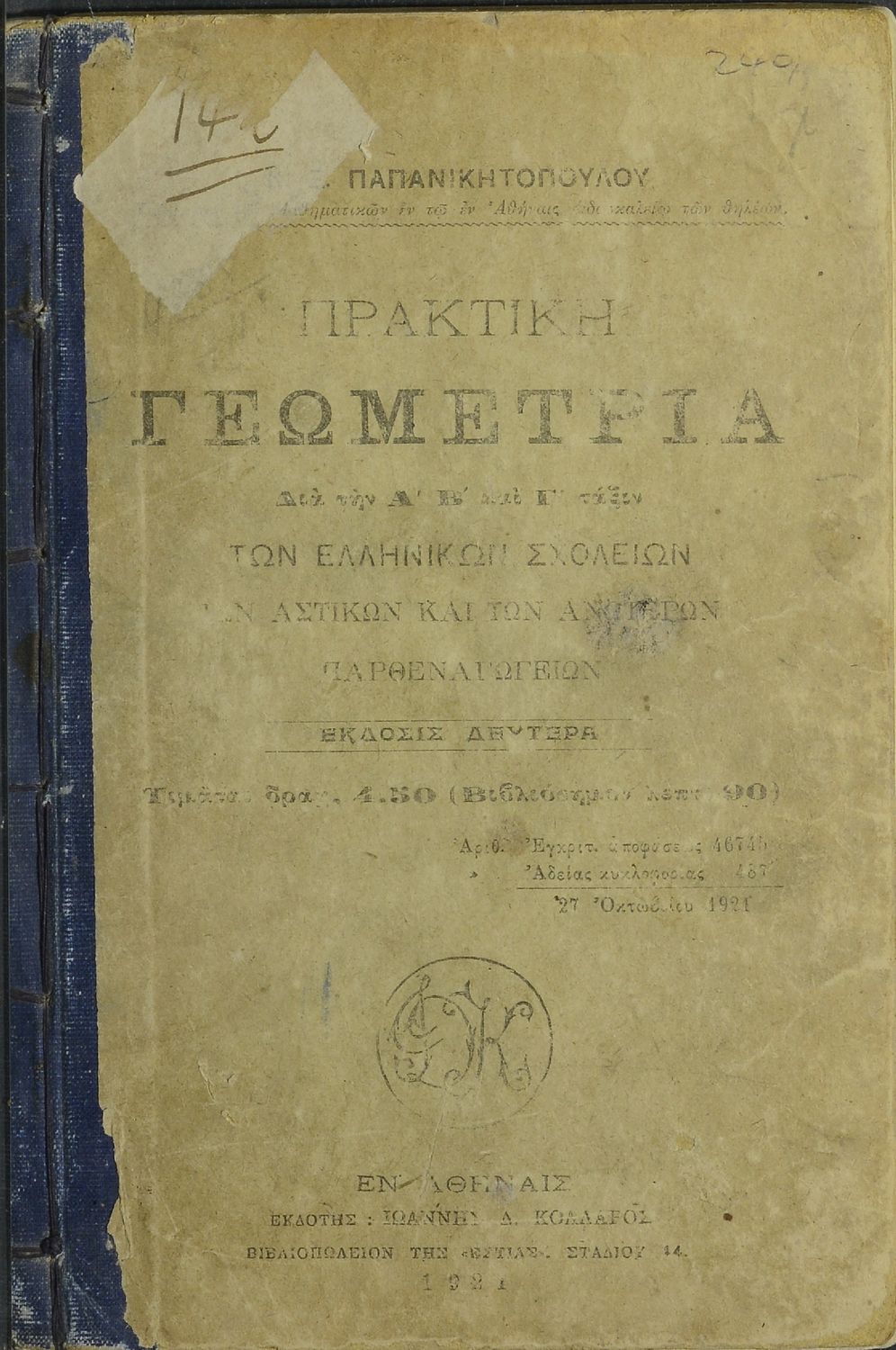 Τίτλος: Πρακτική γεωμετρία διά την Α΄, Β΄, Γ΄ τάξιν των Ελληνικών Σχολείων, Αστικών και των Ανωτέρων Παρθεναγωγείων