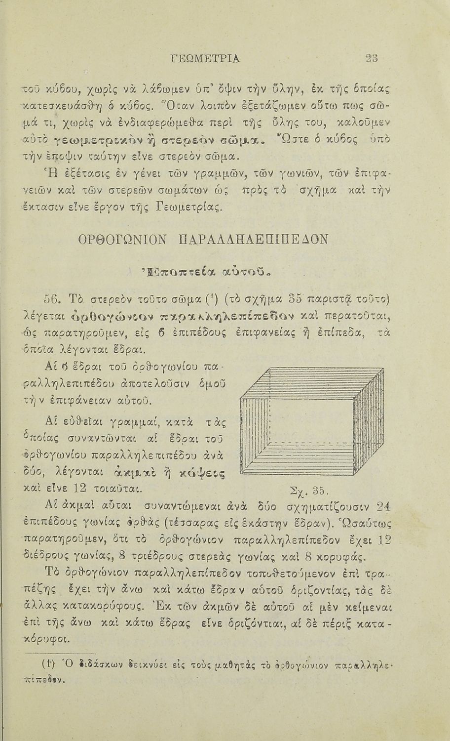Σχολικό εγχειρίδιο Γεωμετρίας για τα Ελληνικά και Αστικά Σχολεία και τα Παρθεναγωγεία που εστιάζει στα γεωμετρικά σχήματα και σώματα και τη μέτρησή τους με τη χρήση γεωμετρικών οργάνων. Περιέχει πίνακα των ...