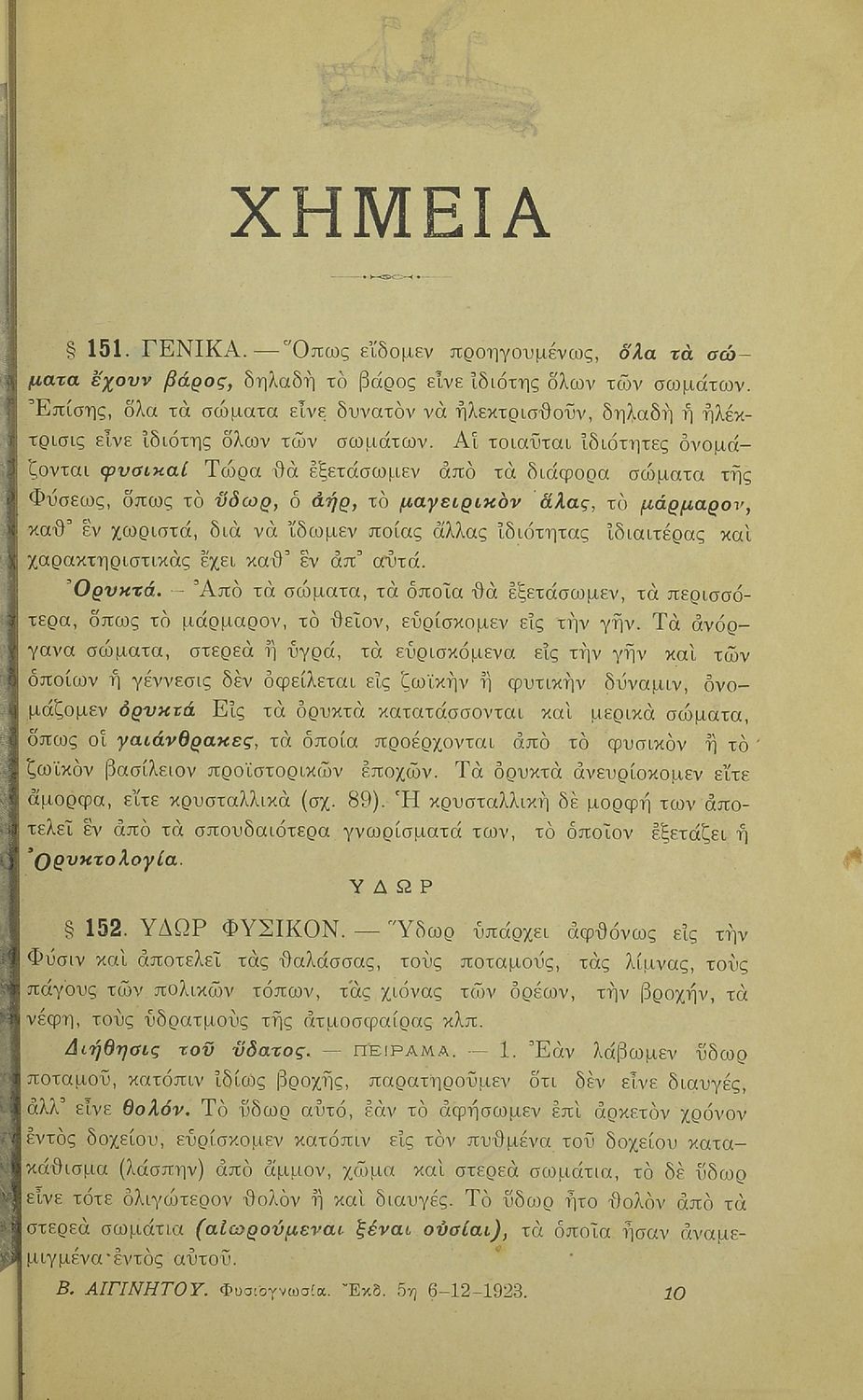 Σχολικό εγχειρίδιο για τις Τάξεις των Ελληνικών Σχολείων και Παρθεναγωγείων για το μάθημα της Φυσικής. Παρέχει βασικές γνώσεις της φυσικής επιστήμης και της χημείας. Αναλύει τις ιδιότητες των σωμάτων, καθώς ...