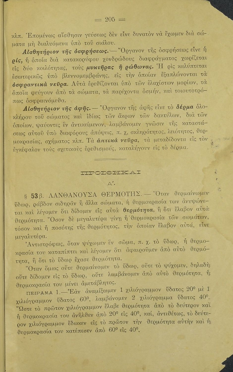 Σχολικό εγχειρίδιο Φυσικής για τα Ελληνικά Σχολεία και Παρθεναγωγεία που εστιάζει στα φαινόμενα της θερμότητας, του ηλεκτρισμού και του μαγνητισμού, τις δυνάμεις και την πίεση.