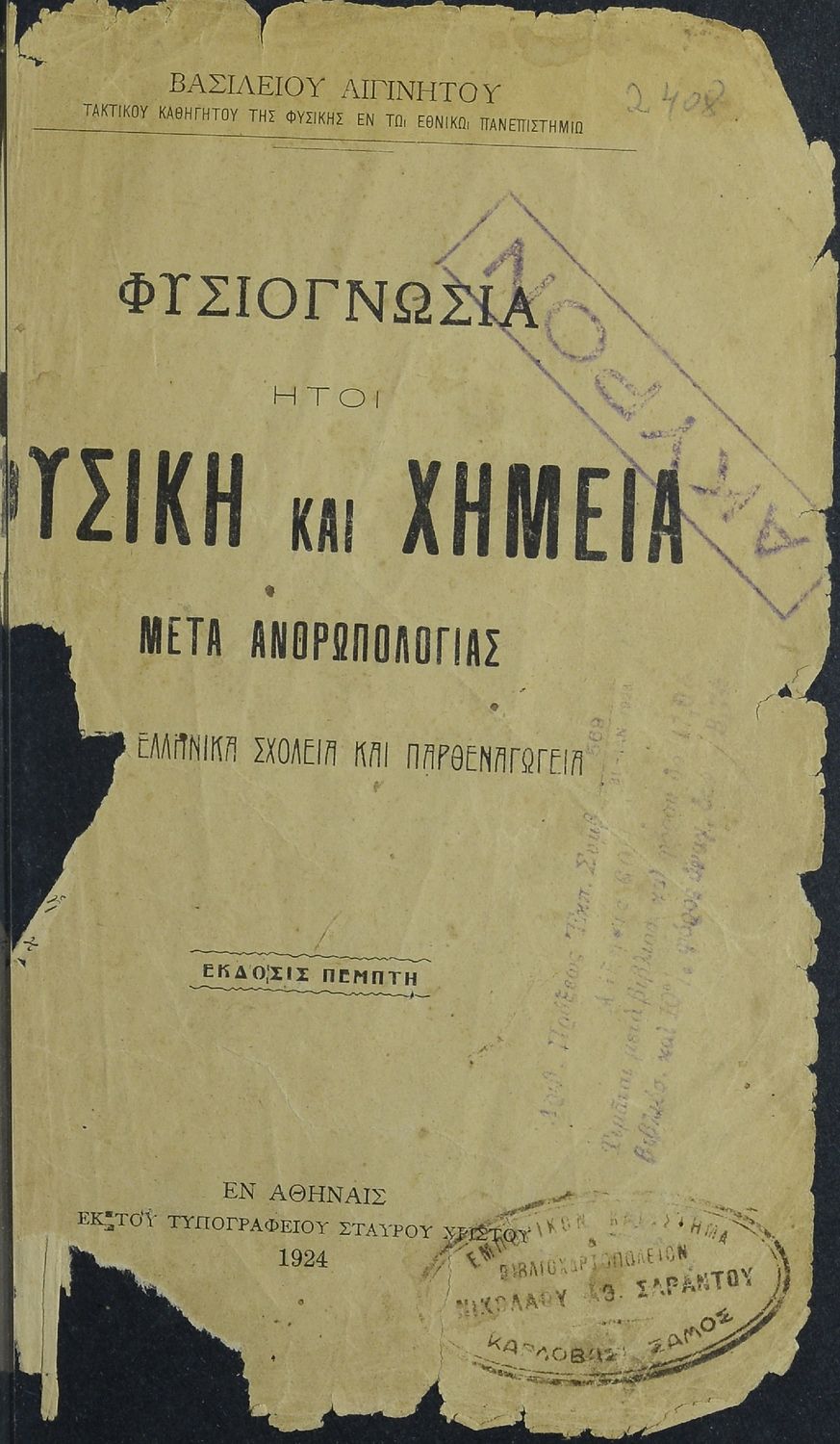 Κωδικός αναγνώρισης: 20-02408 Τίτλος: Φυσιογνωσία ήτοι φυσική και χημεία μετά ανθρωπολογίας διά τα Ελληνικά Σχολεία και Παρθεναγωγεία Συγγραφέας: Βασίλειος Αιγινήτης Μέγεθος και υπόστρωμα: Σχολικό εγχειρίδιο, 21εκ., μαλακό εξώφυλλο, 206 σελίδες. Σκίτσα (ασπρόμαυρα). |