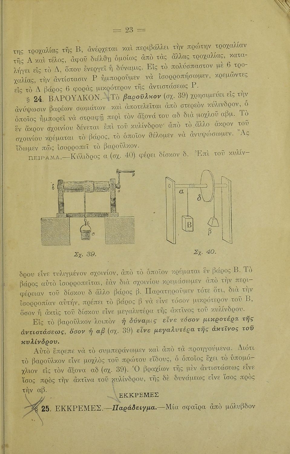 Βαθμίδα εκπαίδευσης: Δευτεροβάθμια Τάξη: Ελληνικό Σχολείο / Παρθεναγωγείο Γλώσσα: Καθαρεύουσα Παρουσίαση περιεχομένου: Σχολικό εγχειρίδιο Φυσικής και Χημείας για τα Ελληνικά Σχολεία και Παρθεναγωγεία που εστιάζει στα φυσικά φαινόμενα όπως ο ηλεκτρισμός και ο μαγνητισμός και τα βασικά στοιχεία της χημείας όπως τα οξέα και τα άλατα. Περιέχει και στοιχεία φυσιολογίας και ανατομίας. |
