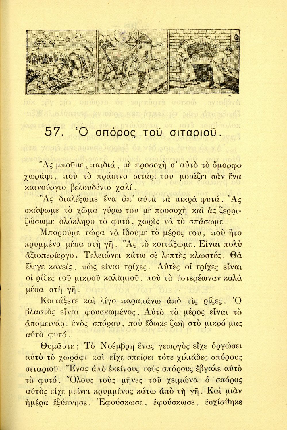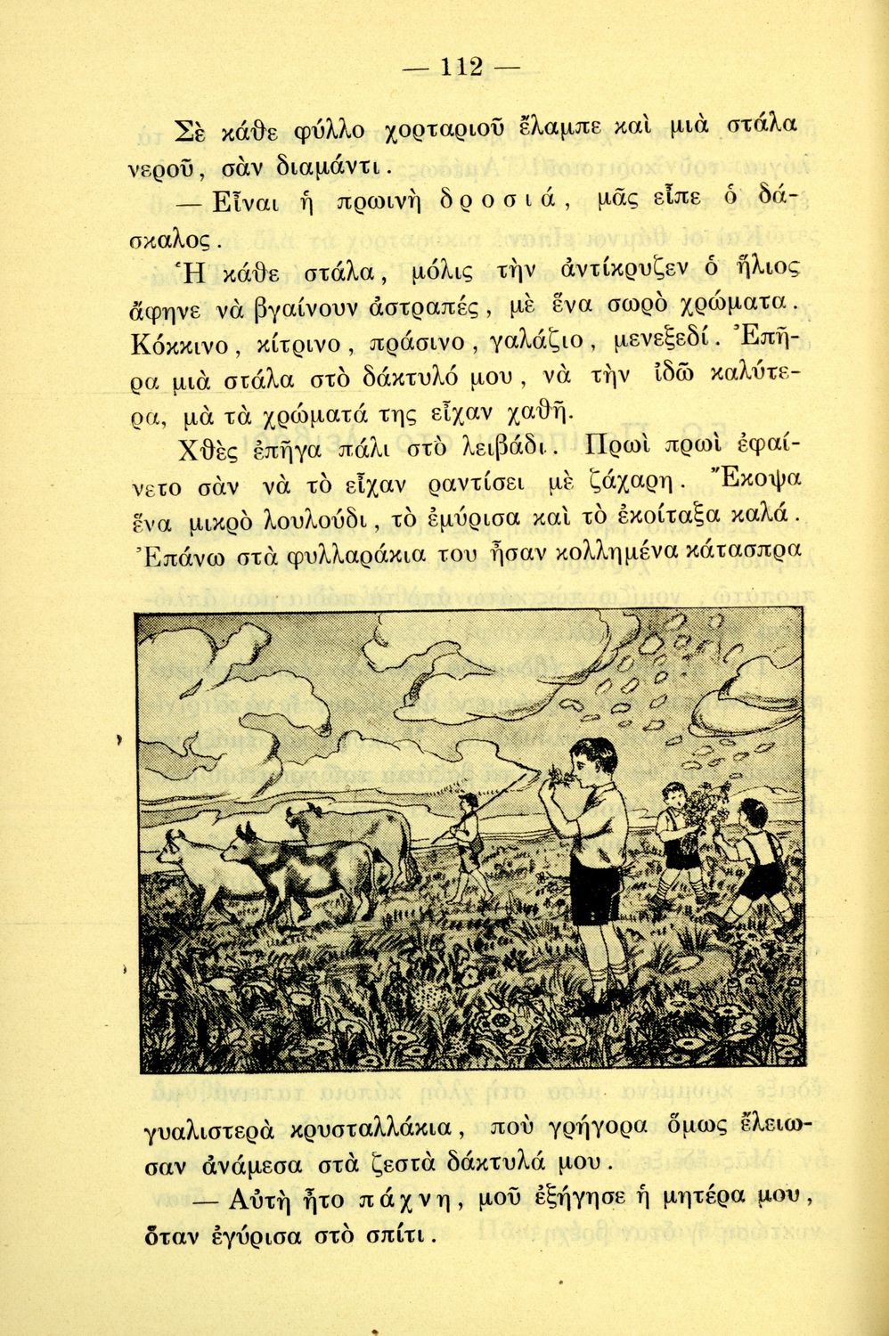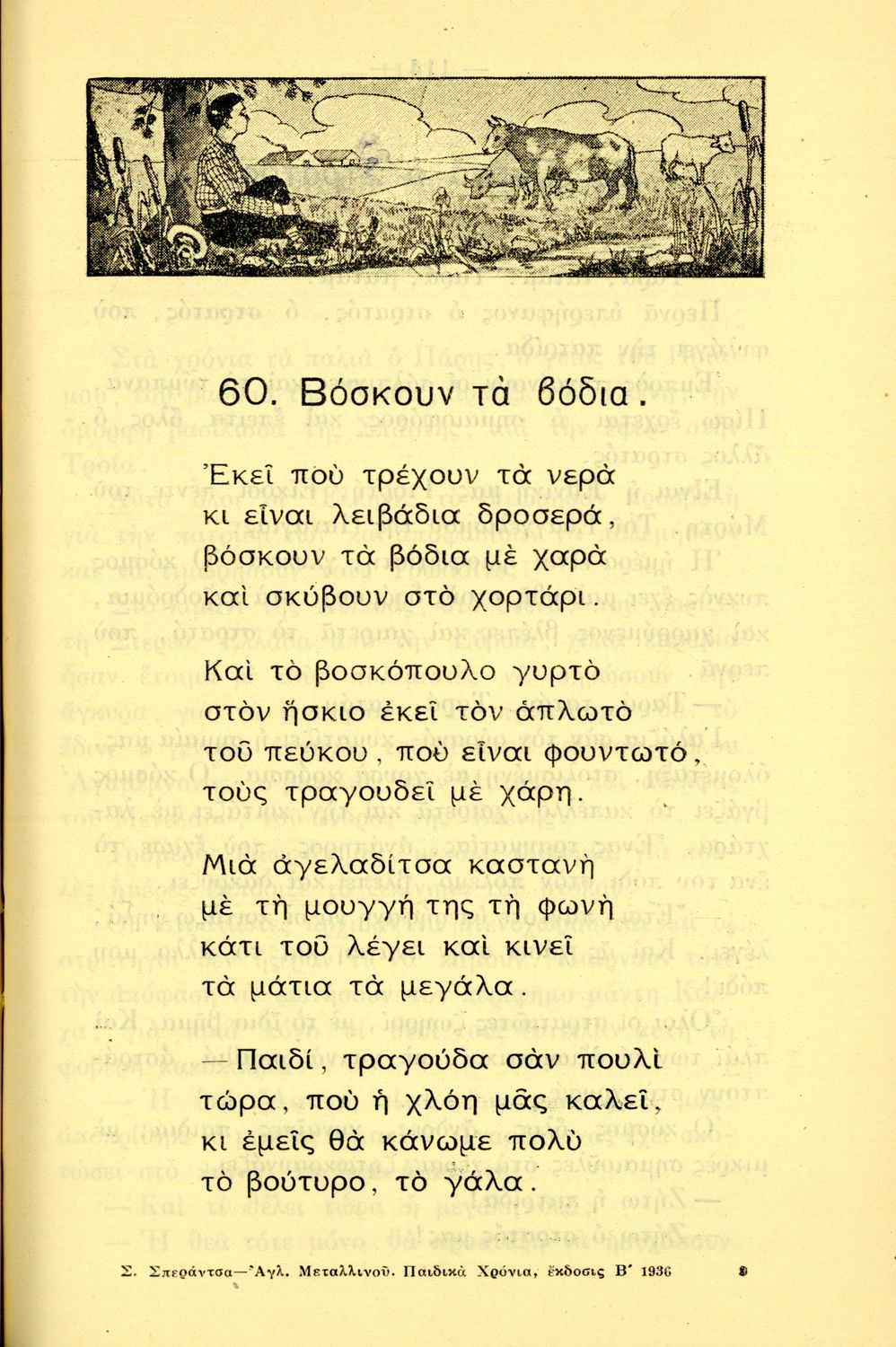 Αναγνωστικό της Γ΄ Δημοτικού που περιλαμβάνει μικρές ιστορίες εθνικιστικού περιεχομένου εμπνευσμένες από την ύπαιθρο, την οικογενειακή και κοινωνική ζωή αλλά και το εθνικό παρελθόν.