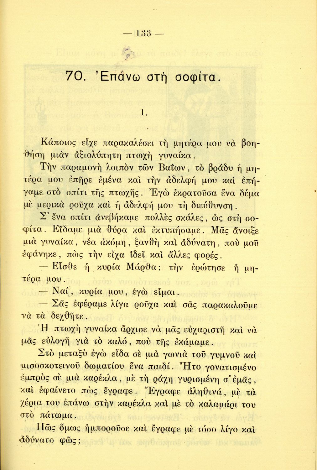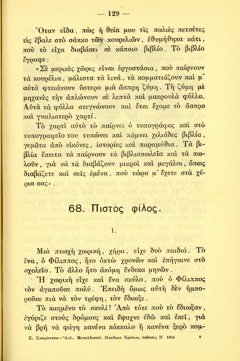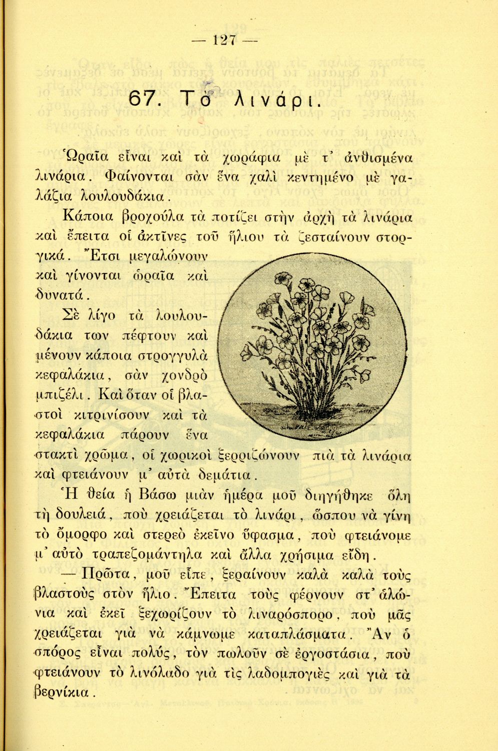 Αναγνωστικό της Γ΄ Δημοτικού που περιλαμβάνει μικρές ιστορίες εθνικιστικού περιεχομένου εμπνευσμένες από την ύπαιθρο, την οικογενειακή και κοινωνική ζωή αλλά και το εθνικό παρελθόν.