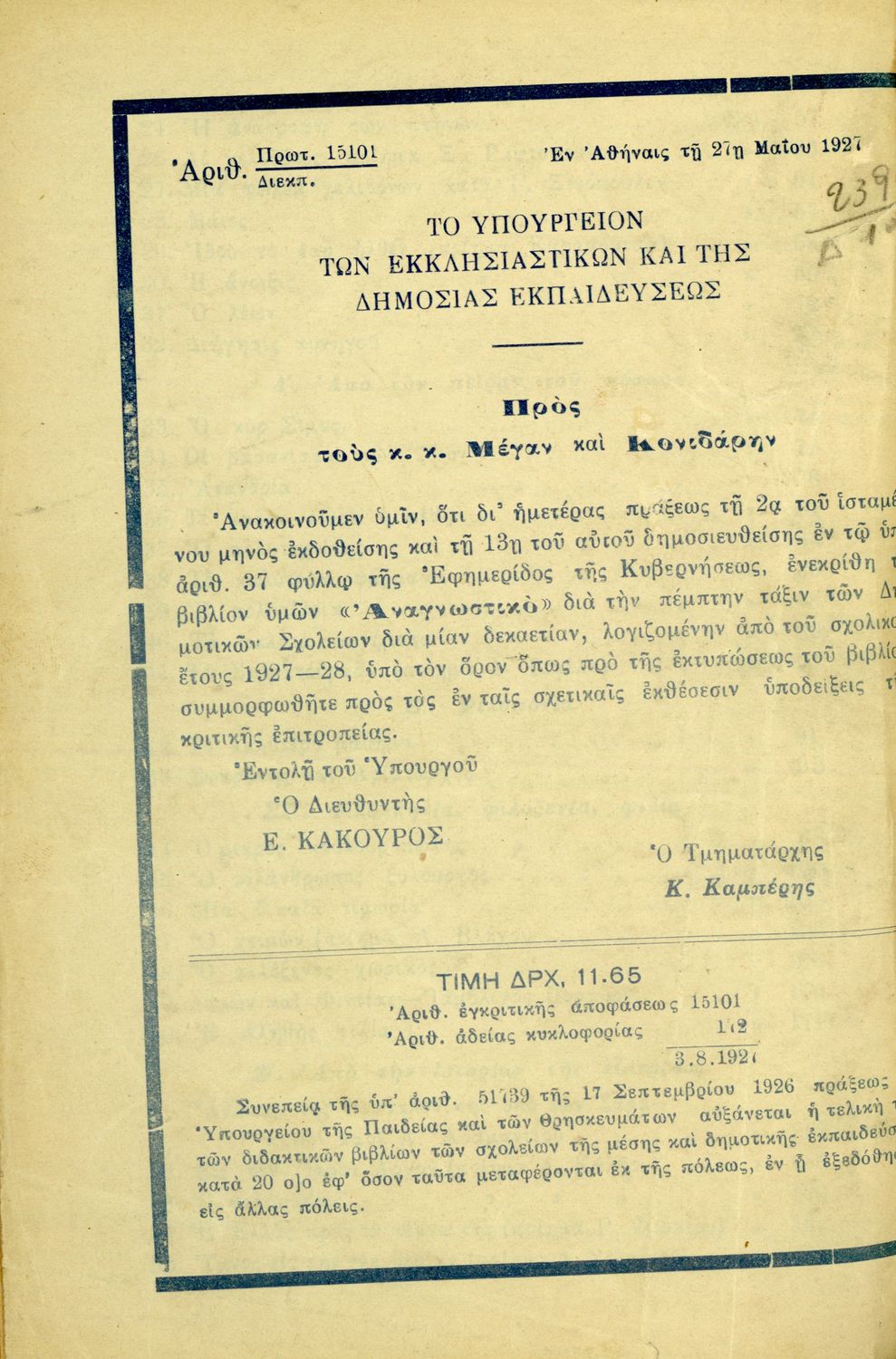 Υπουργική απόφαση / Σύμβαση: 15101/27-5-1927