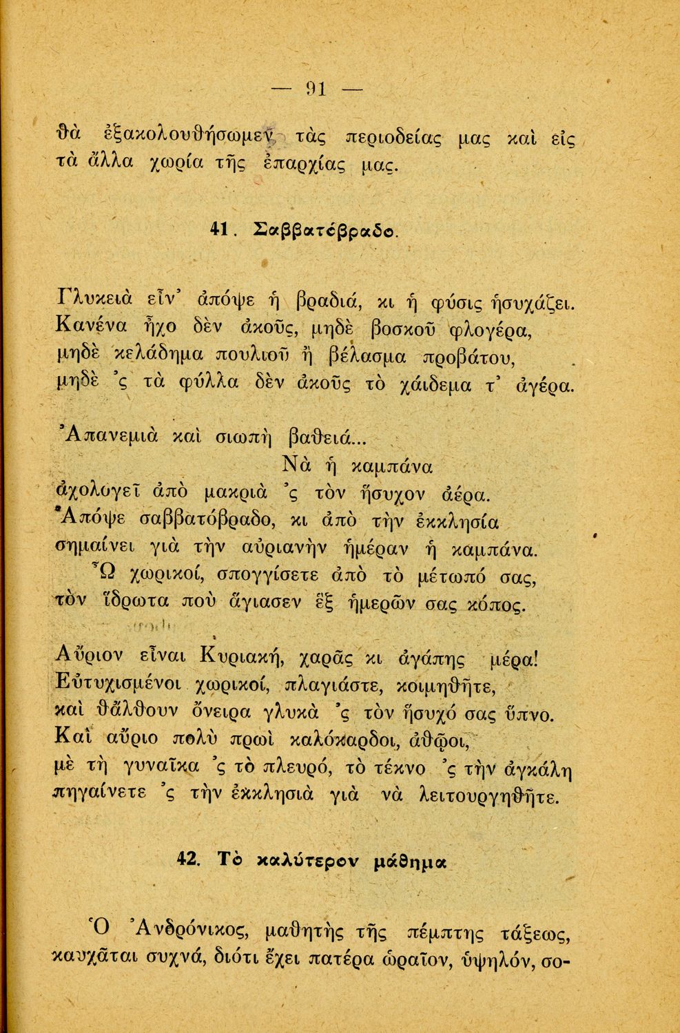 Αναγνωστικό ΣΤ΄ Δημοτικού που περιλαμβάνει πεζά γραμμένα σε καθαρεύουσα και ποιήματα σε δημοτική εμπνευσμένα από την οικογένεια, τη θρησκεία, την πατρίδα, την ελληνική φύση και ύπαιθρο, την αγάπη για τα ζώα, ...