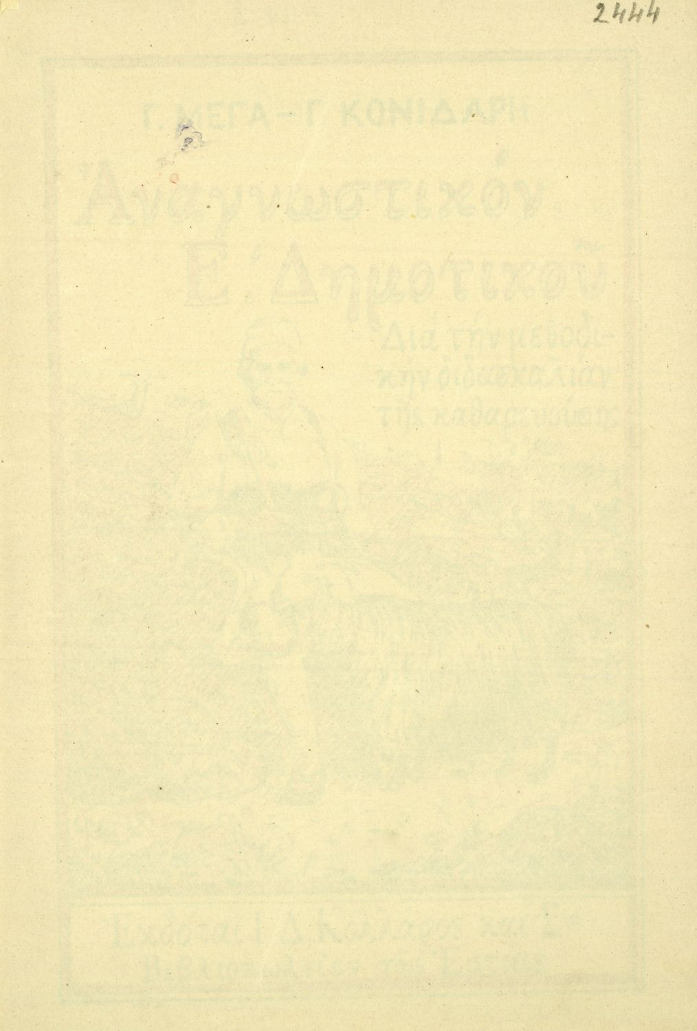 Κωδικός αναγνώρισης: 20-02444 Τίτλος: Αναγνωστικόν Ε΄ Δημοτικού δια την μεθοδικήν διδασκαλίαν της καθαρευούσης Συγγραφέας: Γ. Μέγας, Γ. Κονιδάρης Μέγεθος και υπόστρωμα: Σχολικό εγχειρίδιο, 20εκ., μαλακό εξώφυλλο, 134 σελίδες. Εξώφυλλο (έγχρωμο), σκίτσα (ασπρόμαυρα). |