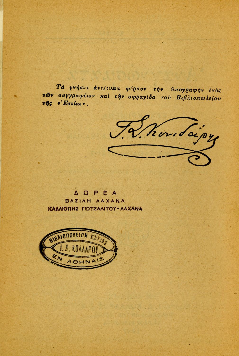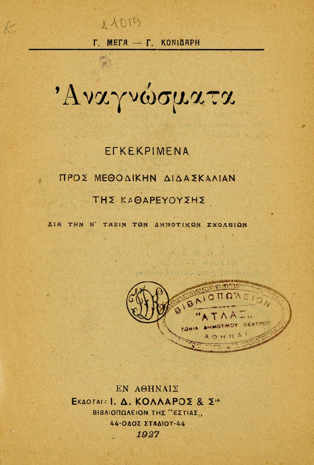 Εκδότης: Ιωάννης Δ. Κολλάρος και ΣΙΑ, Βιβλιοπωλείο της "Εστίας" Έτος έκδοσης: 1927 Τόπος έκδοσης: Αθήνα Υπουργική απόφαση / Σύμβαση: 15101/27-5-1927 Έτος έγκρισης: 1927 |