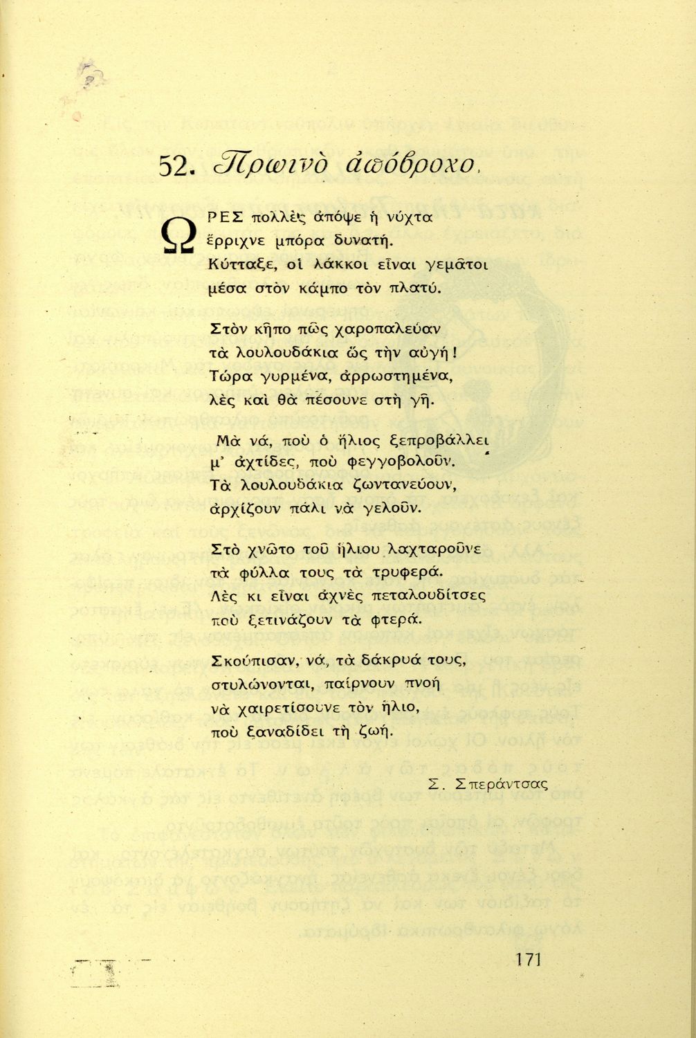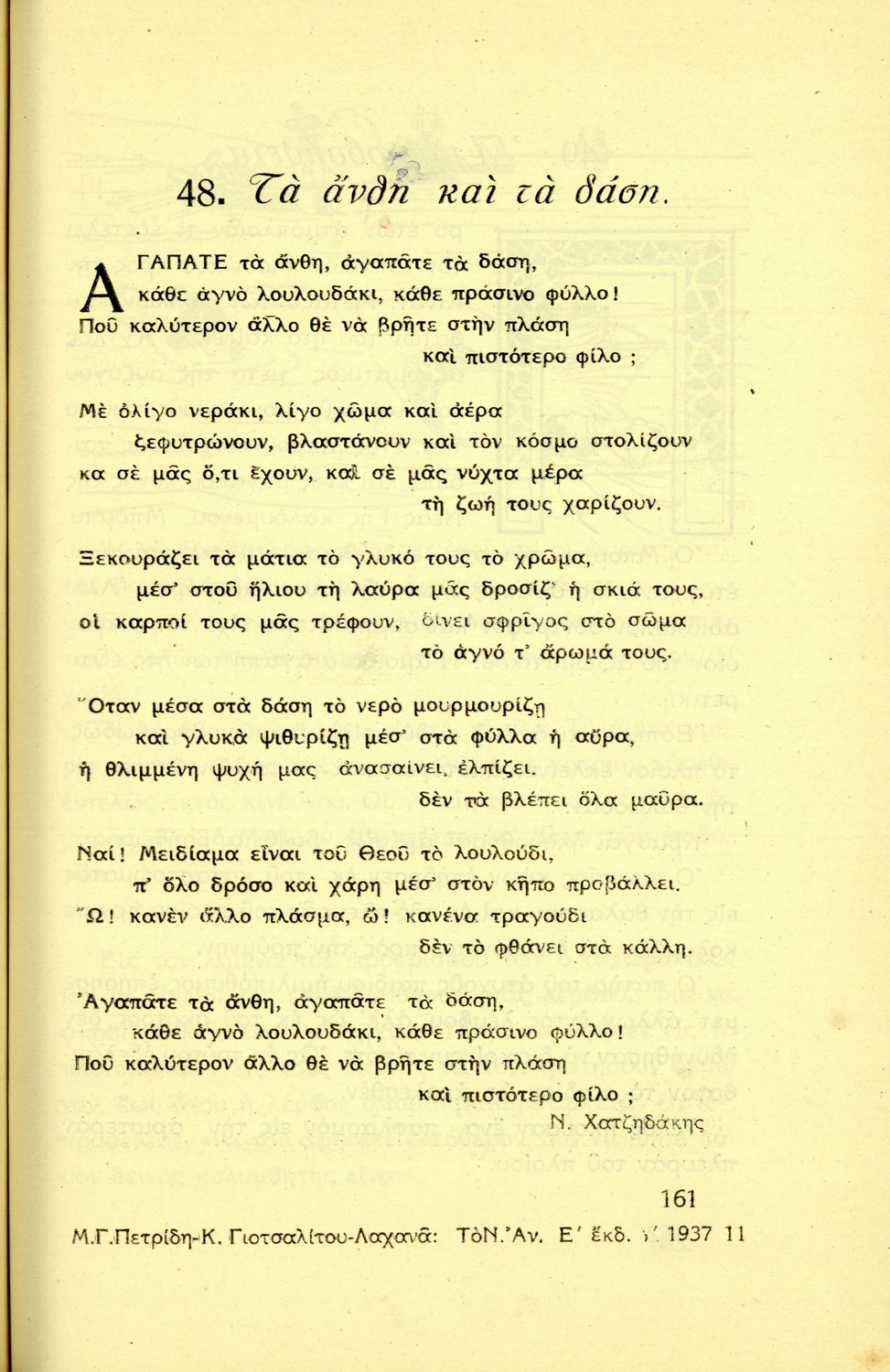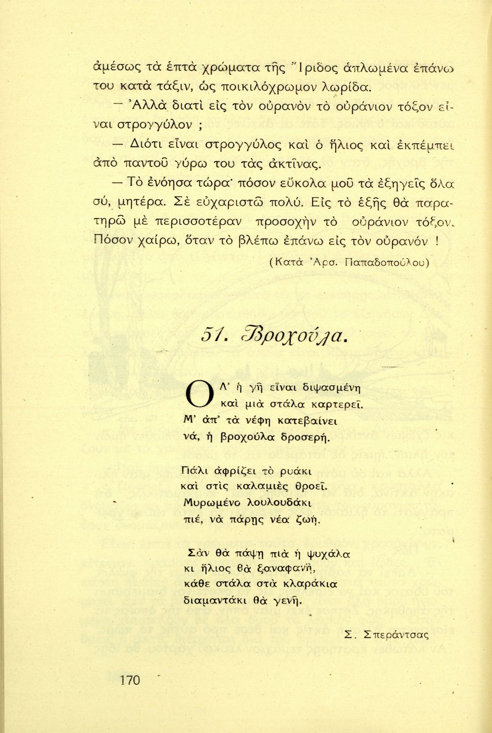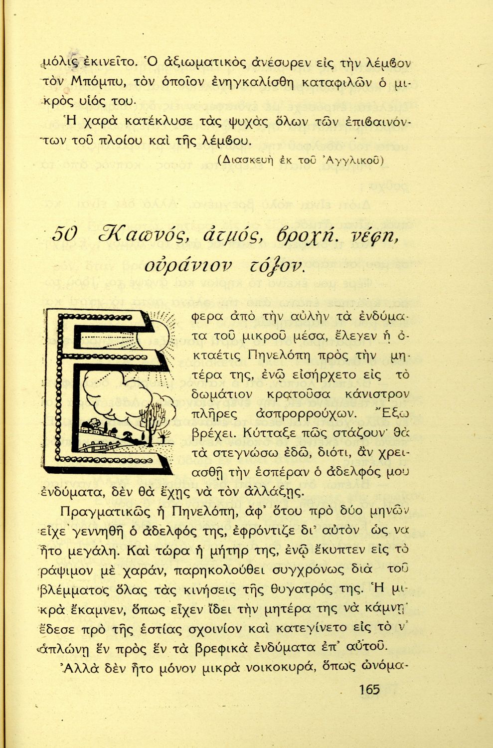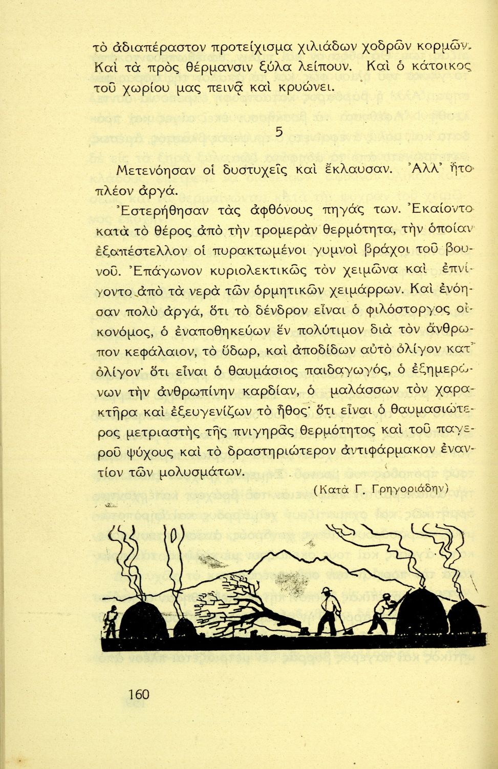 Αναγνωστικό Ε΄ Δημοτικού που περιλαμβάνει πεζογραφήματα εμπνευσμένα από την ελληνική φύση, την αγροτική ζωή και από το τρίπτυχο "Πατρίς- θρησκεία- οικογένεια".
