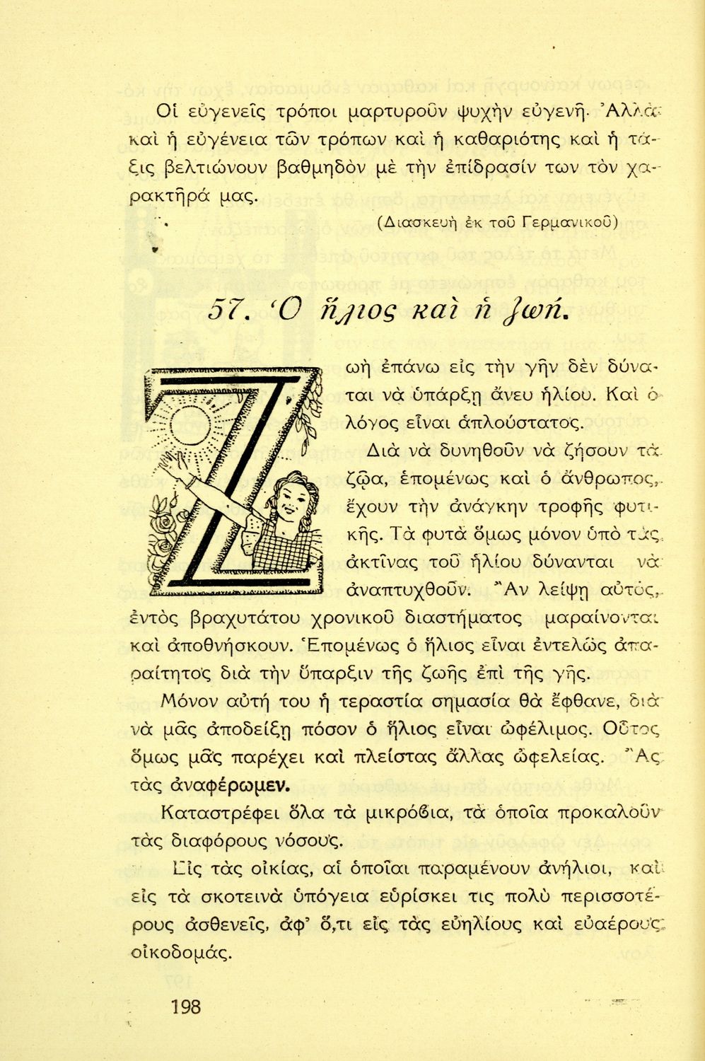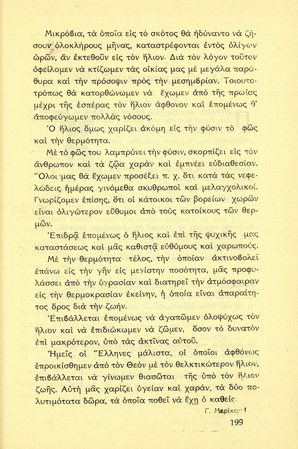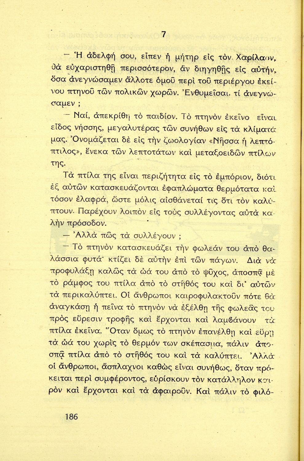 Αναγνωστικό Ε΄ Δημοτικού που περιλαμβάνει πεζογραφήματα εμπνευσμένα από την ελληνική φύση, την αγροτική ζωή και από το τρίπτυχο "Πατρίς- θρησκεία- οικογένεια".