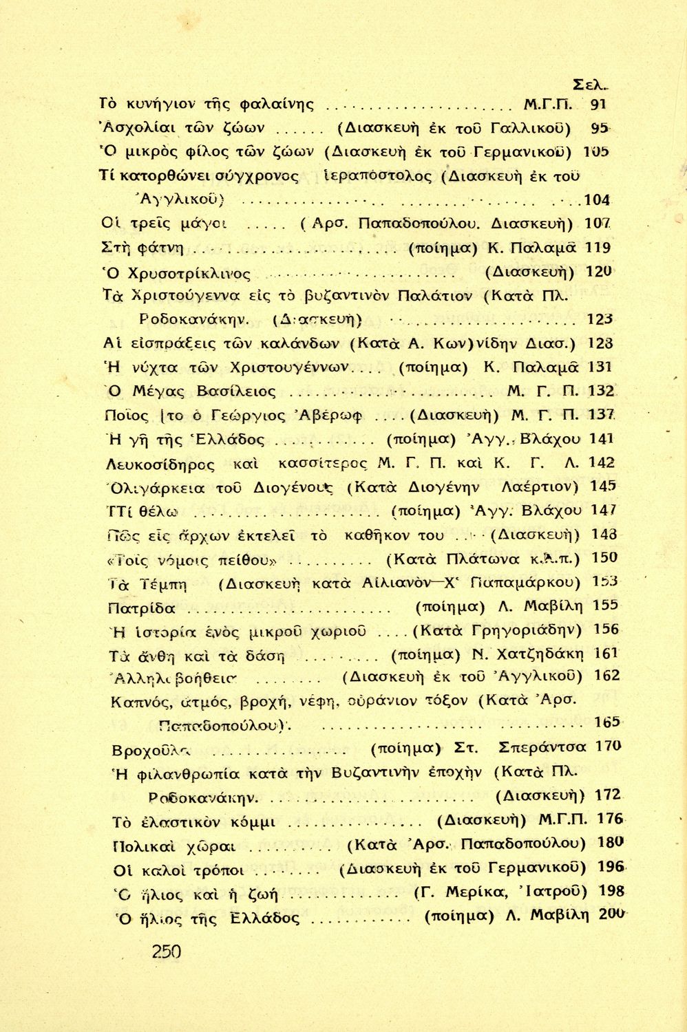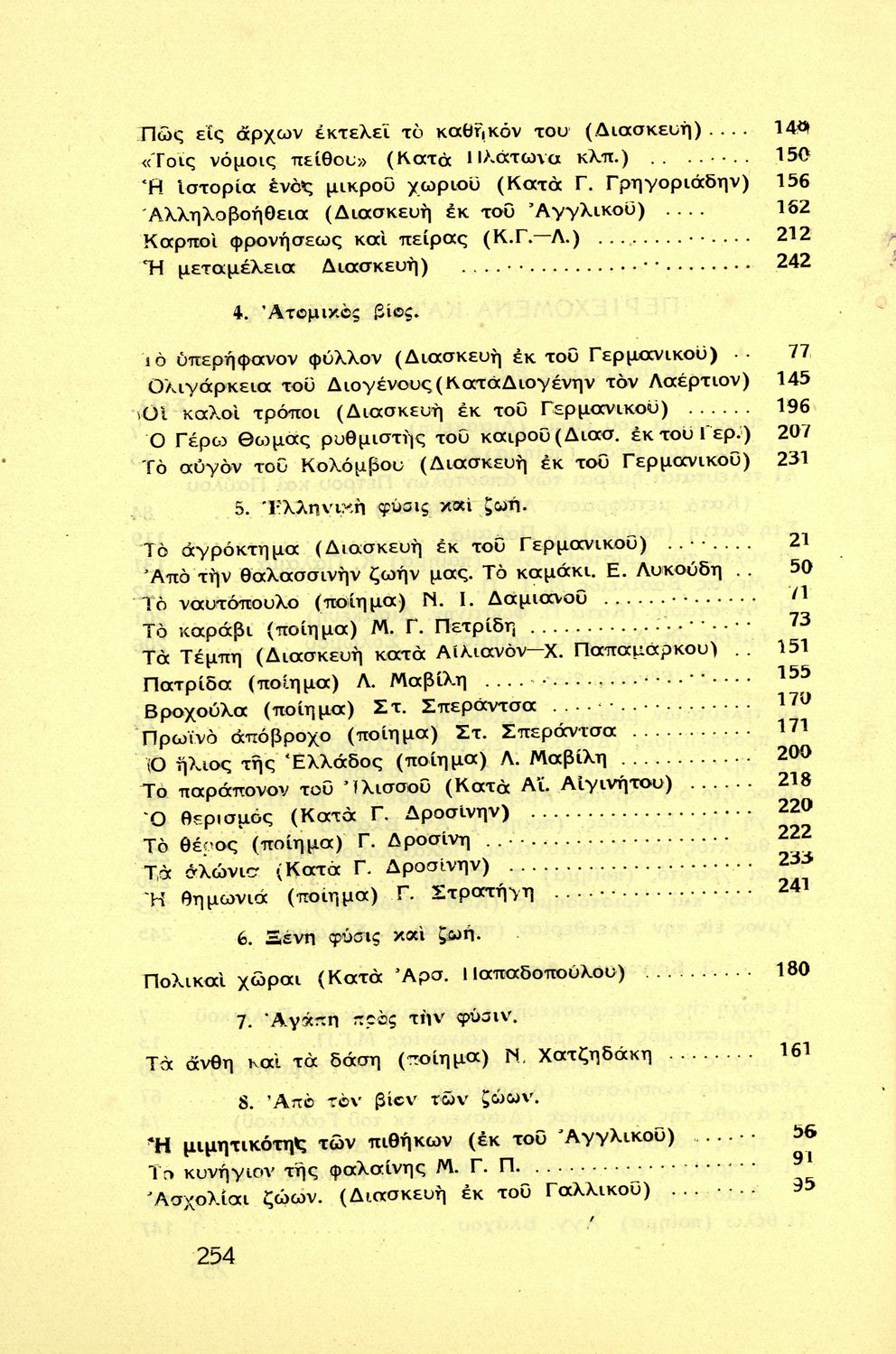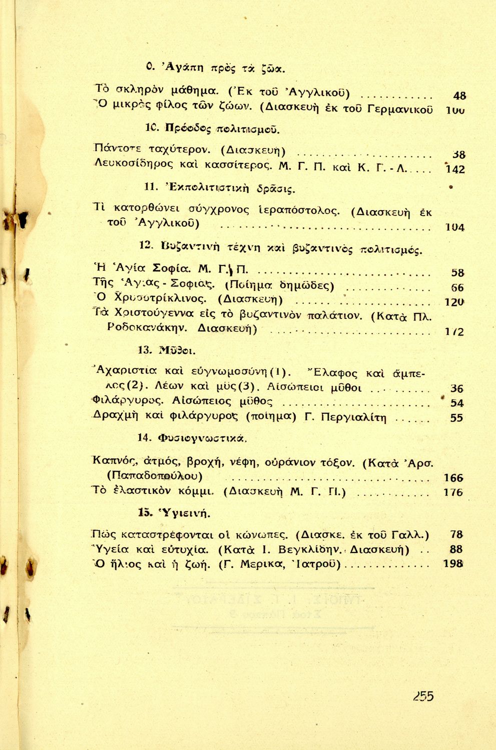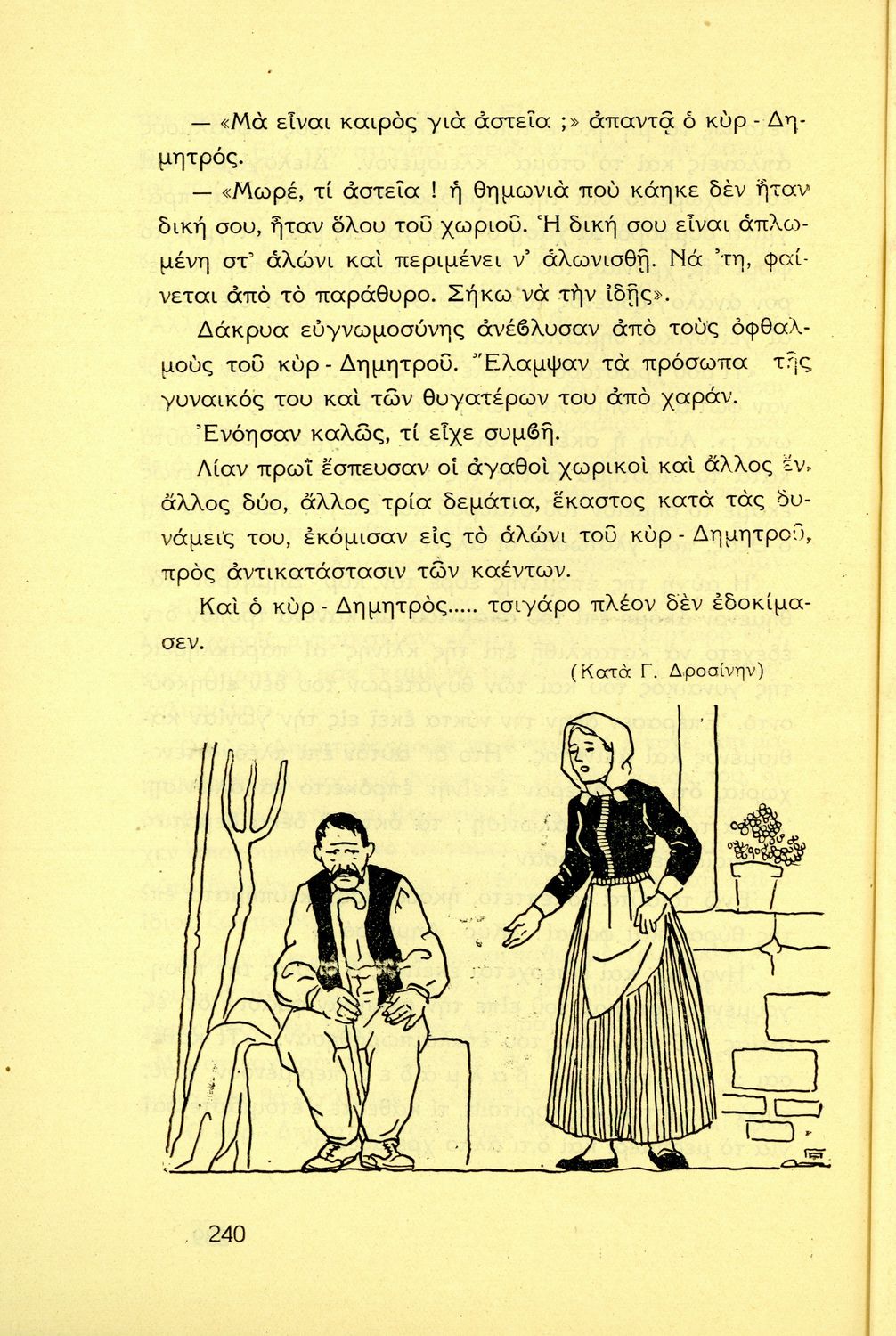 Αναγνωστικό Ε΄ Δημοτικού που περιλαμβάνει πεζογραφήματα εμπνευσμένα από την ελληνική φύση, την αγροτική ζωή και από το τρίπτυχο "Πατρίς- θρησκεία- οικογένεια".